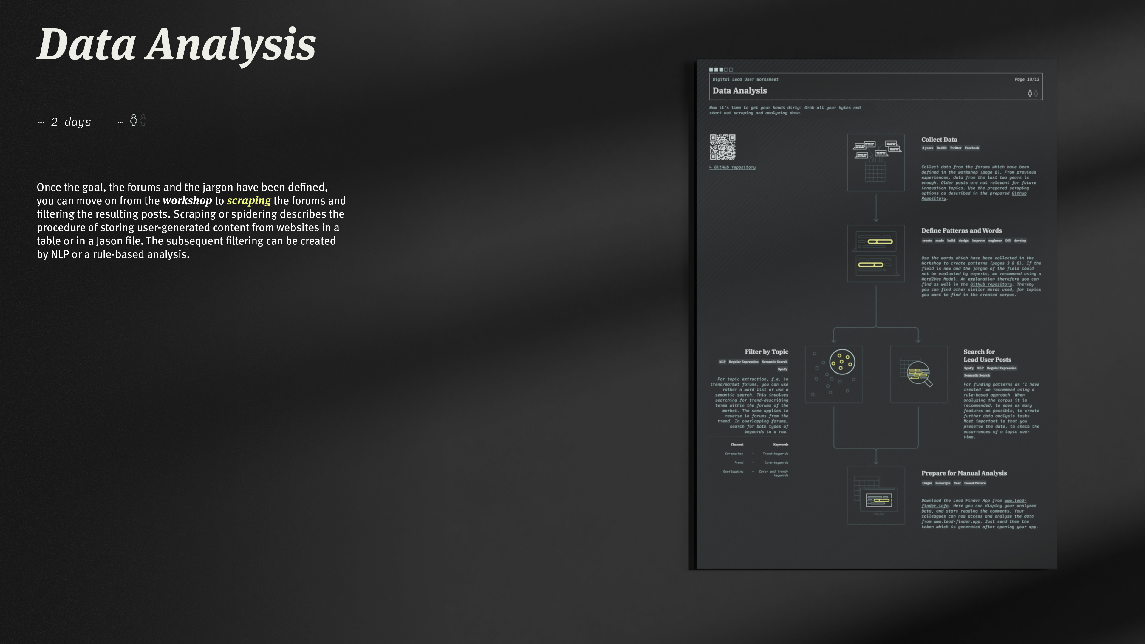 In the digital lead user analysis, online forums are searched and filtered for innovative user posts with the help of natural language processing. On the one hand, companies can use these innovations as inspiration, and on the other hand, needs can be identified that lead to new innovation projects. Digital lead user analysis saves an enormous amount of time compared to conventional lead user identification. This method was made applicable and repeatable in a process for others. A process with worksheets, code and an app was developed to find digital lead users online (quickly).