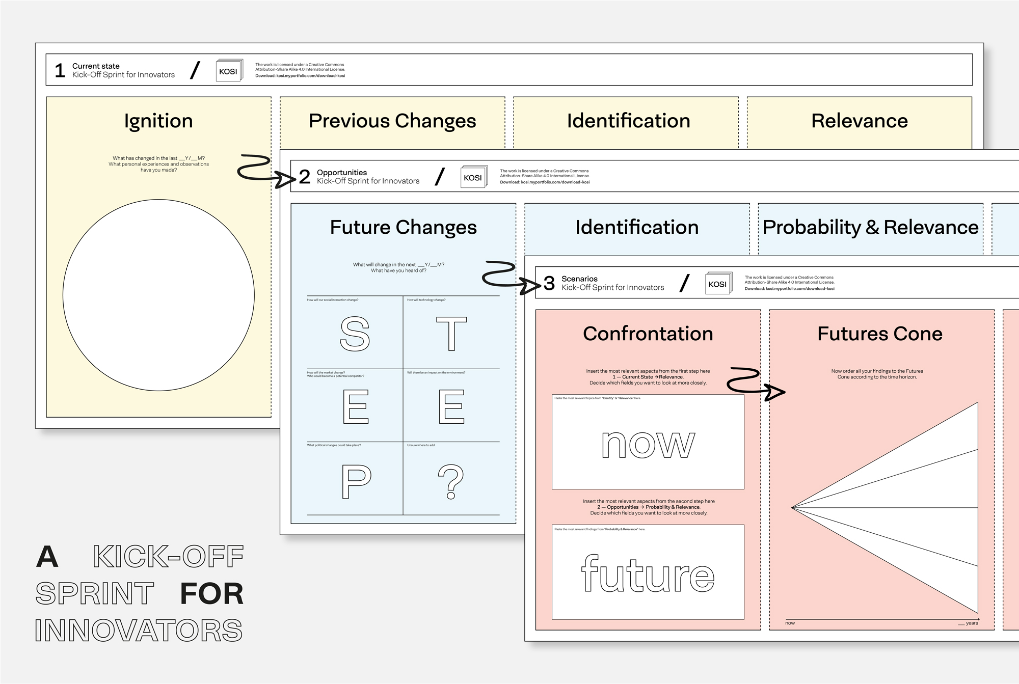 The result is KOSI. The “Kick-Off Sprint for Innovators“ is a sprint for inter- and multidisciplinary teams in companies, agencies or institutions, freely accessible to everyone. The goal is a productive kick-off for the generation of ideas and evaluation of the innovation process. Participants are encouraged to put forth existing implicit and explicit knowledge, needs and their assessments of the current state and future changes without a large time and cost factor. Thus, this information can be discussed, ordered and analysed together.
