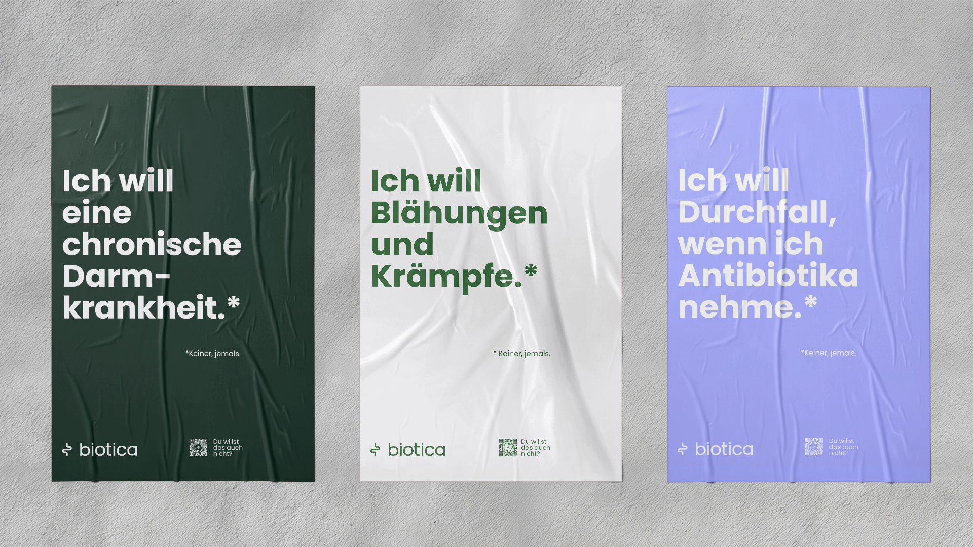 Biotica denkt Gesundheit weiter: Neben dem physischen Produkt schaffen wir über Social Media und eine begleitende Kampagne Sichtbarkeit für ein oft unterschätztes Thema. Mit bewusst provokanten Aussagen im öffentlichen Raum regen wir zum Nachdenken an und holen die Darmgesundheit aus der Tabuzone.