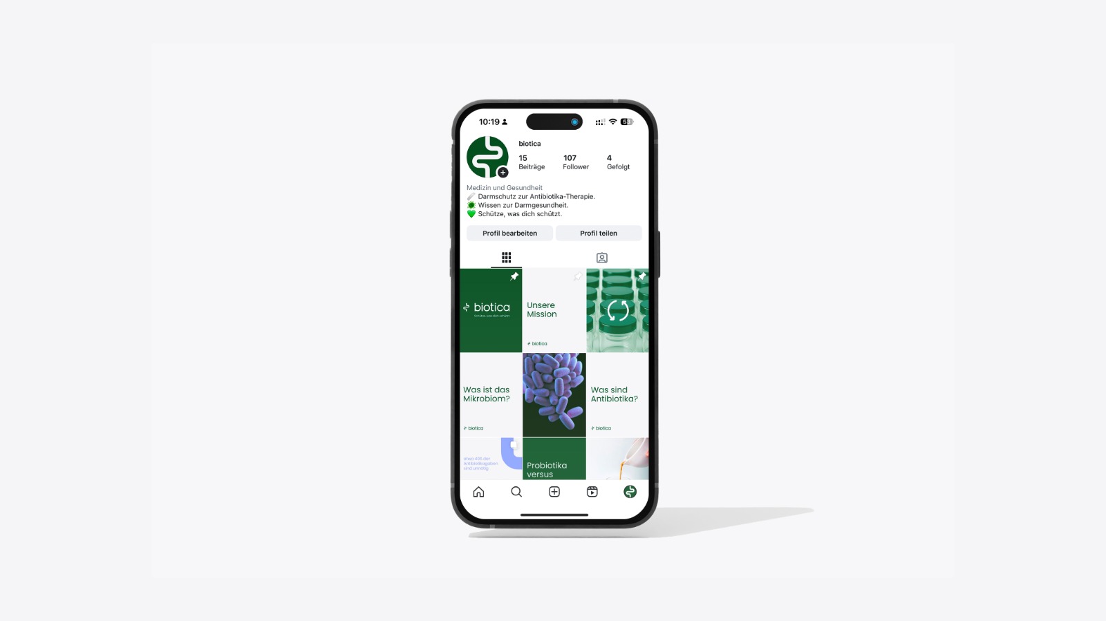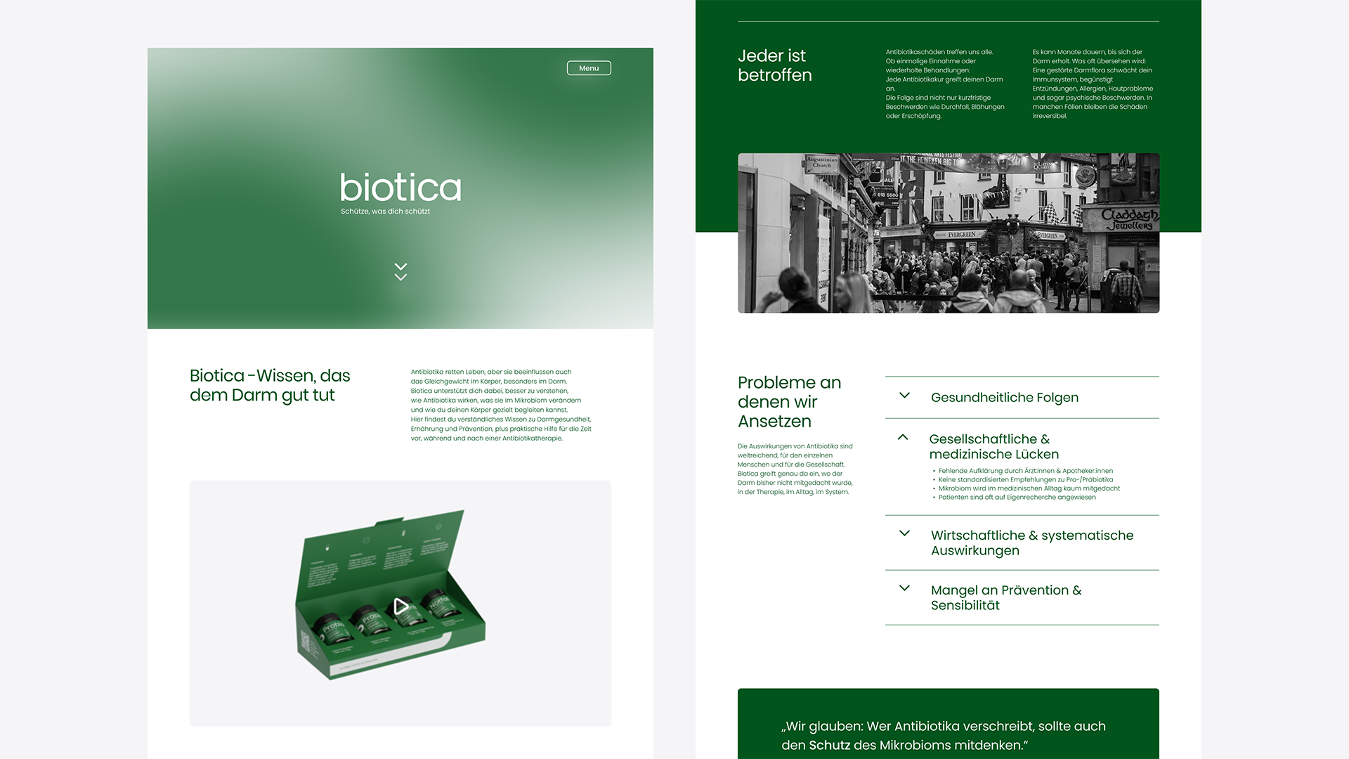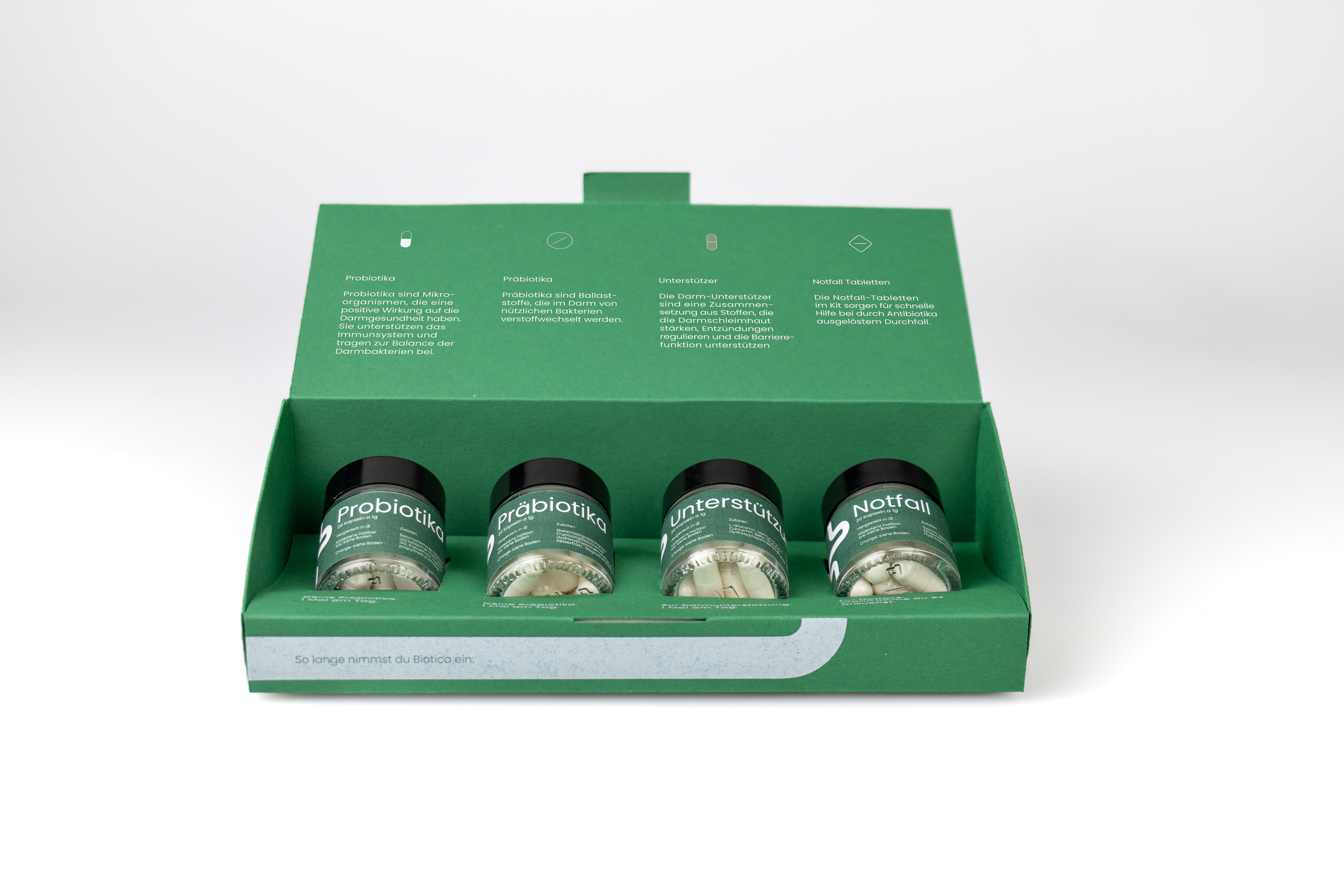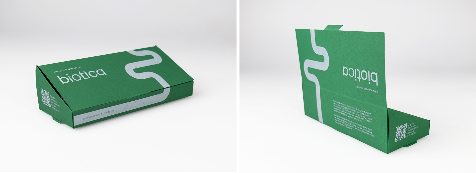 Hier setzt Biotica an: ein ganzheitliches Konzept, das Menschen während und nach einer Antibiotikatherapie begleitet. Das Biotica-Kit enthält eine individuell abgestimmte Kombination aus Probiotika, Präbiotika, einem Darmschutzmodul sowie einem Notfallmodul bei akuten Beschwerden. Über einen QR-Code auf dem Kit gelangen Nutzer:innen direkt zur biotica Website, die verständliches Wissen, praktische Tipps und klare Empfehlungen rund um Darmgesundheit, Ernährung und Prävention bietet.