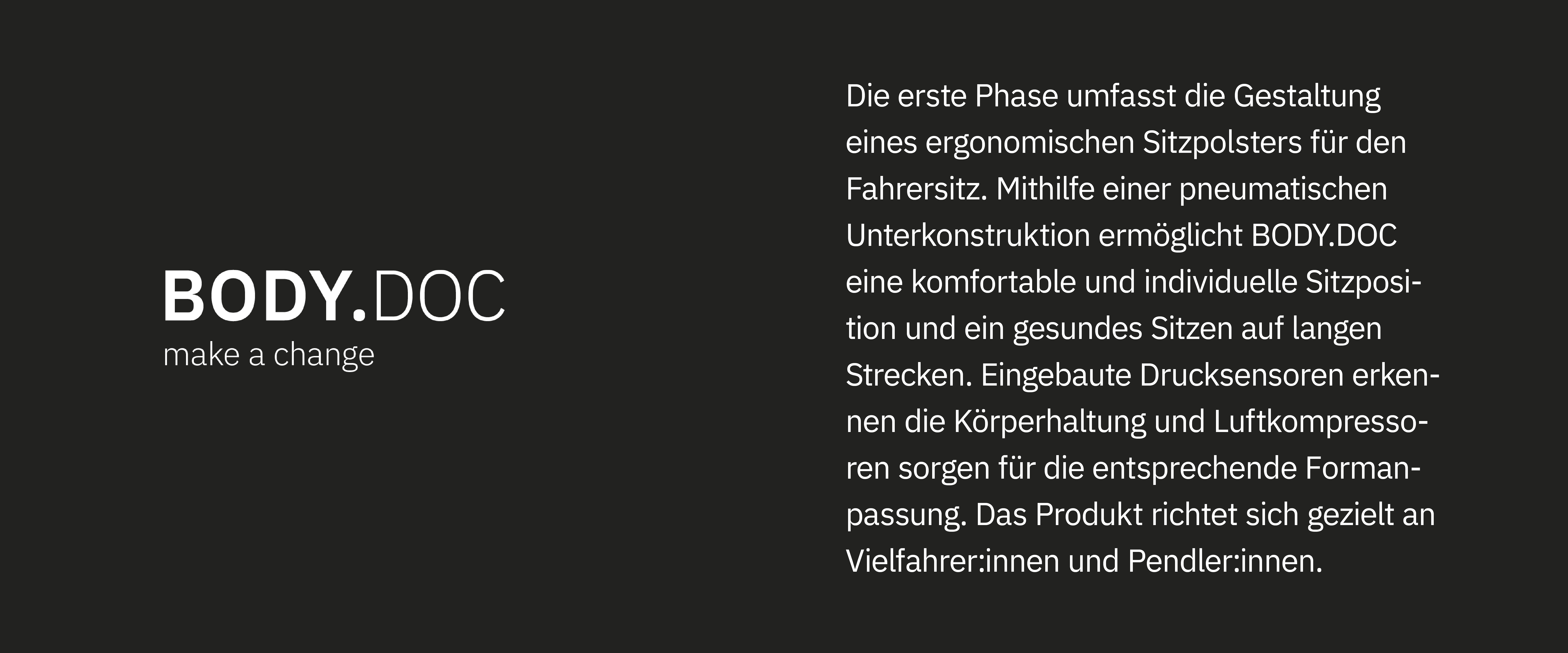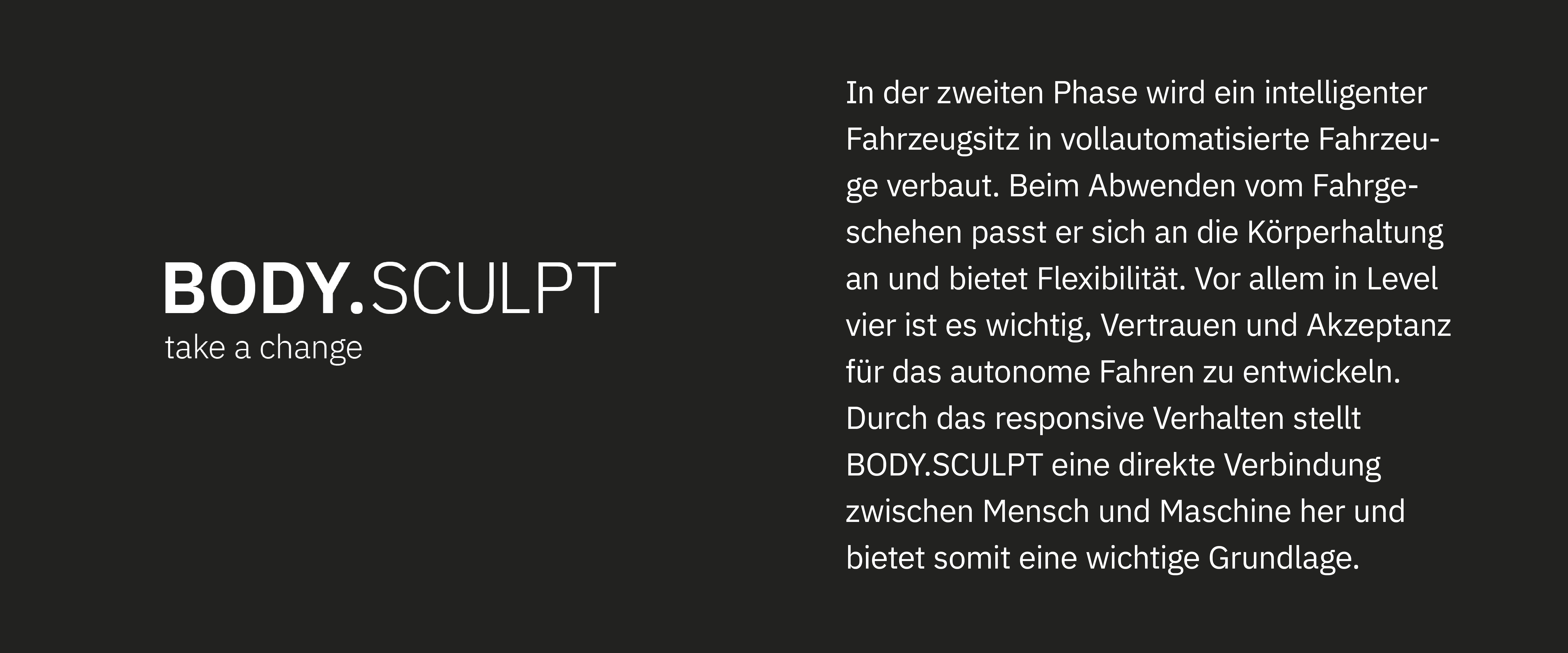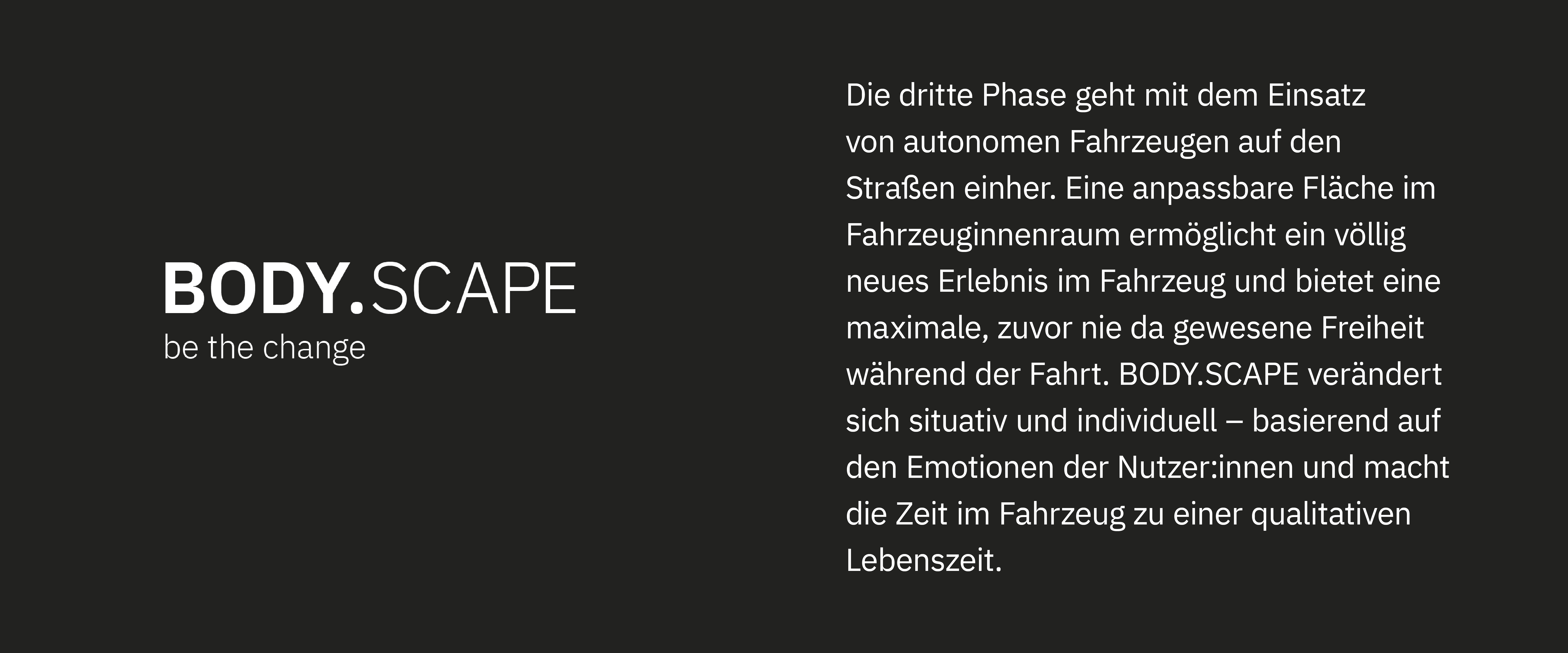 Mit BODY verfolgen wir das Ziel, die Zeit im Fahrzeug in eine qualitative Lebenszeit zu verwandeln. Mithilfe von pneumatischen Strukturen sind drei Produkte entstanden, die sich am Level der Fahrzeugautomatisierung orientieren. BODY.SCAPE beschreibt eine visionäre Form der Innenraumgestaltung in autonomen Fahrzeugen der Zukunft. Basierend auf den Emotionen der Nutzer:innen passt sich der Fahrzeuginnenraum individuell und situativ auf deren Bedürfnisse an und ermöglicht so eine maximale Freiheit im Fahrzeug.