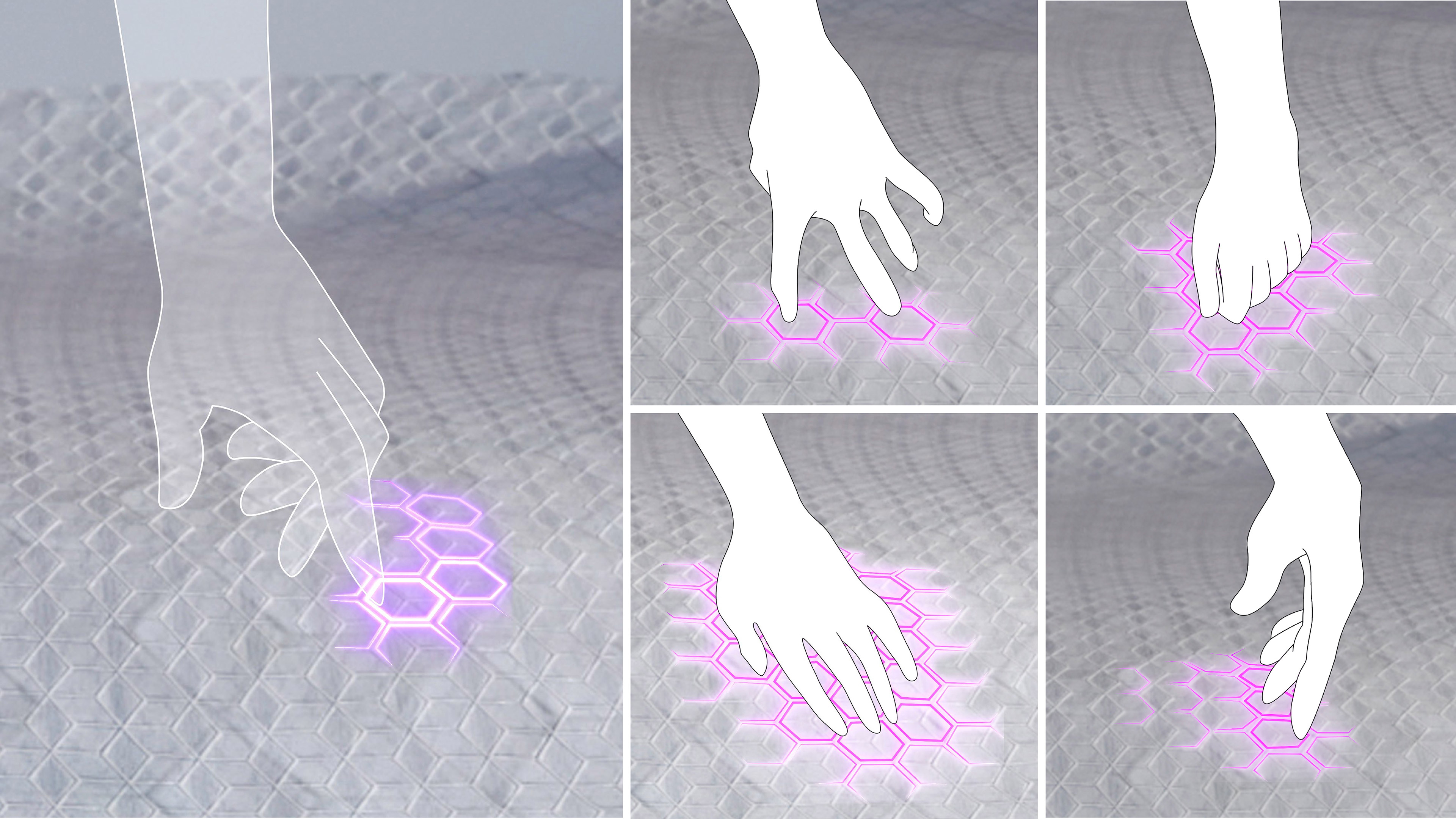 Da sich der Innenraum erst mit dem Betreten einer Person auf die Emotionen anpasst, ist zu Beginn eine neutrale Basis wichtig. Aus diesem Grund haben wir eine Textur gewählt, die auf einer einfachen Rautenform beruht. Die einzelnen Segmente des Textils können mithilfe von intelligenten Materialien situativ geöffnet und geschlossen werden. So lassen sich beispielsweise individuelle Lichtstimmungen erzeugen. Unterhalb des Textils befinden sich Bakterienstränge, welche die Luft im Fahrzeuginnenraum selbstständig reinigen können.