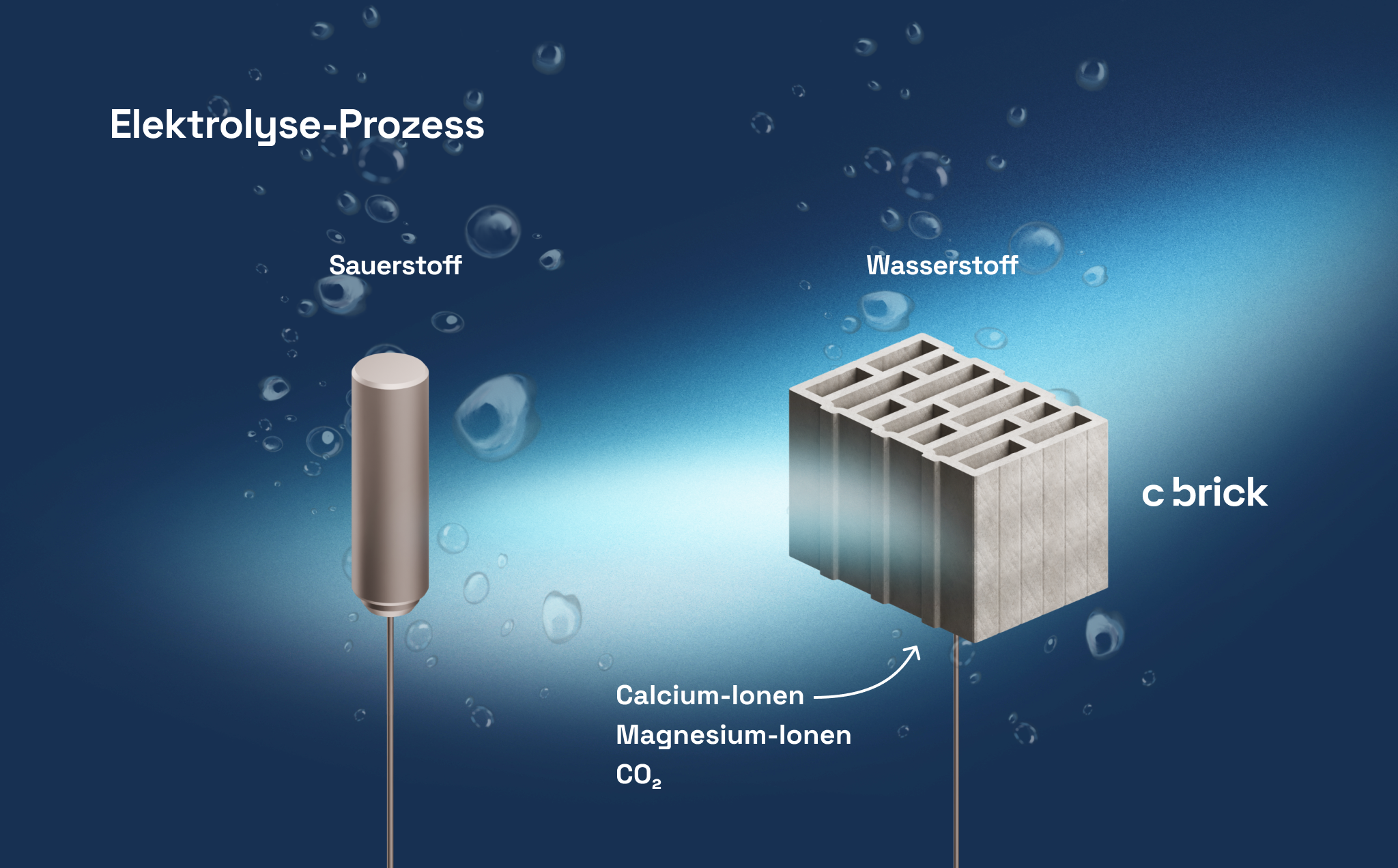 Bei der Elektrolyse in Meerwasser entstehen Sauerstoff, Wasserstoff, und an der Kathode ein Gestein aus im Meerwasser gelösten Calcium-Ionen, Magnesium-Ionen und CO2.