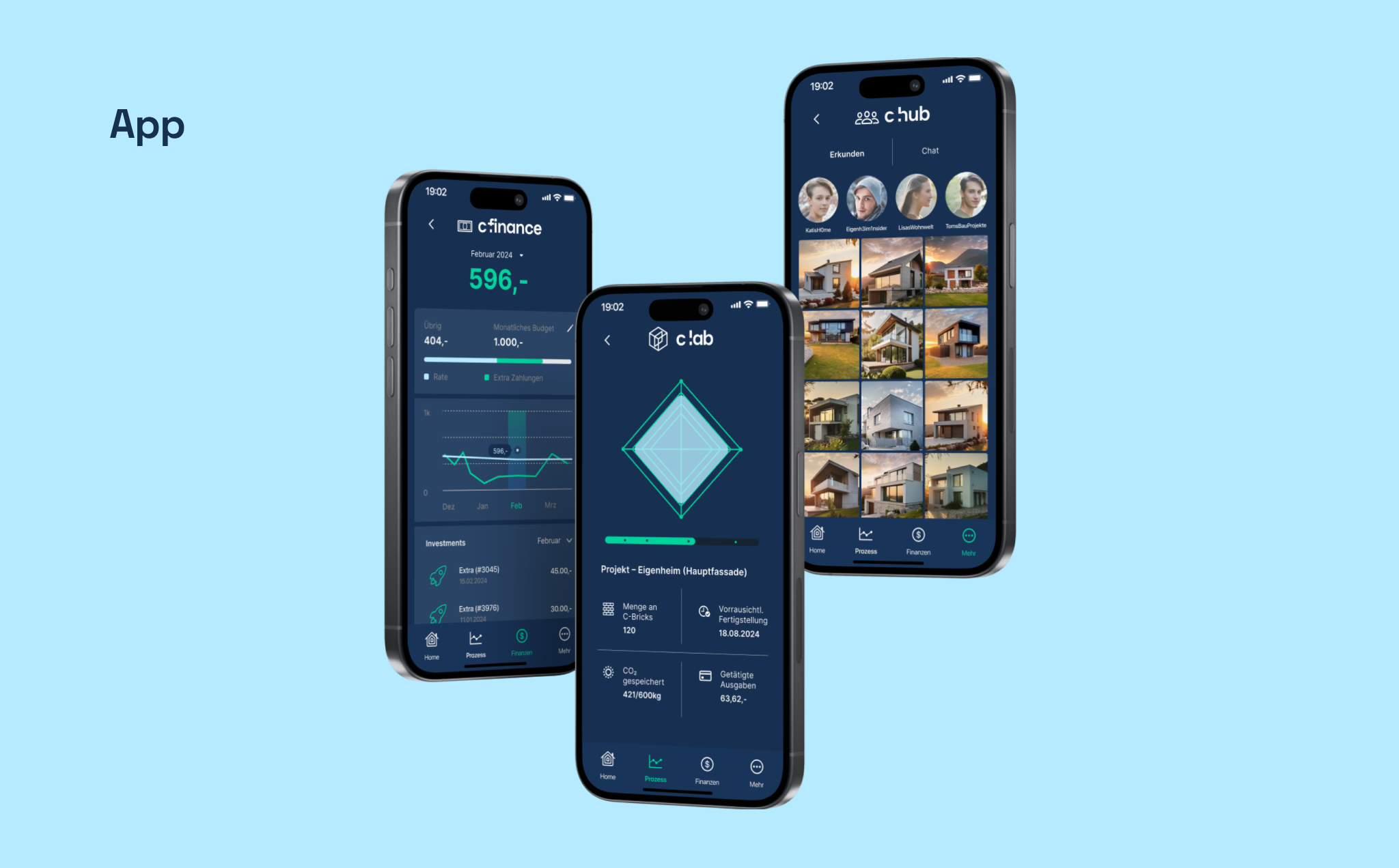 Unsere Kund:innen investieren hohe Summen in unser Unternehmen und müssen lange – mindestens ein Jahr – auf ihr Produkt warten. Deshalb ist es uns ein besonders großes Anliegen, den gesamten Prozess möglichst transparent zu gestalten. In unserer App ist es darum möglich, den Stand der Finanzen zu überblicken sowie das Wachstum der c-bricks live zu verfolgen. Außerdem besteht hier Zugang zu unserer Community. In dieser können sich Privatpersonen mit Bauvorhaben und Nachhaltigkeitsinteresse in regionalen Gruppen vernetzen und Erfahrungen austauschen. Zusätzlich erhalten unsere Kund:innen die Möglichkeit, an Veranstaltungen mit Experten-Vorträgen teilzunehmen, um sich möglichst umfassend für ihr Bauvorhaben zu informieren.
