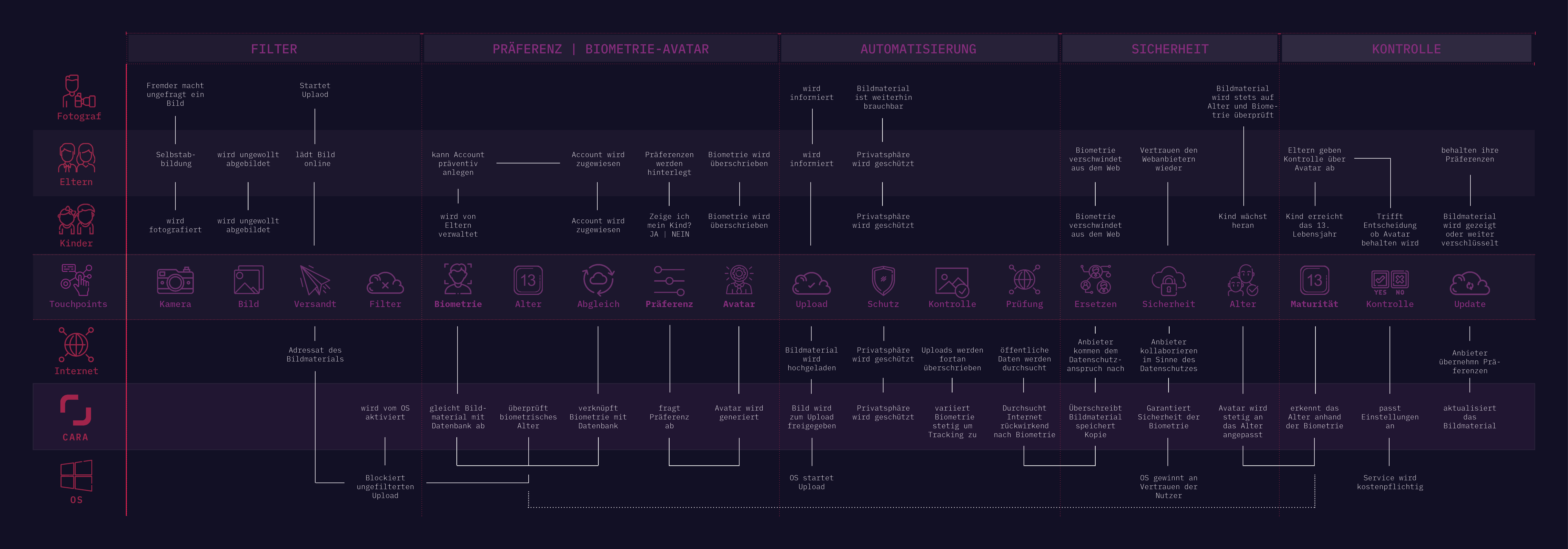 Als Dienstleistungskonzept bedient sich CARA Leistungsfähiger Gesichtserkennungs-Software, welche im großen Stil Bildmaterial auf Biometrie überprüft. Auf Wunsch können Gesichter auf ungewollt erstelltem Bildmaterial, generativ manipuliert werden, um die Identität des Nutzers zu schützen. Nutzer können auf der CARA-Onlineplattform optische Präferenzen hinterlegen. CARA wandelt dann fremdes Bildmaterial automatisch ab und generiert einen biometrischen Avatar, entsprechend den Wünschen des Nutzers. Ziel dabei ist die konsequente Anonymisierung der sogenannten “facial biometrics”. CARA soll als Instrument der Anonymisierung den Nutzer dabei unterstützen sich gegen unfreiwilliges tracking der biometrischen Daten zu wehren und beugt gleichzeitig der Erstellung von vielseitigen digitalen Persönlichkeitsprofilen vor, welche durch Konzerne und Regierungen missbraucht werden können. Als Projektergebnis von “Reversed Biometrics”, steht CARA für Selbstbestimmung im Internet und ermöglicht dem Betrachter, individuell Standpunkt zur digitalen Bilderkennung zu beziehen.