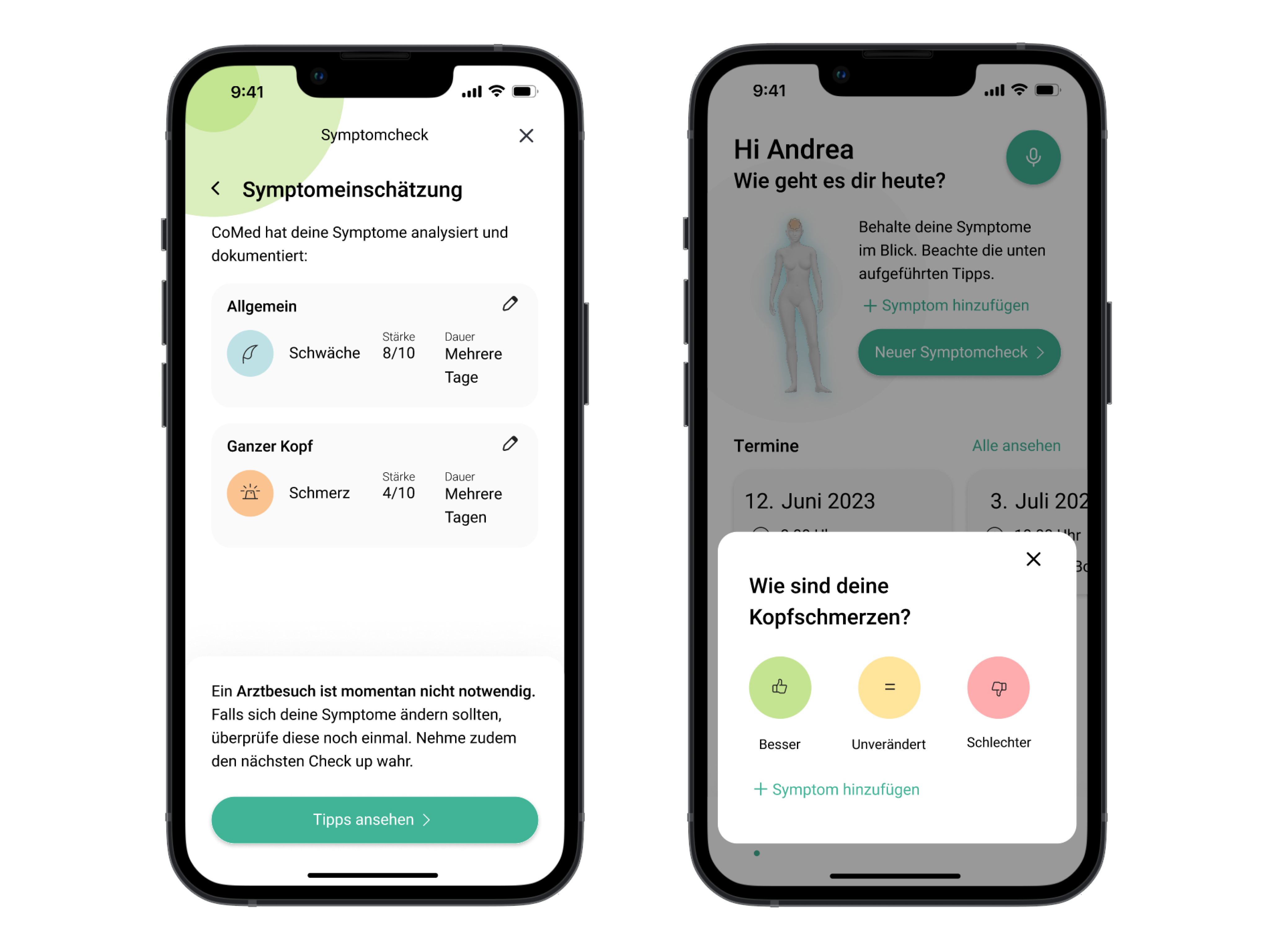 Wenn keine medizinische Versorgung notwendig ist, stuft CoMed dich als grün ein. CoMed zeigt dir Tipps, wie du weiter mit deinen Symptomen umgehen kannst. CoMed frag automatisch nach einiger Zeit nach, wie es dir geht. So kannst du später Symptome anpassen oder neue hinzufügen.