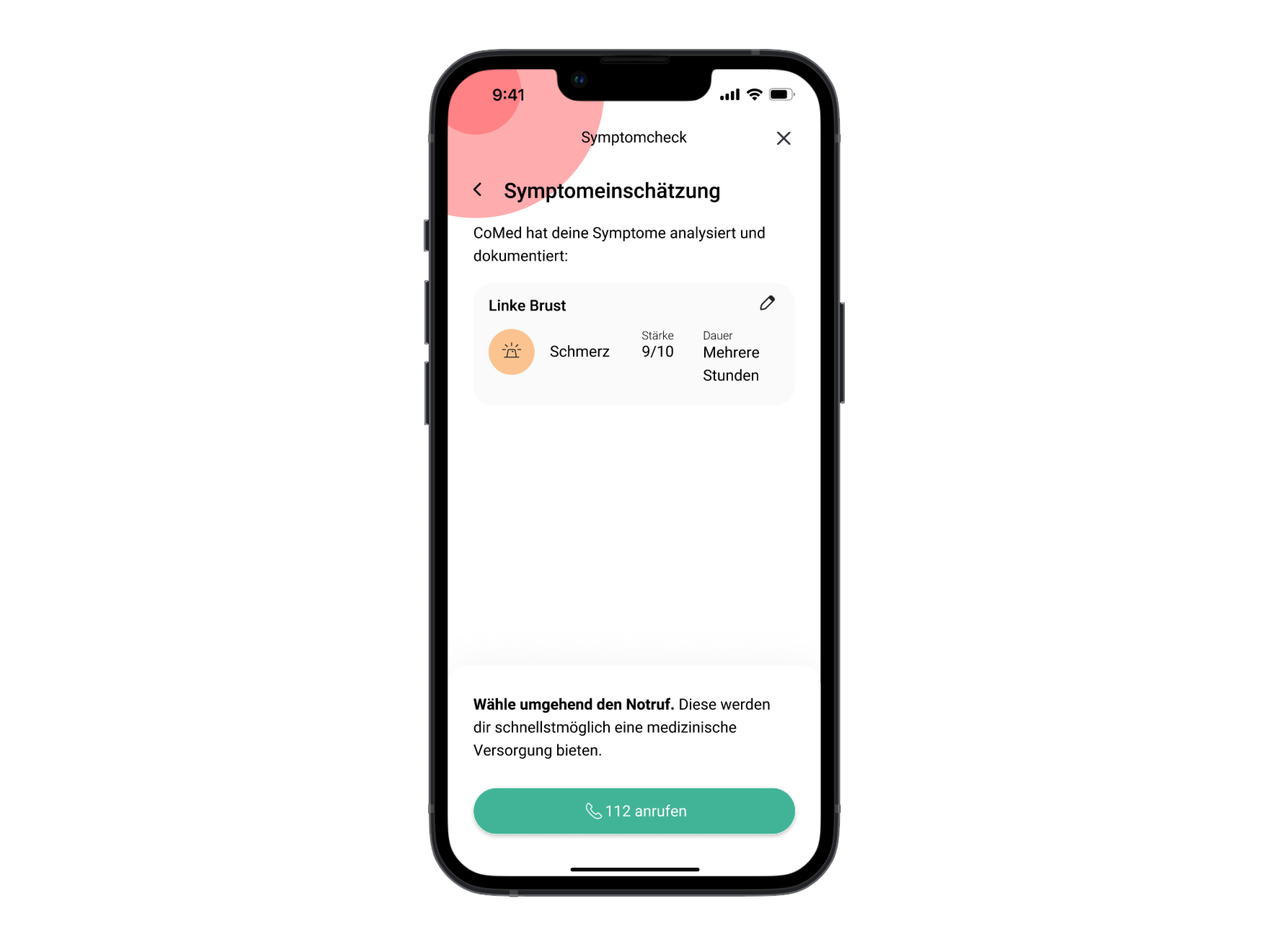 Wenn sofortige medizinische Versorgung notwendig ist, stuft CoMed dich als rot ein. Über einen Klick navigiert dich CoMed in deine Telefonapp, um sofort den Notruf zu verständigen.