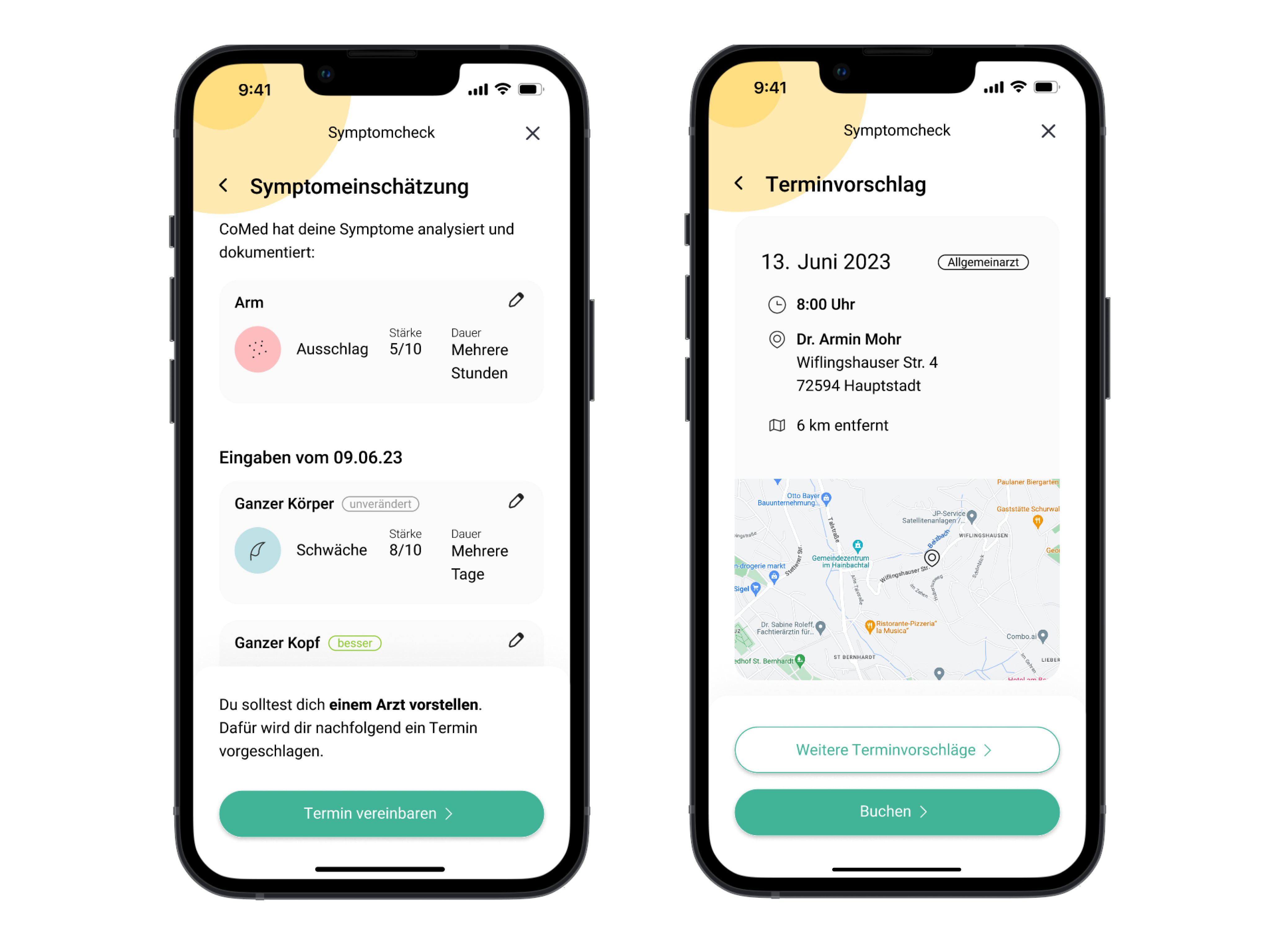 Wenn medizinische Versorgung notwendig ist, stuft CoMed dich als gelb ein. CoMed zeigt dir einen freien Termin bei einem Arzt oder einer Ärztin in deiner Nähe an. Dieser basiert auf der von dir angegebenen Präferenzen. Durch die App kannst du den Termin gleich buchen.