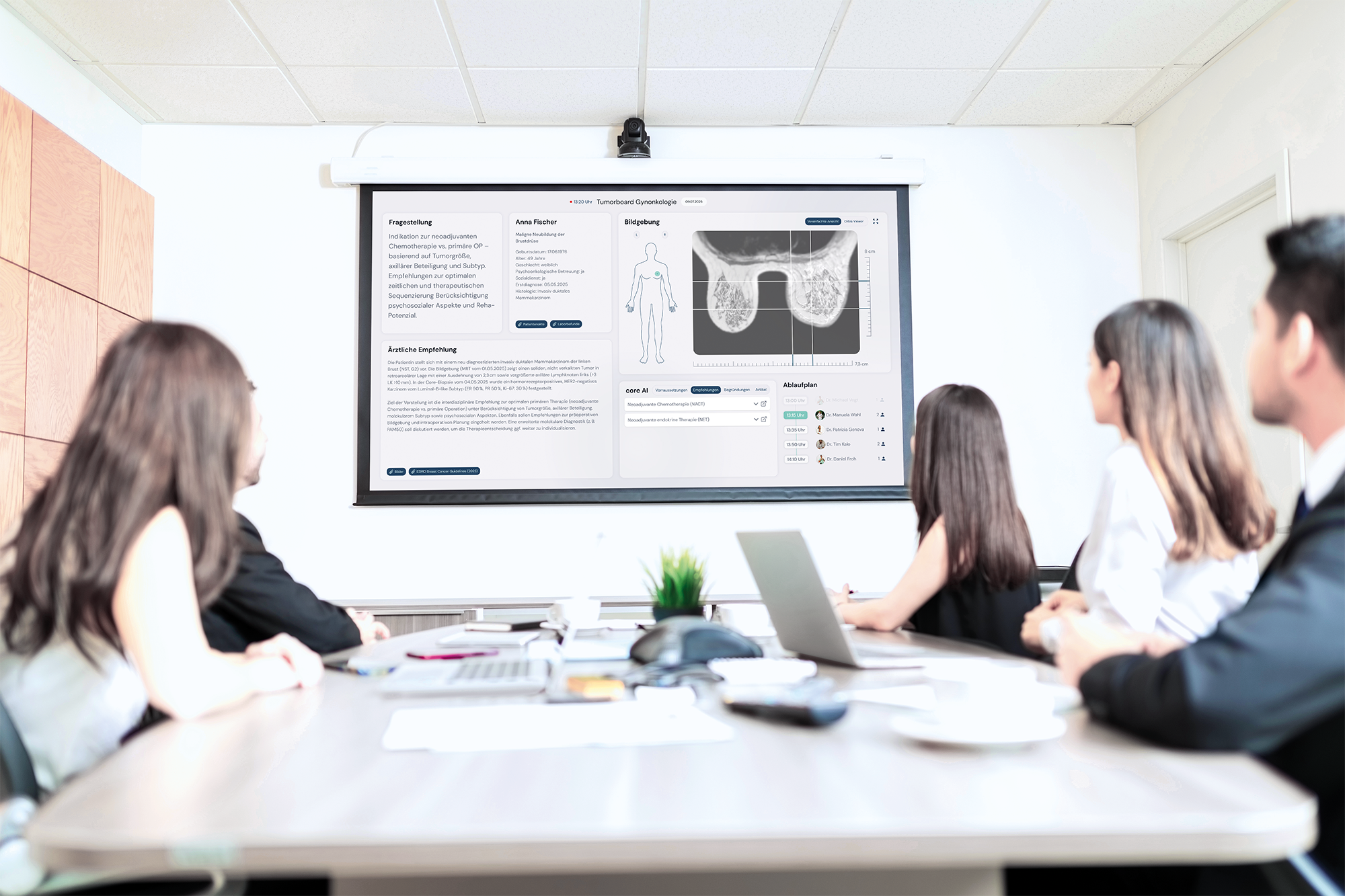 Die Plattform integriert bestehende Kliniksysteme, bereitet Daten intelligent auf und begleitet Tumorboard-Organisator:innen mit KI-gestützten Tools durch die Vorbereitung. Während der Sitzung unterstützt core mit klar gegliederten Fallansichten, Entscheidungswegen und kontextuellen Informationen wie Studien oder Leitlinien. Die Nachbereitung erfolgt automatisch – mitsamt einer strukturierten, nachvollziehbaren Zusammenfassung aller Entscheidungen. Die Plattform funktioniert ortsunabhängig und ist auf unterschiedliche Klinikabläufe adaptierbar.