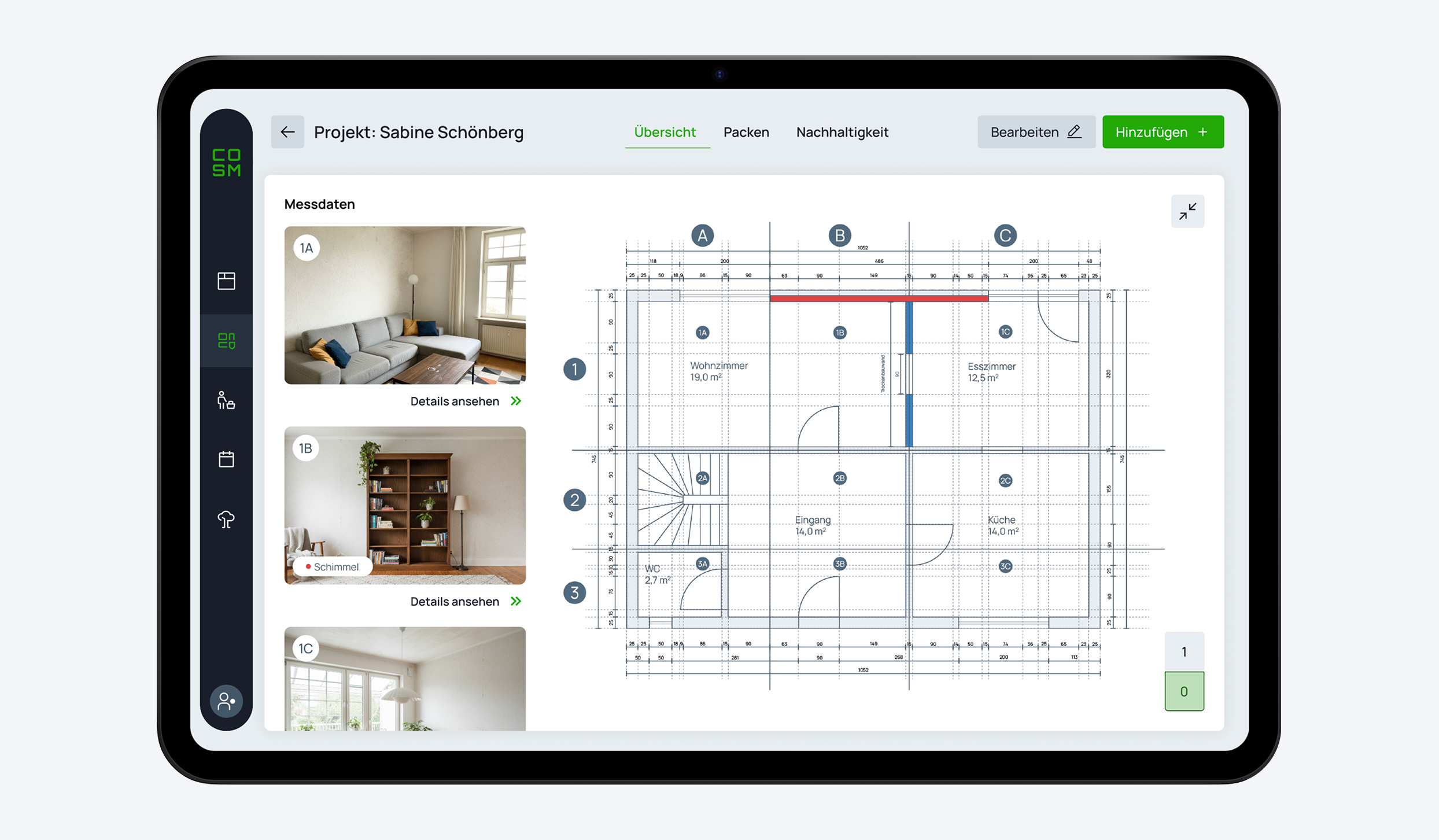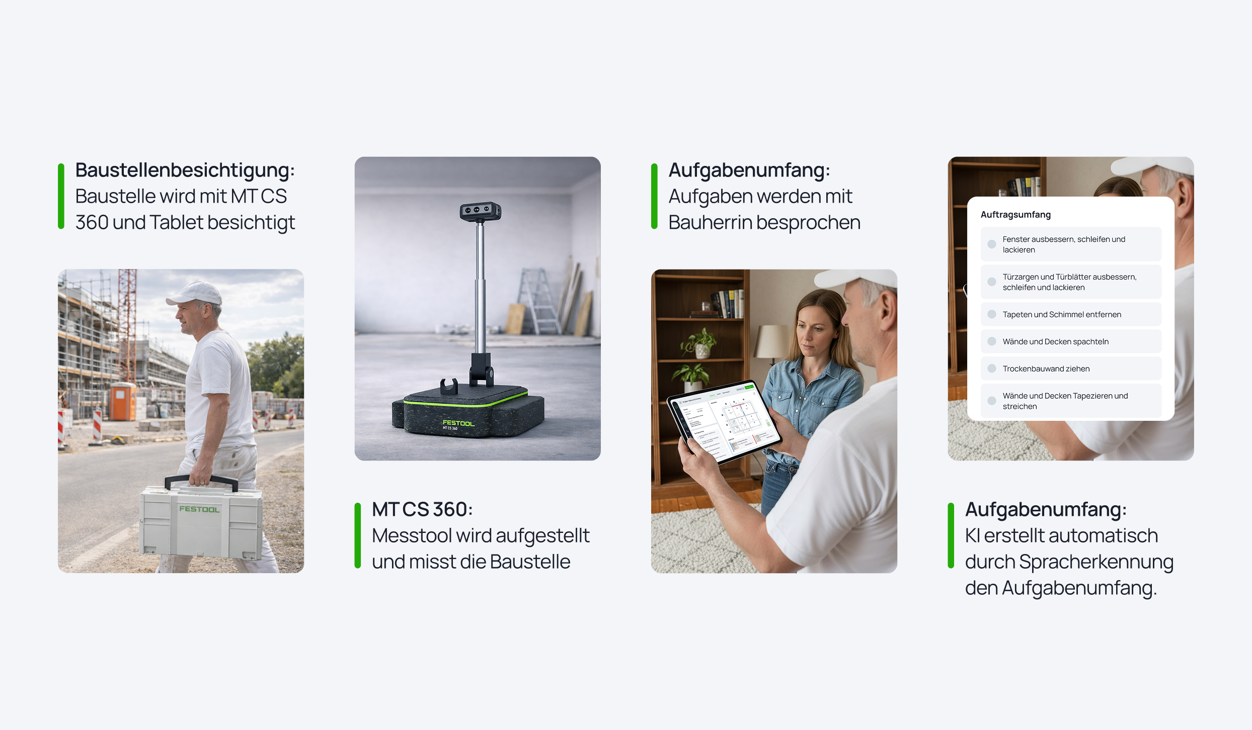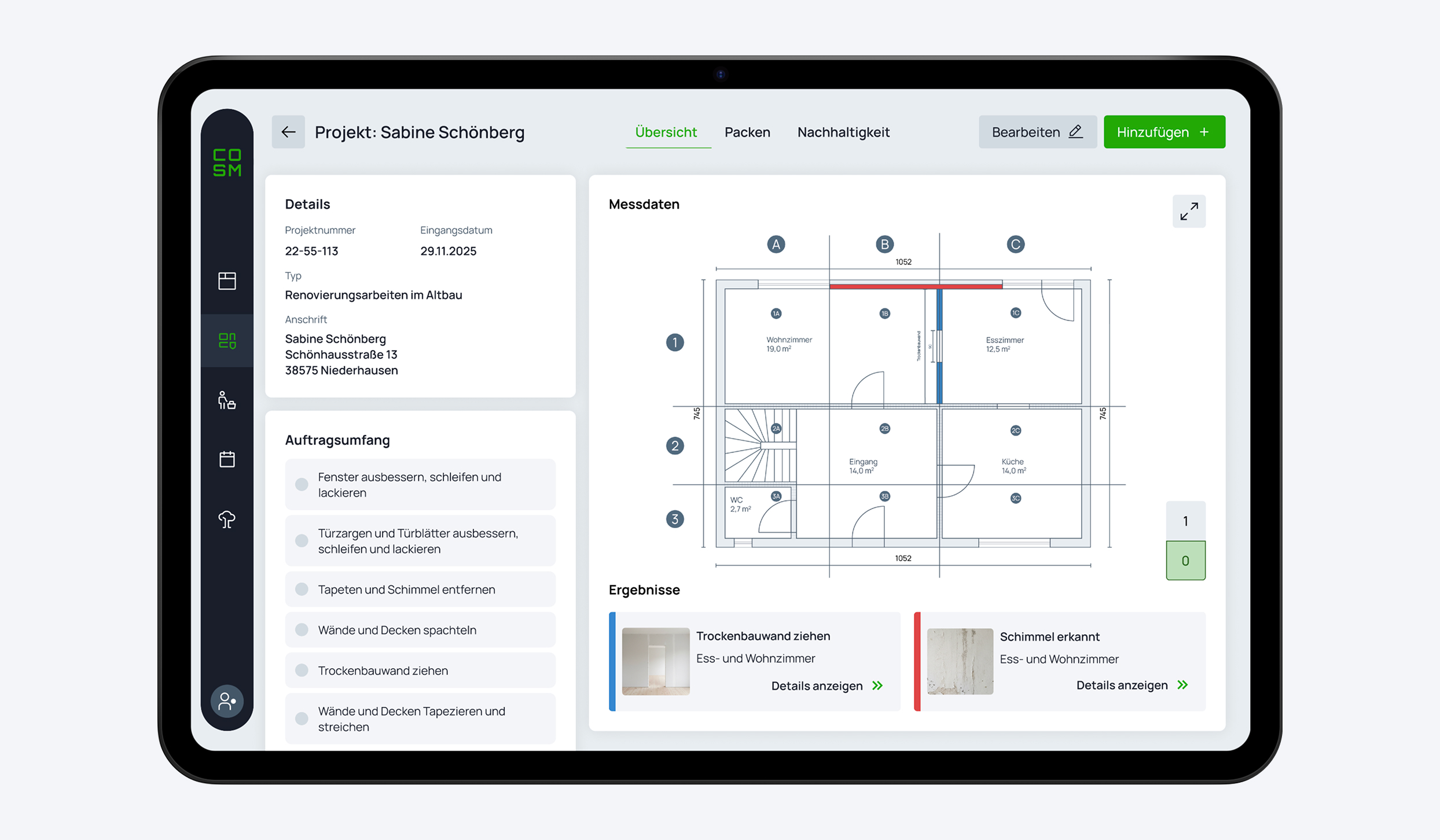 Bei einem typischen Renovierungsauftrag unterstützt COSM von Anfang an. Das MT CS 360 wird im Systainer zur Besichtigung mitgenommen. Vor Ort wird es aufgestellt und erfasst die Baustelle vollautomatisch. Währenddessen können Bauherr:in und Besichtiger:in den Auftragsumfang besprechen. Die Aufgaben sowie exakte Messdaten werden direkt in das Interface übertragen. Hier kann nun durch konkrete Materialauswahl bestimmt werden, wie sich die Baustelle in das vorgegebene CO₂ Budget einpasst. Zurück im Betrieb kann der:die zuständige Handwerker:in alle Informationen direkt einsehen, verborgene Schäden wie Schimmel sind gekennzeichnet und können eingeplant werden. Mit der zugehörigen Packliste, die das Betreibseigene Inventar umfasst, wird weder Material noch Werkzeug vergessen und die Arbeiten können sofort beginnen.