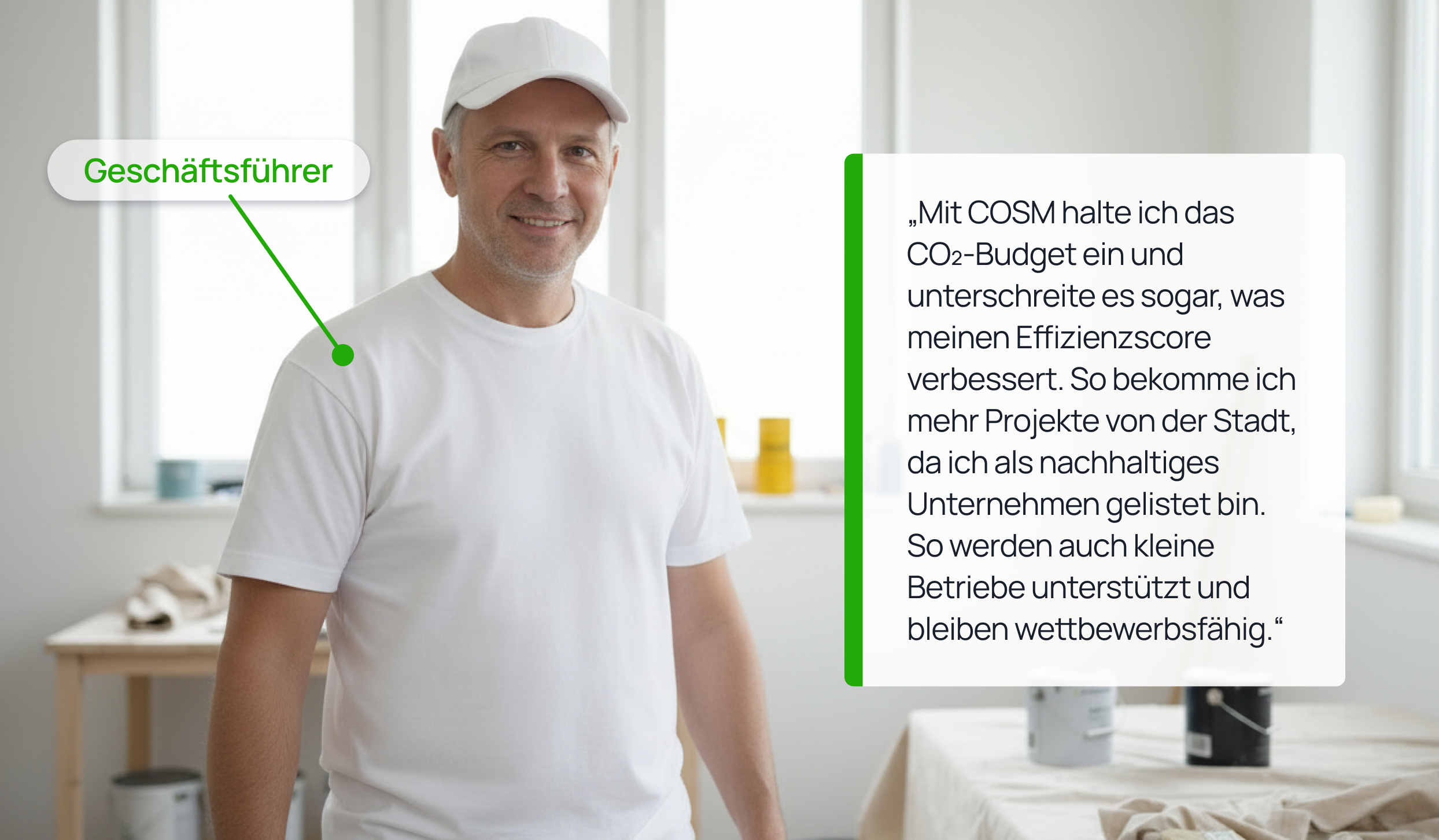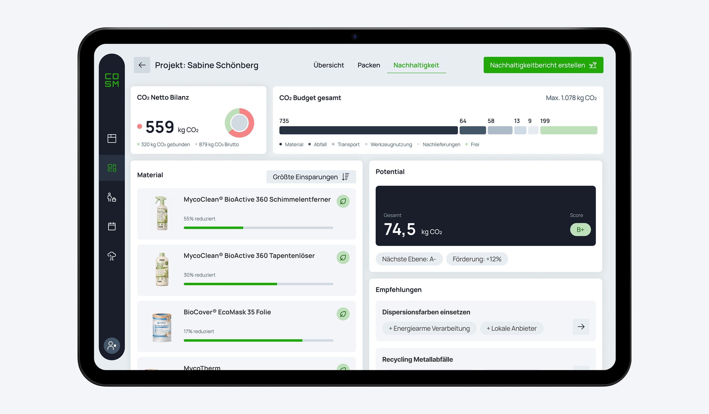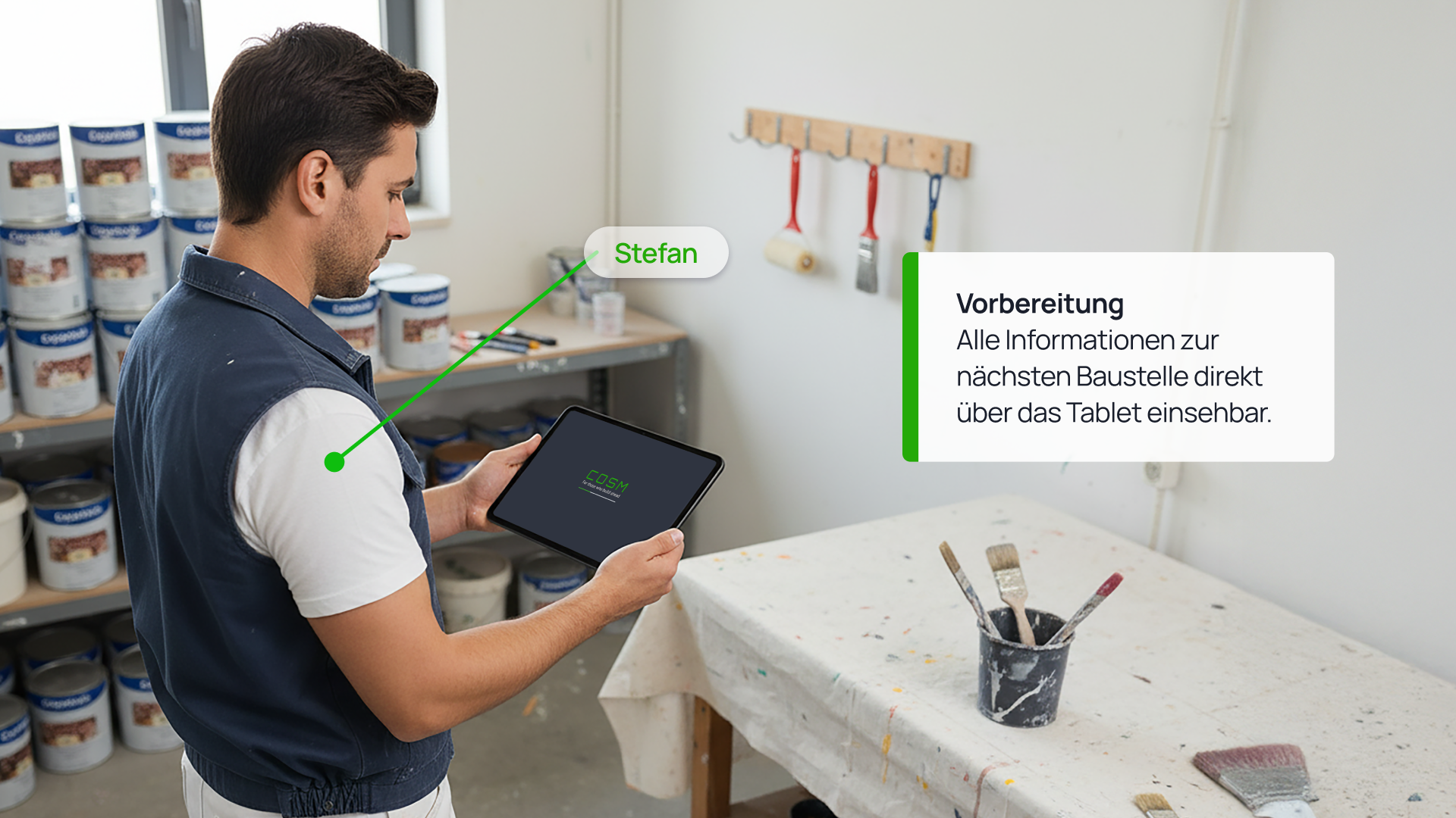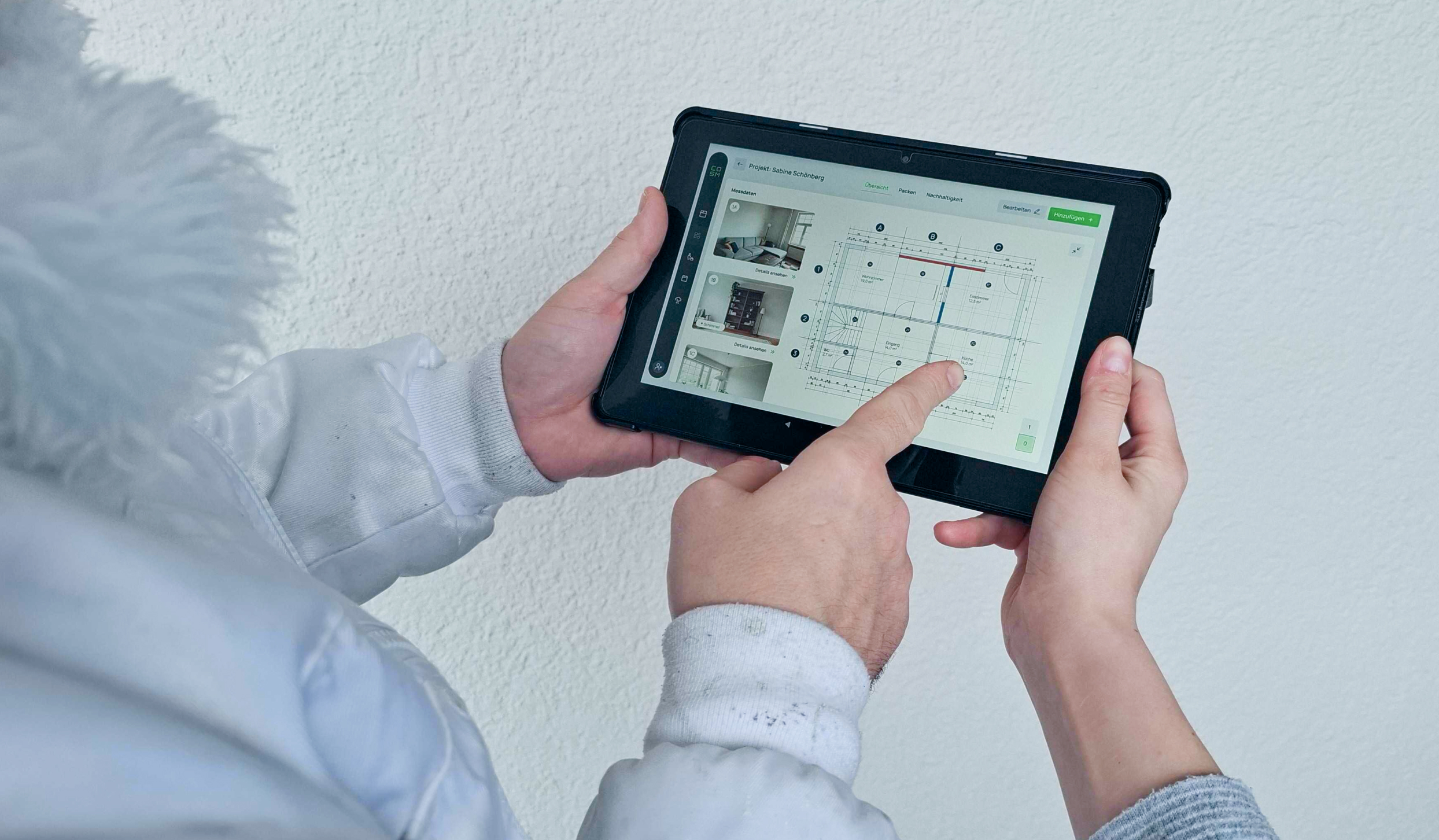 Bei einem typischen Renovierungsauftrag unterstützt COSM von Anfang an. Das MT CS 360 wird im Systainer zur Besichtigung mitgenommen. Vor Ort wird es aufgestellt und erfasst die Baustelle vollautomatisch. Währenddessen können Bauherr:in und Besichtiger:in den Auftragsumfang besprechen. Die Aufgaben sowie exakte Messdaten werden direkt in das Interface übertragen. Hier kann nun durch konkrete Materialauswahl bestimmt werden, wie sich die Baustelle in das vorgegebene CO₂ Budget einpasst. Zurück im Betrieb kann der:die zuständige Handwerker:in alle Informationen direkt einsehen, verborgene Schäden wie Schimmel sind gekennzeichnet und können eingeplant werden. Mit der zugehörigen Packliste, die das Betreibseigene Inventar umfasst, wird weder Material noch Werkzeug vergessen und die Arbeiten können sofort beginnen.