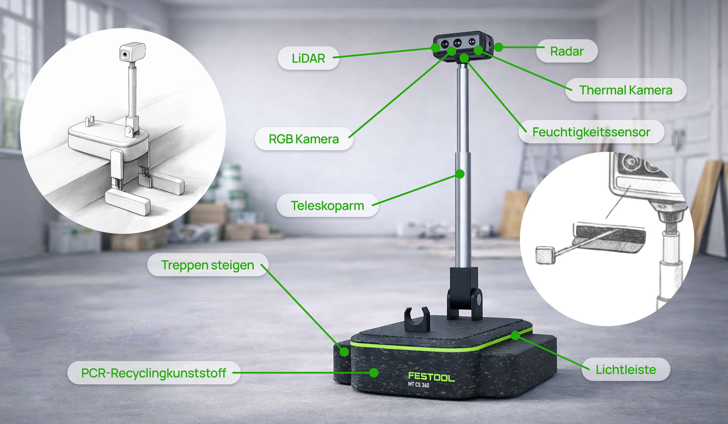 Das MT CS 360 ist ein autonomes Messgerät zur präzisen Erfassung aller relevanten Baustellendaten. Integrierte Sensoren, darunter ein Feuchtigkeitssensor zur Erkennung verdeckter Schäden wie Schimmel hinter Oberflächen, machen Informationen sichtbar, die bei klassischen Baustellenbegehungen oft verloren gehen. So entsteht eine verlässliche Datengrundlage für eine vollständige Material- und Werkzeugplanung.