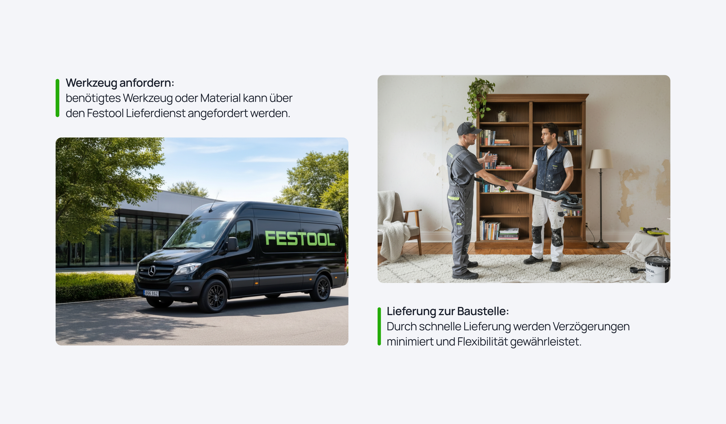 Sollten sich Anforderung doch einmal kurzfristig ändern, ist COSM vorbereitet. Mit nur einem Klick kann mit dem Festool Mobil Werkzeug und Material angefordert werden. Dieses wird direkt an die Baustelle geliefert und Verzögerungen werden minimiert.