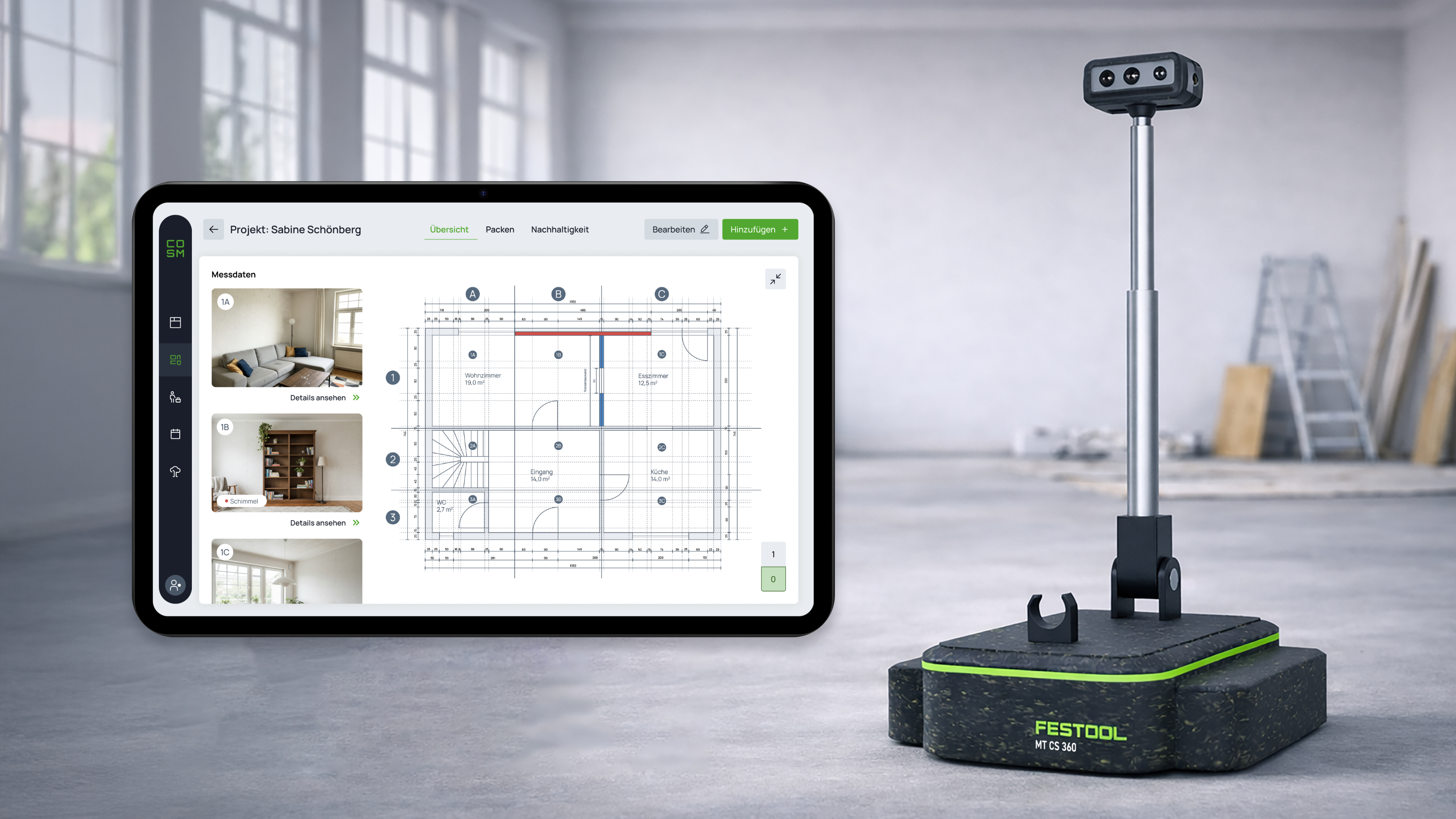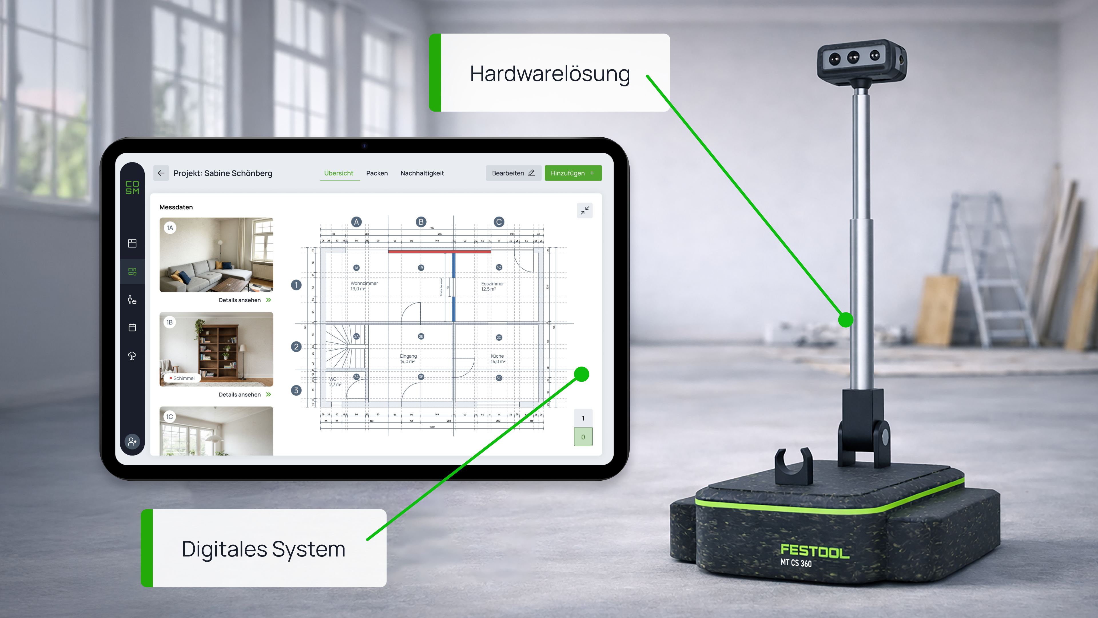 Ein digitales System in Verbindung mit dem Messtool MT CS 360 zur optimierten Material- und Werkzeugplanung im Handwerk, zur CO₂-Budgetierung und für eine nachhaltige Baustellenplanung.