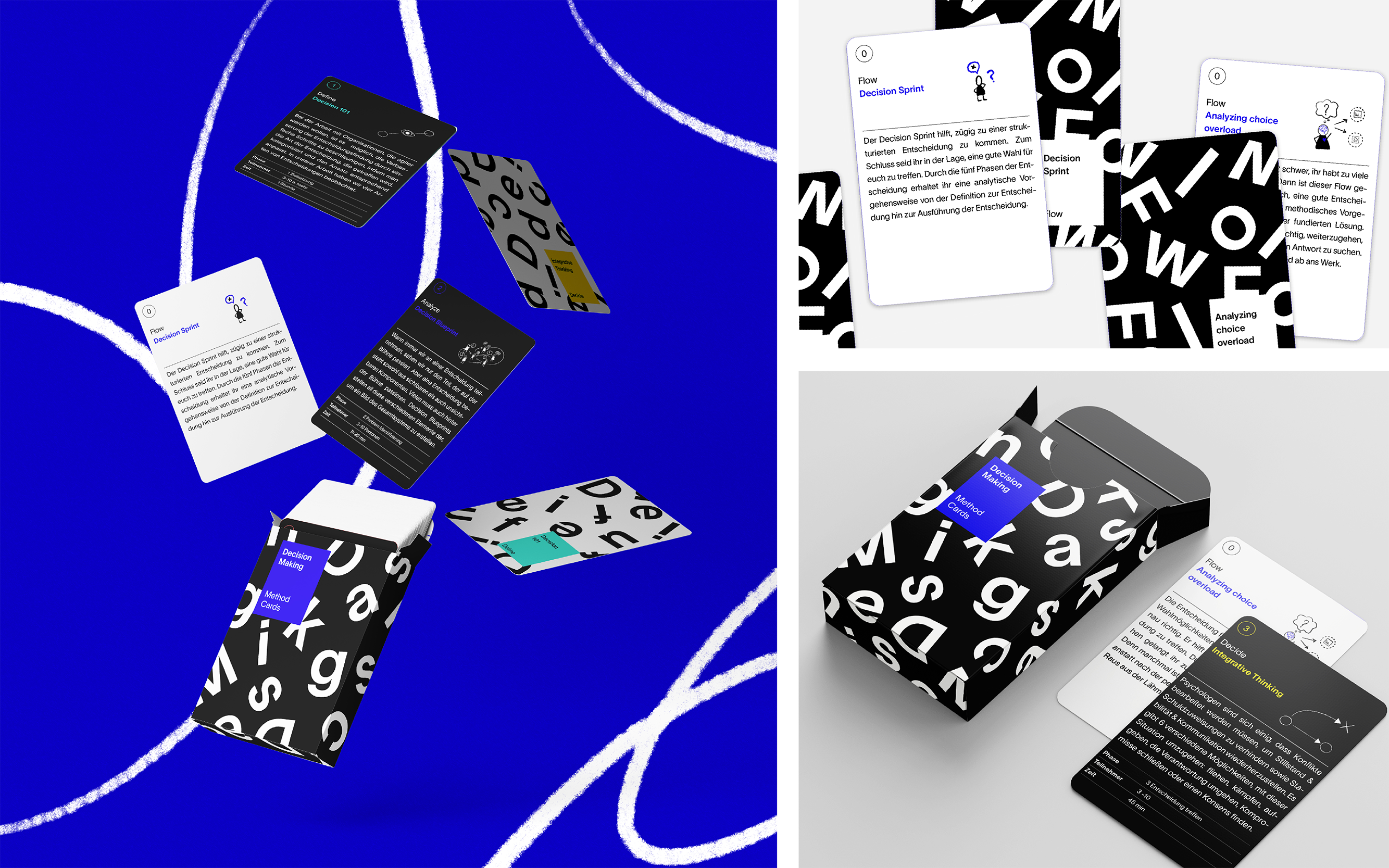 The project consists of three parts. The book provides the reader with an introduction to the theory of the subject. Starting from the front, the contents are described in detail and summarize the wide-ranging areas of decision theory and its research findings. Read from the back, the book serves as a compact reference guide to individual topics.The card set assists teams working together in a decision-making workshop. They serve as a source of inspiration and as brief action guides that look at individual aspects of the decision-making process in isolation.The website summarizes theory and practical approaches. It provides quick starters as templates for workshops and brings methods and theory closer to the viewer.