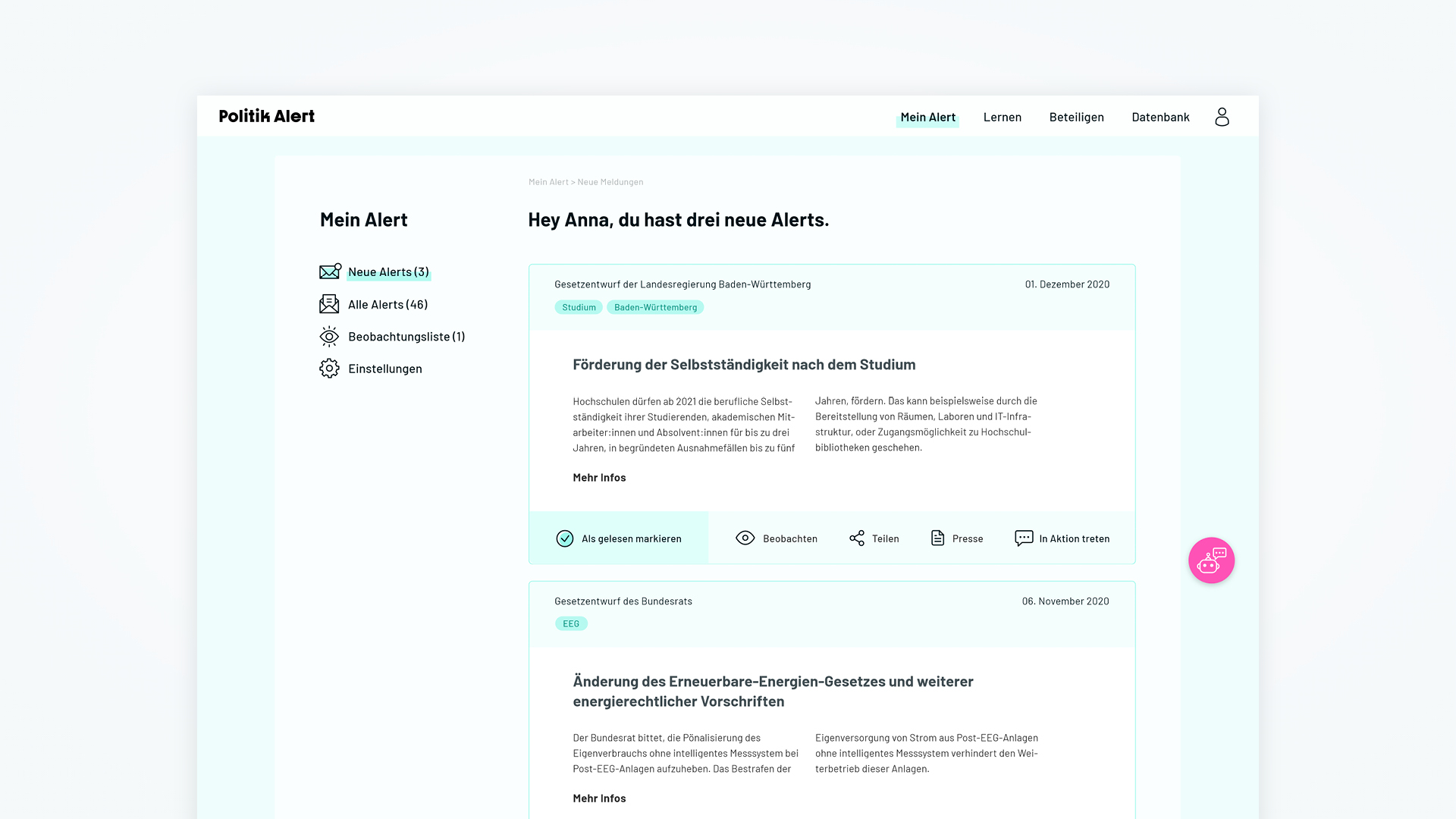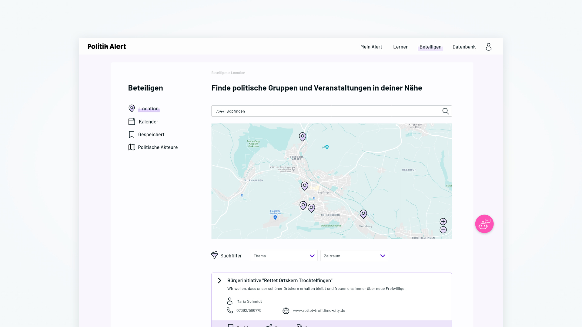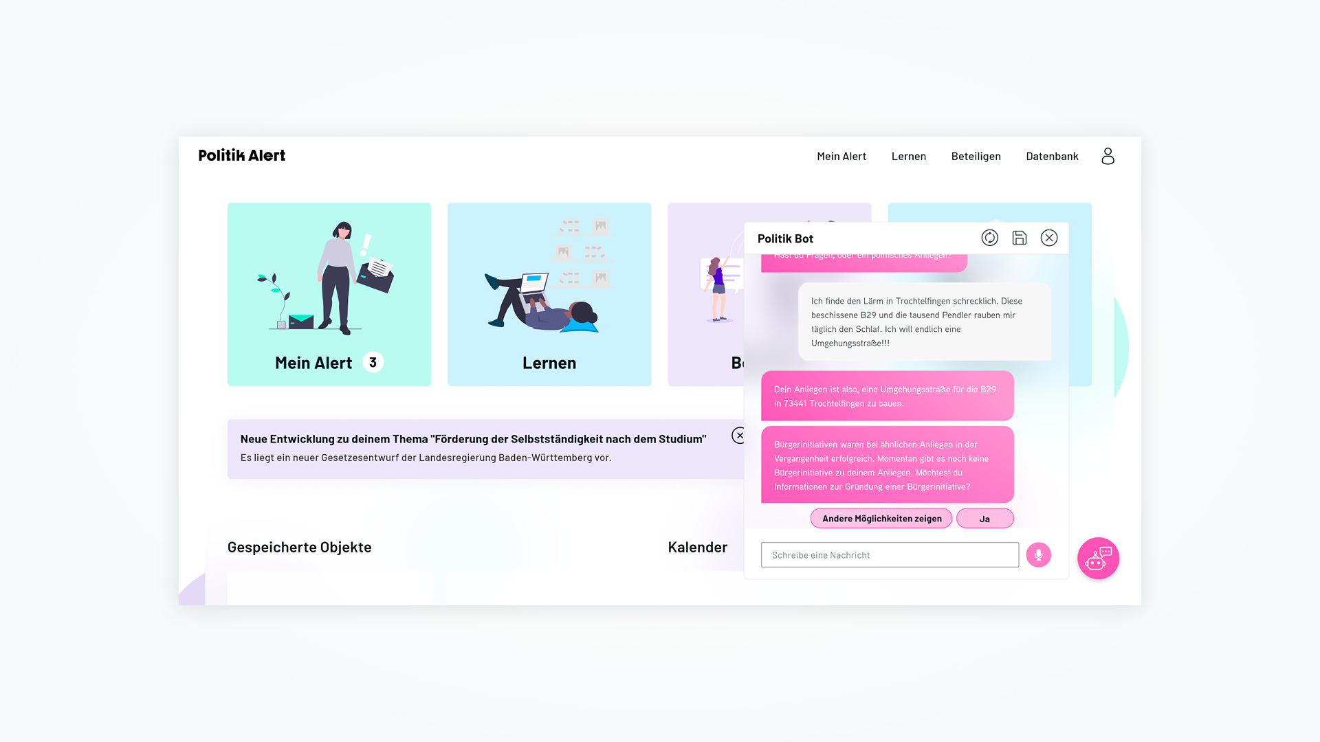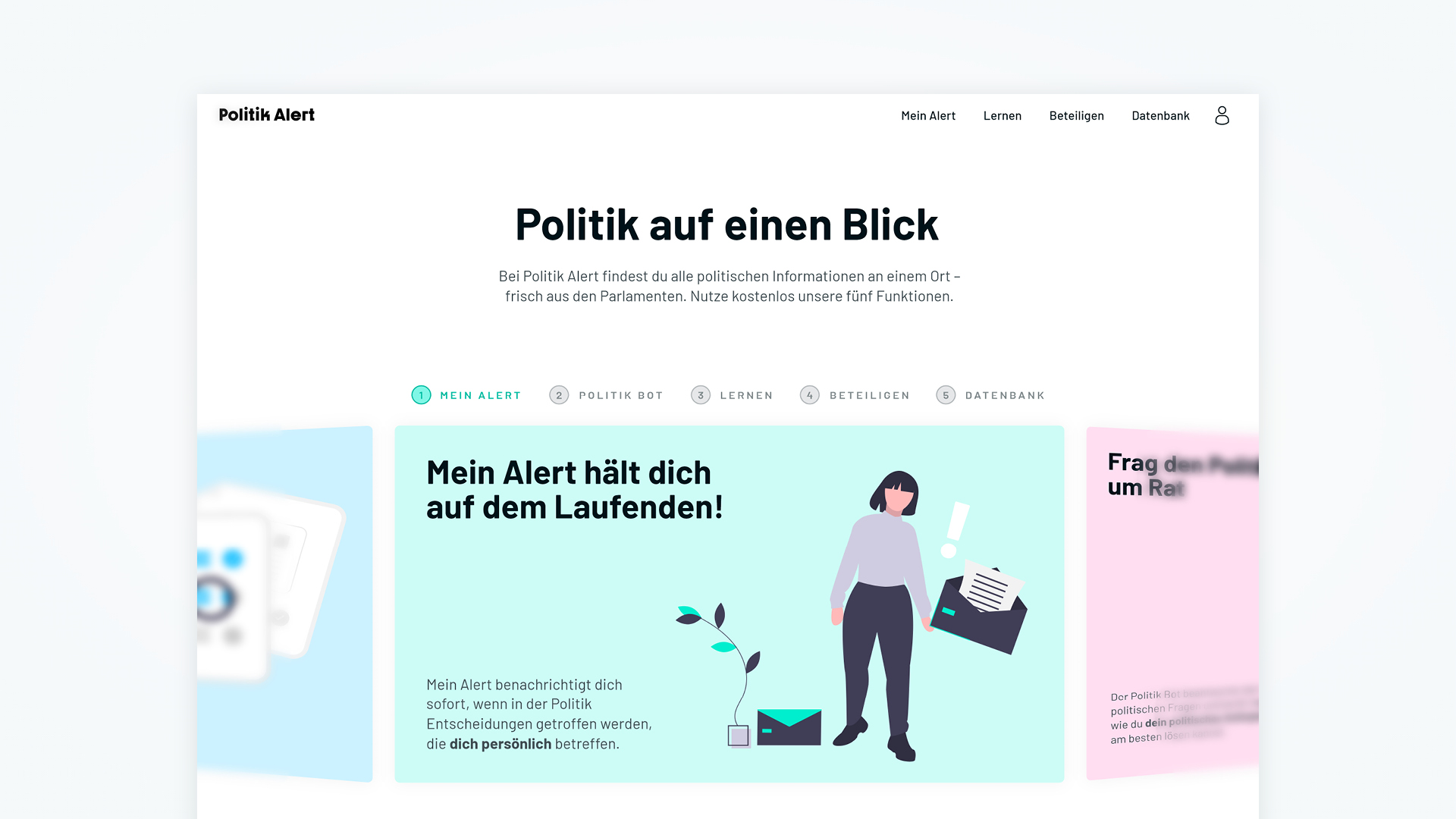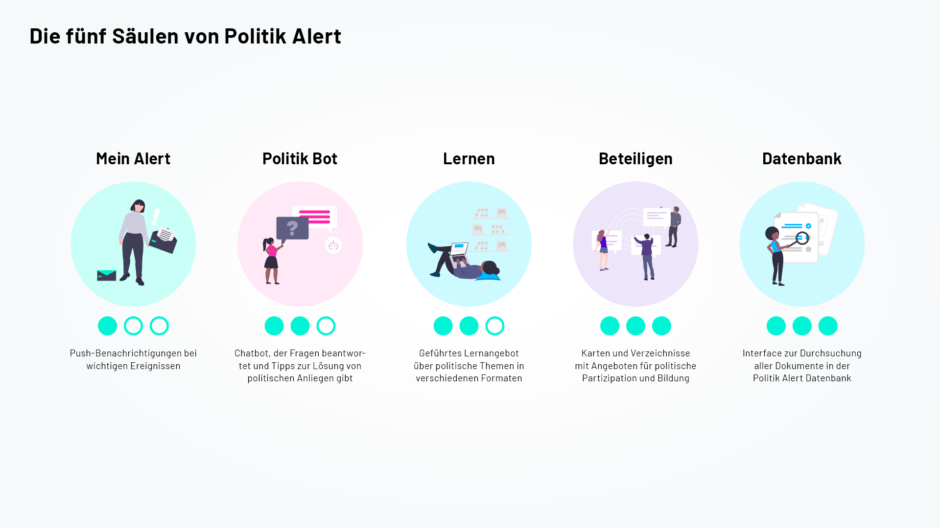 Es gibt fünf Hauptfunktionen auf Politik Alert. »Mein Alert« benachrichtigt Nutzer:innen, sobald eine politische Entscheidung getroffen wurde, die sie betreffen könnte. Der »Politik Bot« beantwortet Fragen und empfiehlt bei politischen Anliegen die erfolgversprechendste Partizipationsform. Über »Beteiligen« können ganz einfach politische Gruppen und Veranstaltungen in der Nähe gefunden werden. Mit einem personalisierten Lernplan können Nutzer:innen ihr Politikwissen aufpolieren und über die Datenbank bequem Dokumente recherchieren. So sorgt Politik Alert für mehr Transparenz und hilft den Nutzer:innen langfristig ihr politisches Selbstvertrauen zu stärken.