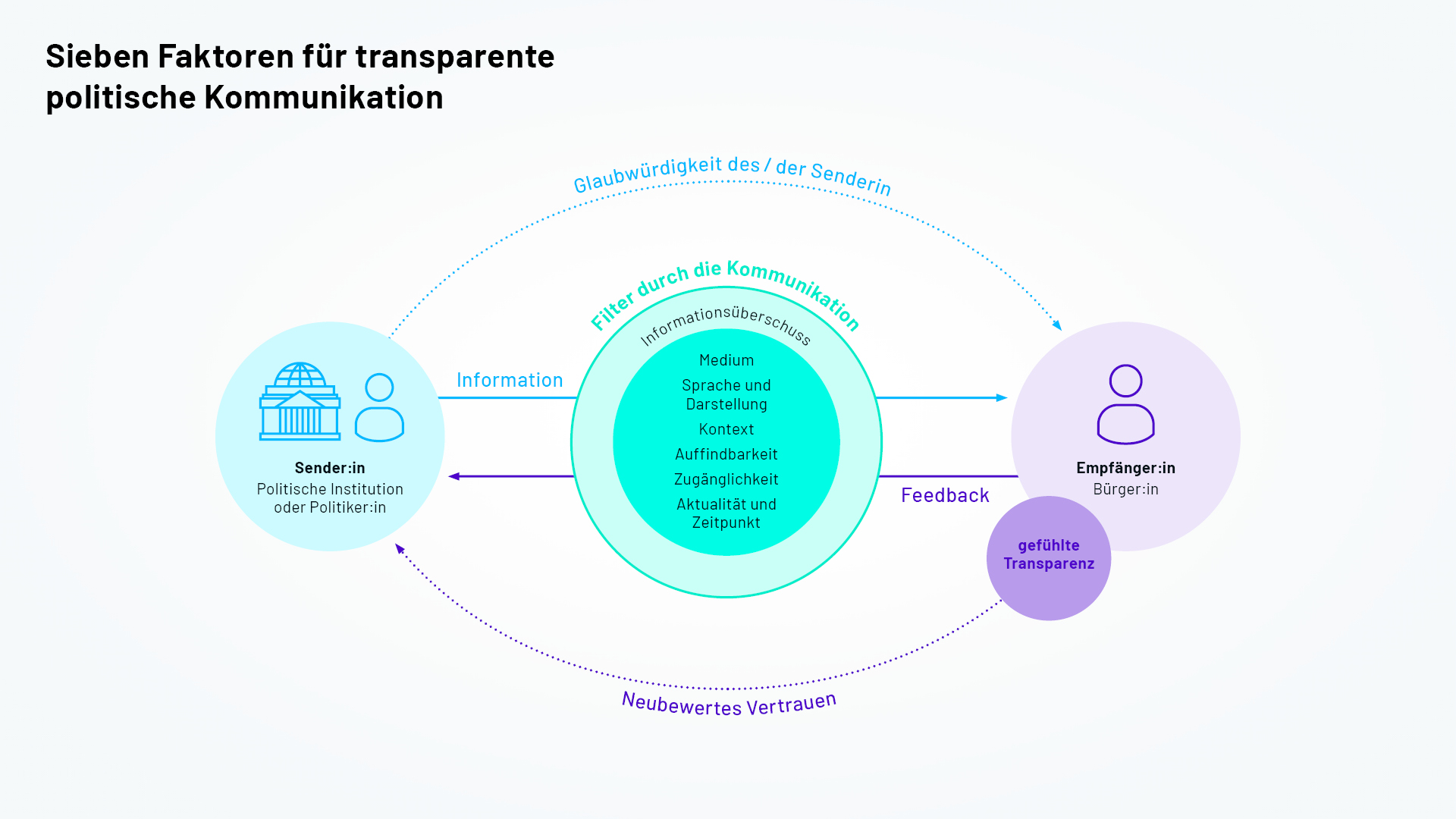 Transparenz beeinflusst Vertrauen positiv und bildet die Grundlage für Meinungsbildung und politische Teilhabe. In dieser Masterthesis haben wir deshalb nach Wegen gesucht, die politische Kommunikation transparenter zu gestalten. Wir konnten sieben Faktoren identifizieren, die dazu beitragen: die Wahl des Mediums, die gewählte Sprache und Darstellung, der Kontext, die Auffindbarkeit und Zugänglichkeit, die Aktualität einer Information und der Zeitpunkt ihrer Veröffentlichung sowie der Einfluss des Informationsüberschusses.