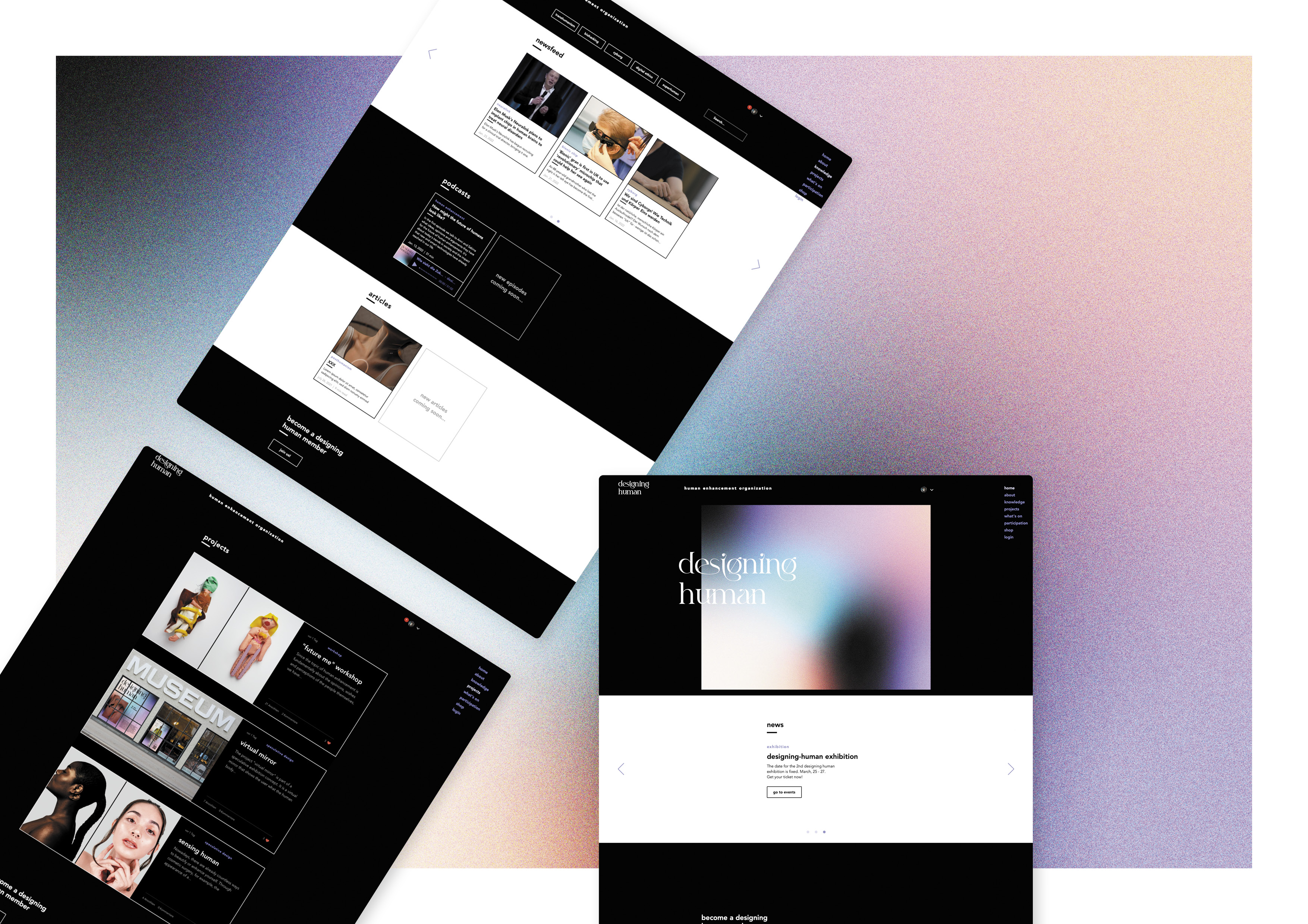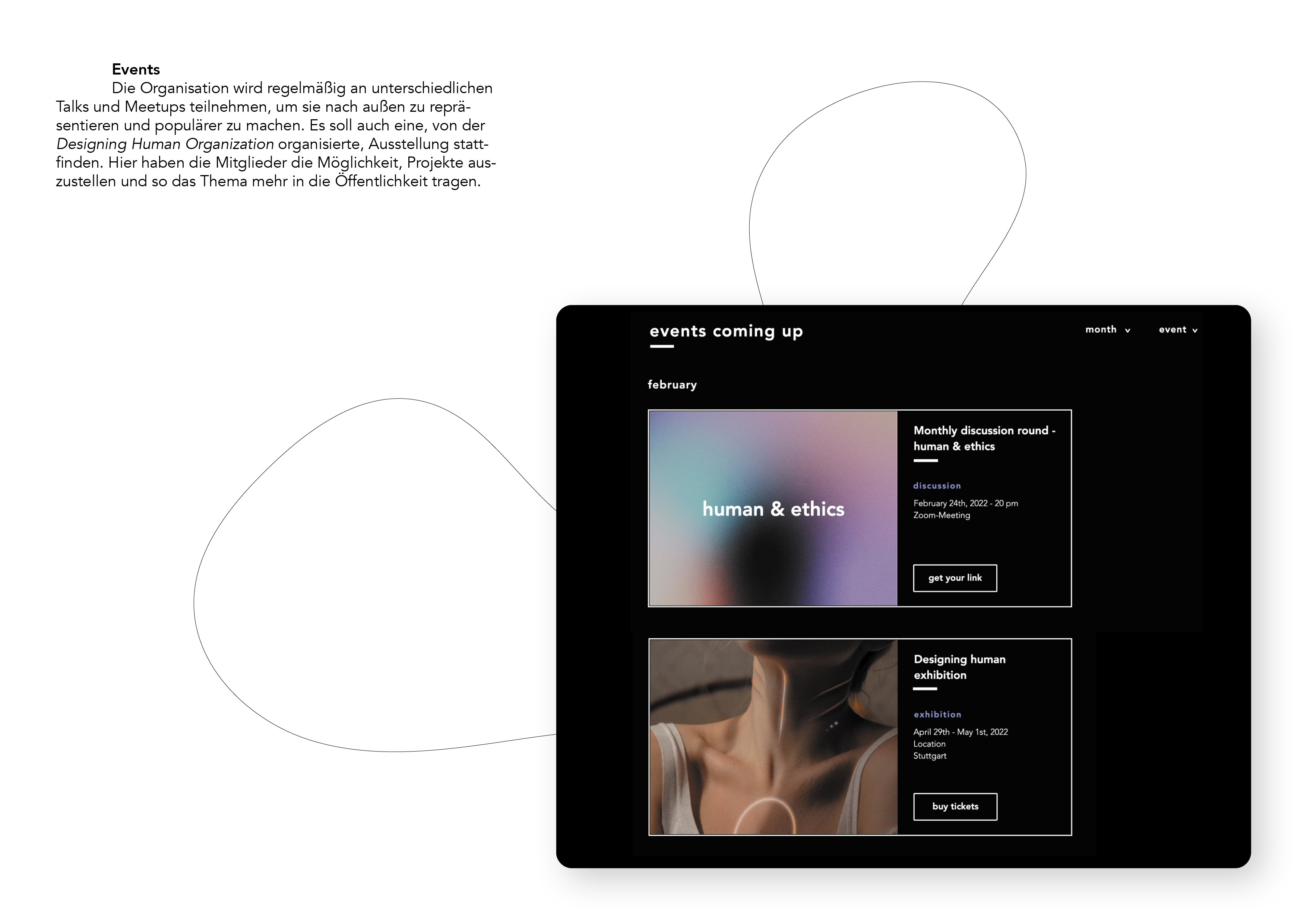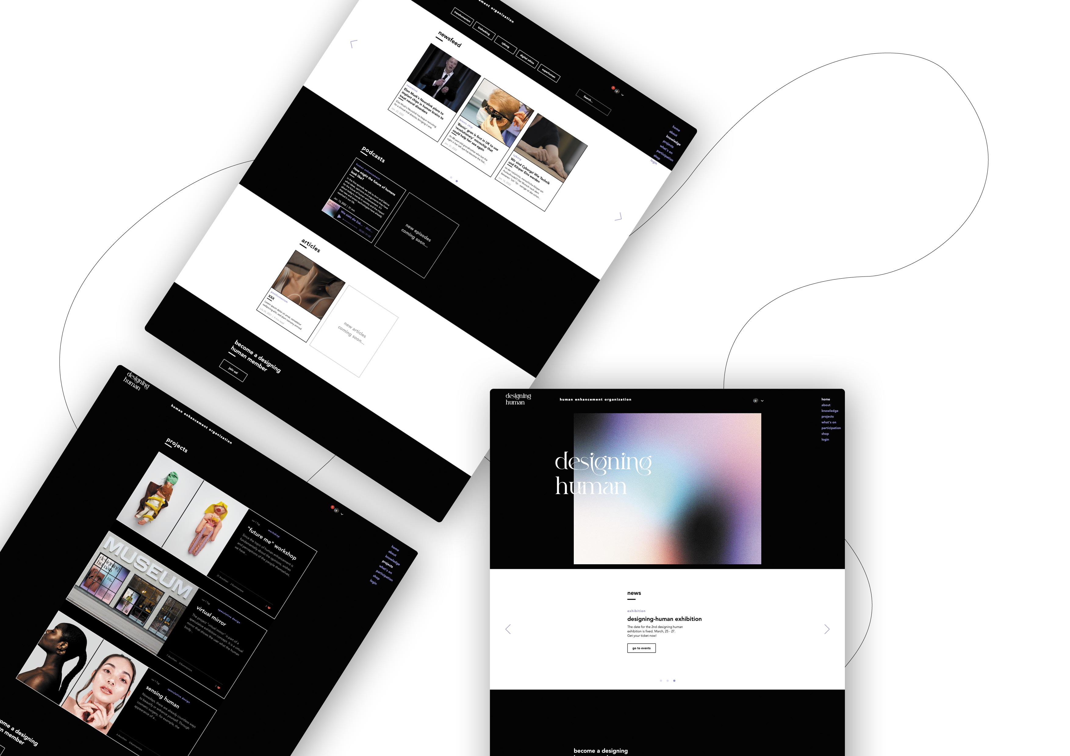 Auf Grundlage dieser Erkenntnisse gründeten wir die Designing Human Organization und entwickelten die damit verbundene Plattform. Diese schafft einen Treffpunkt für Menschen und ermöglicht ihnen, diesen sehr relevanten Diskurs zu führen und ihn nachhaltig zu fördern. Durch die Designing Human Organization wollen wir über diese Thematik aufklären, Wissen weitergeben und ein Bewusstsein darüber schaffen. Außerdem ist es uns wichtig, das derzeitige Bild der Zukunft des Menschen zu beeinflussen, bzw. den Horizont öffnen und erweitern. Dies erreichen wir durch die spekulative Darstellung von Zukunftsszenarien und Produkten der Zukunft. Ein weiteres wichtiges Ziel ist es, den Menschen die Möglichkeit zu bieten, an Diskussionen teilzunehmen und sie mit anderen Menschen zusammen zu bringen.