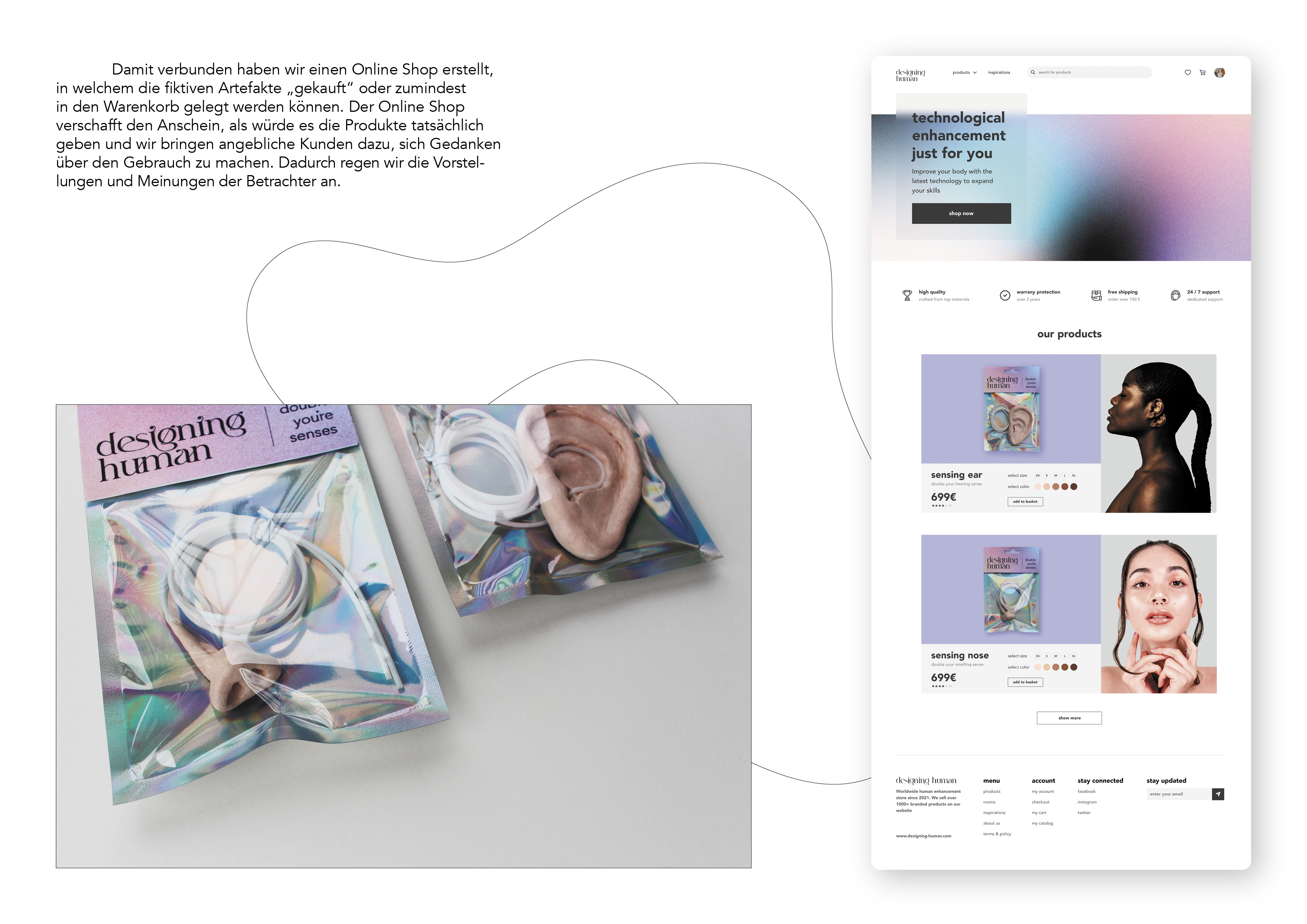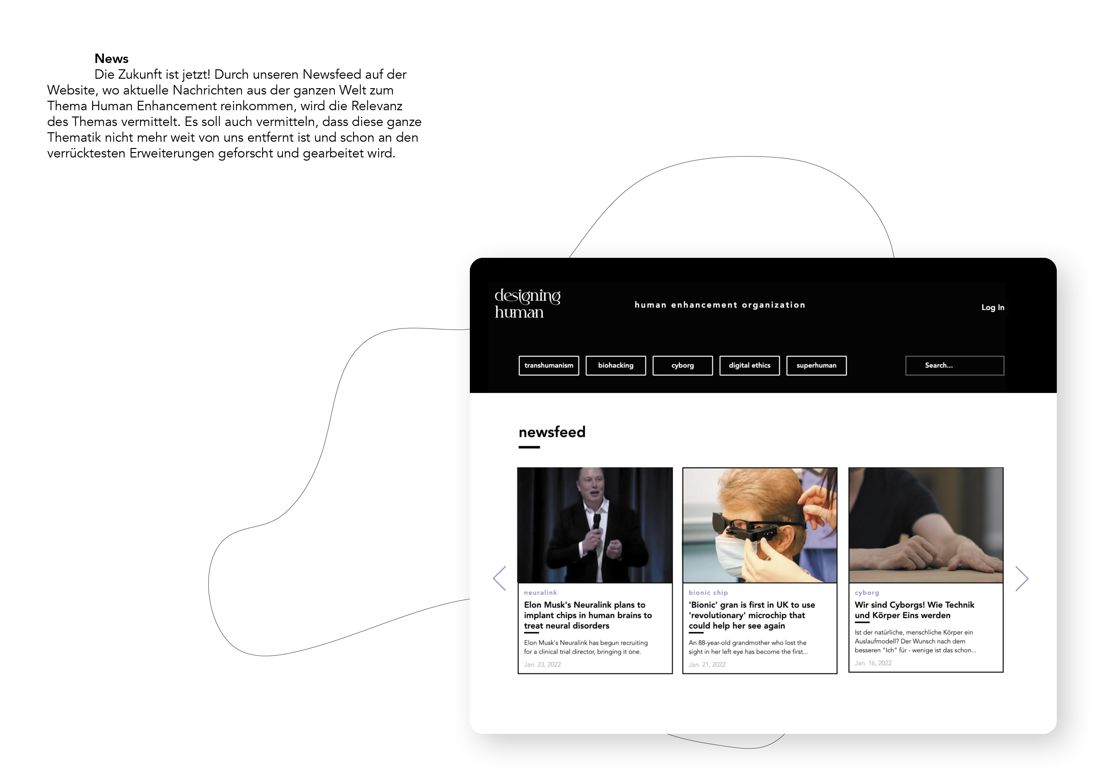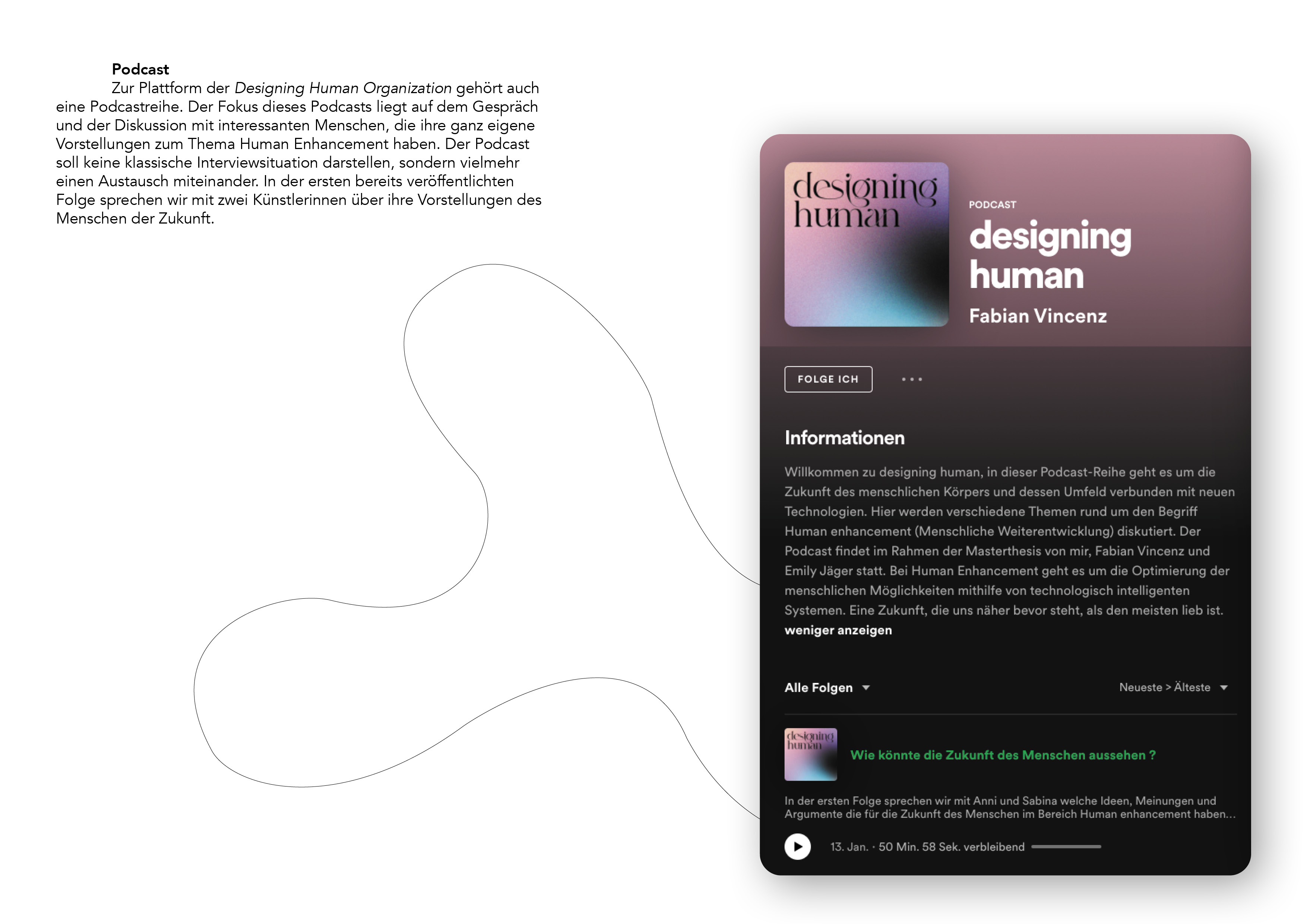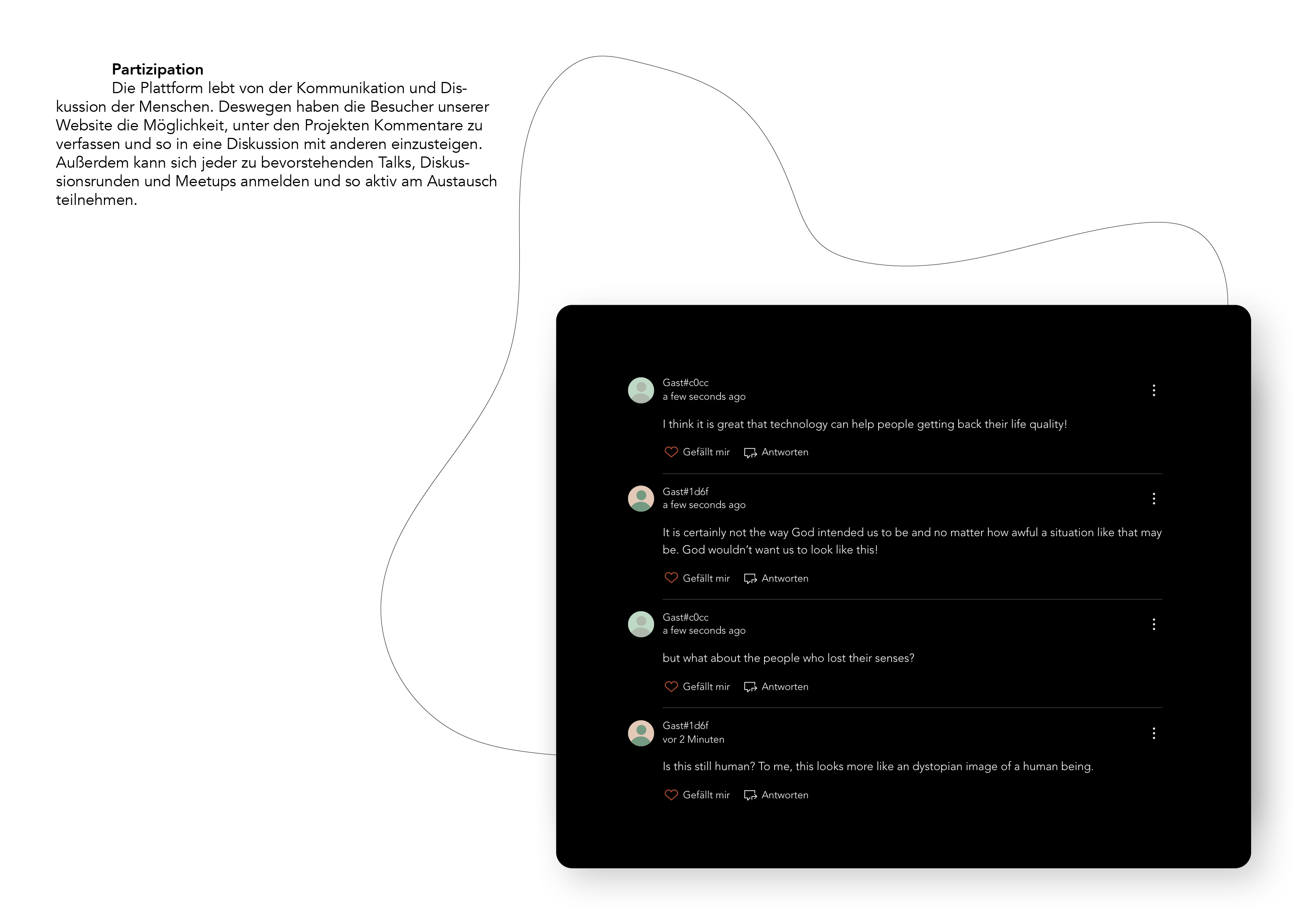 Auf Grundlage dieser Erkenntnisse gründeten wir die Designing Human Organization und entwickelten die damit verbundene Plattform. Diese schafft einen Treffpunkt für Menschen und ermöglicht ihnen, diesen sehr relevanten Diskurs zu führen und ihn nachhaltig zu fördern. Durch die Designing Human Organization wollen wir über diese Thematik aufklären, Wissen weitergeben und ein Bewusstsein darüber schaffen. Außerdem ist es uns wichtig, das derzeitige Bild der Zukunft des Menschen zu beeinflussen, bzw. den Horizont öffnen und erweitern. Dies erreichen wir durch die spekulative Darstellung von Zukunftsszenarien und Produkten der Zukunft. Ein weiteres wichtiges Ziel ist es, den Menschen die Möglichkeit zu bieten, an Diskussionen teilzunehmen und sie mit anderen Menschen zusammen zu bringen.