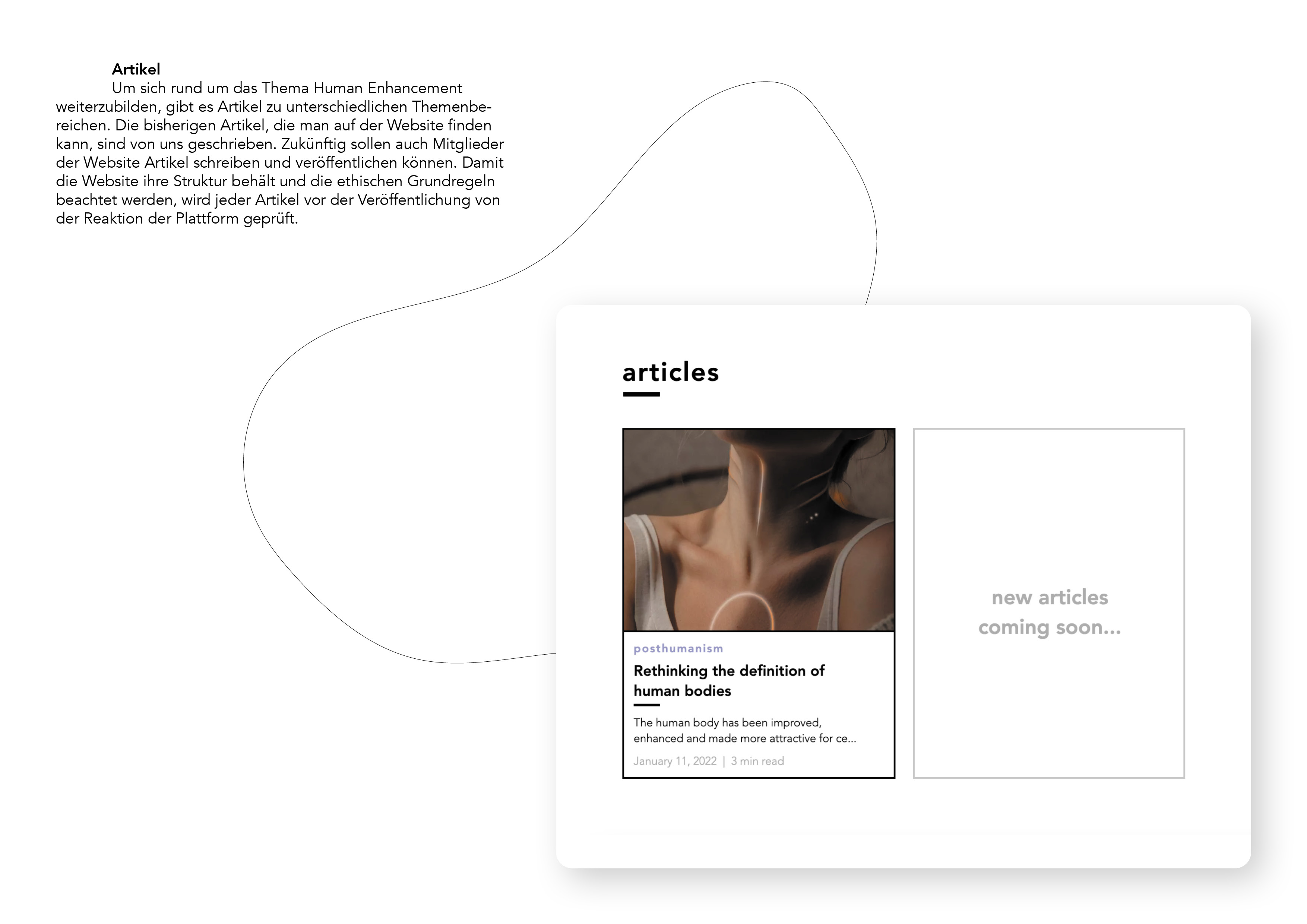 Der technologische Fortschritt entwickelt sich immer schneller und die Grenze zwischen Mensch und Technologie wird immer kleiner. Dieser Ausgangspunkt führte uns zu der Annahme, dass der Mensch in Zukunft mit der Technik verschmelzen wird und somit über zusätzliche Fähigkeiten verfügt oder seine bestehenden verbessern kann. Auf die Frage, wie der menschliche Körper in Zukunft aussehen wird, gibt es keine Antwort. Es ist jedoch umso wichtiger, heute schon darüber zu diskutieren, wie so eine Zukunft aussehen könnte, welche Probleme damit einhergehen und welche Haltung wir Menschen dem gegenüber einnehmen.