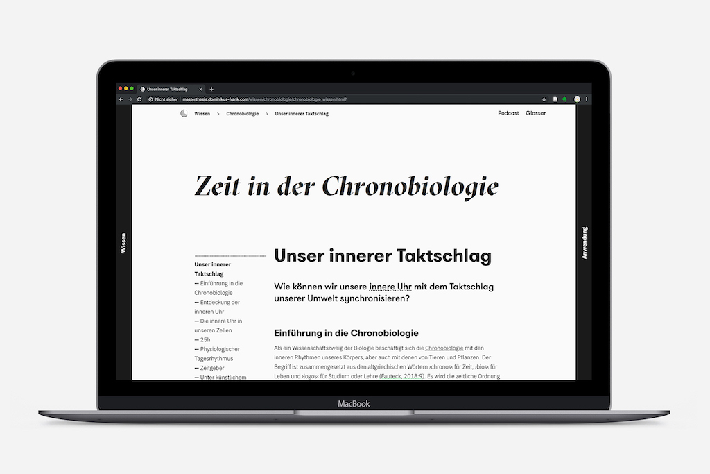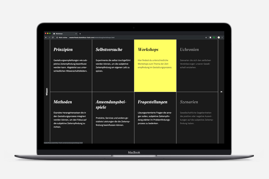 Diese Thesis entwirft keine konkreten Lösungen und kein exemplarisch ausgearbeitetes Gestaltungsprodukt. Vielmehr untersucht sie die relevanten, gestalterischen Einflussmöglichkeiten, die über die naheliegenden, z.B. das Ziffernblatt einer Uhr, hinausgehen. Der rote Faden ist dabei immer die Gestaltbarkeit von subjektivem Zeitempfinden: Wir gestalten nicht die Zeit selbst, wir gestalten unseren Umgang und unsere Empfindung von ihr.
