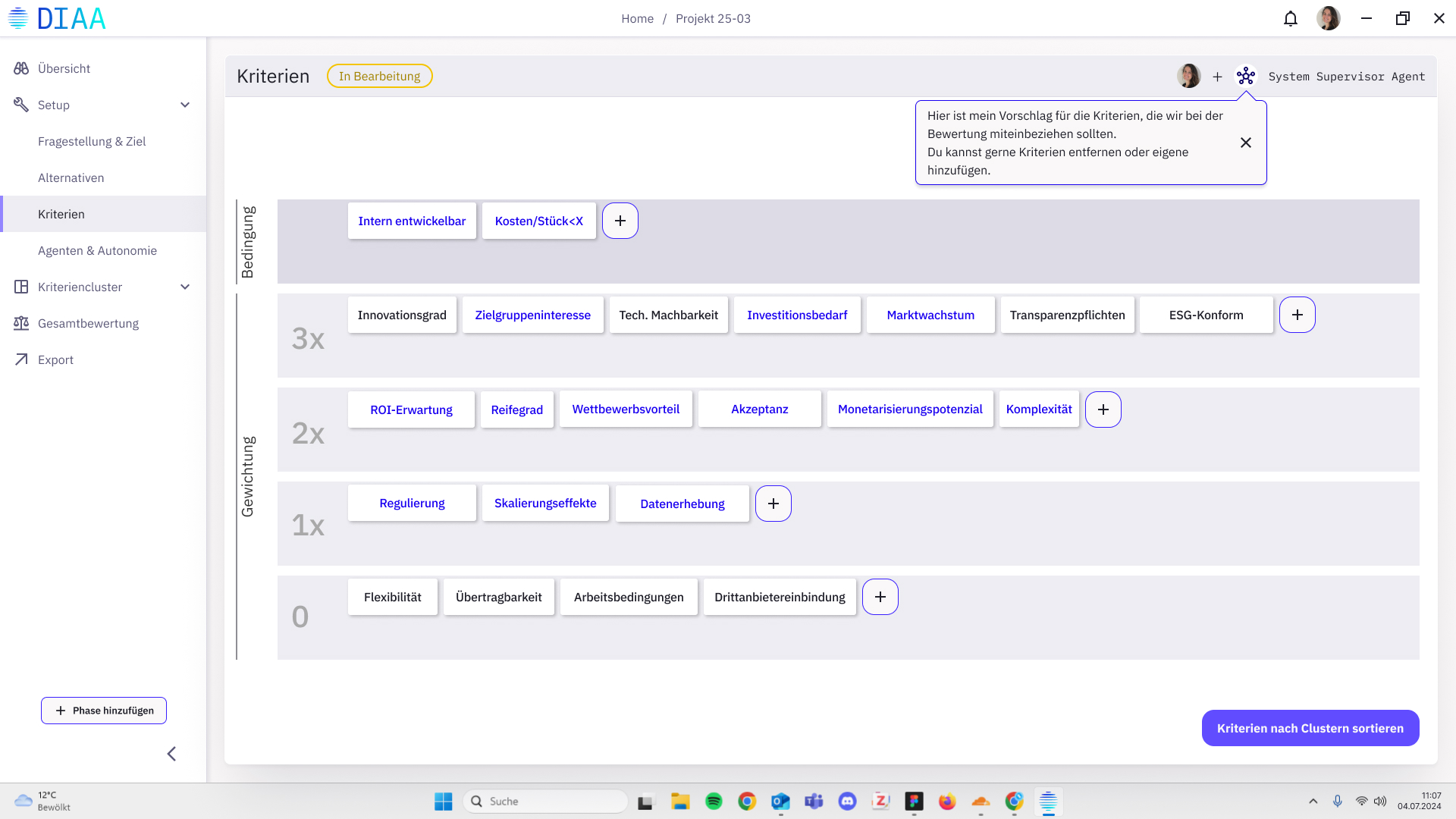 Im Anschluss wählt der/die Entscheidungsträger:in passende Kriterien aus, die bei der Bewertung der Alternativen berücksichtigt werden sollen, um die Entscheidung zu informieren. Durch die Flexibilität bei der Auswahl der Kriterien ist sichergestellt, dass diese zur konkreten Entscheidungsfrage passen und auch an den individuellen Unternehmenszielen ausgerichtet werden können. Die Kriterien werden dann in thematische Cluster sortiert, um im weiteren Prozess für Übersichtlichkeit zu sorgen.