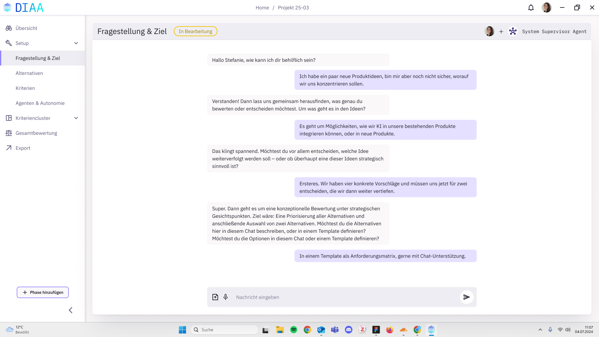 Das Setup beginnt damit, dass Entscheidungsträger:in und der übergeordnete System Supervisor Agent Fragestellung und Ziel des Entscheidungsprozesses definieren. Darauf folgt eine Festlegung der Alternativen, welche zur Auswahl stehen.