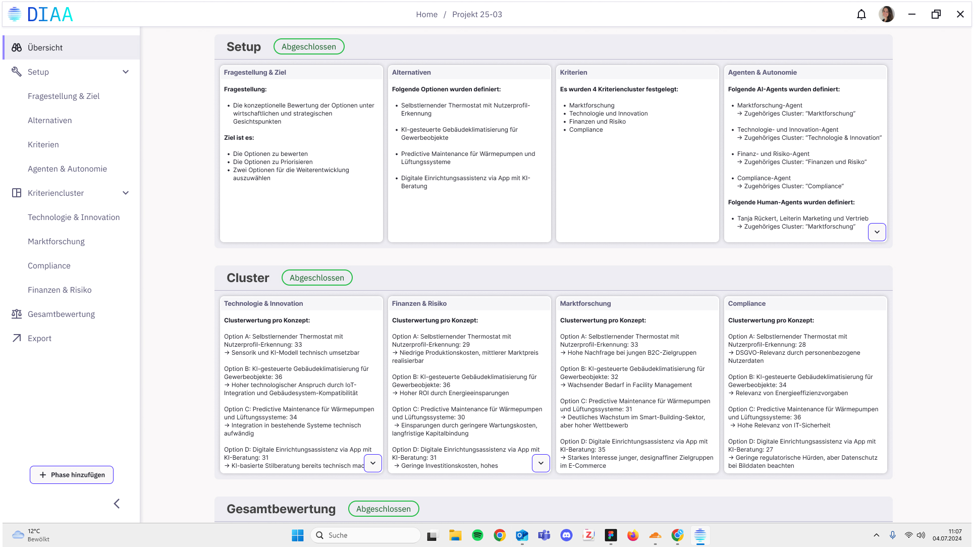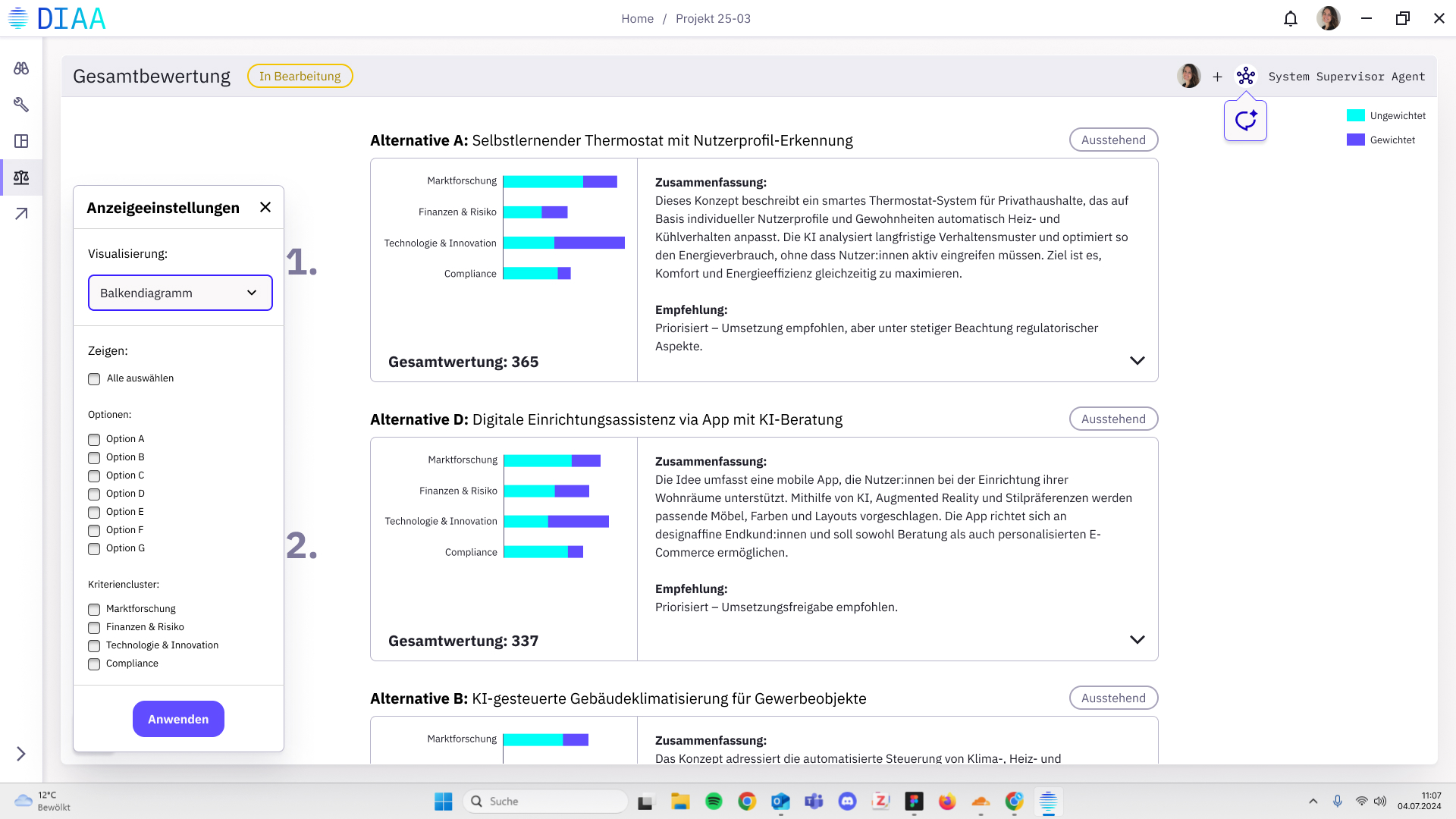 Liegen alle Bewertungen vor, so kann der/die Entscheidungsträger:in die Gesamtbewertung einsehen. Dort werden die einzelnen Bewertungen vom System Supervisor Agent übersichtlich zusammengeführt und eine begründete Priorisierung der Alternativen vorgenommen. Bei Bedarf können die einzelnen Bewertungen durch den/die Entscheidungsträger:in auch nochmal auf ihre Begründungen innerhalb der Cluster überprüft werden – um dann eine Entscheidung (mit ebenfalls dokumentierter Begründung) zu treffen.