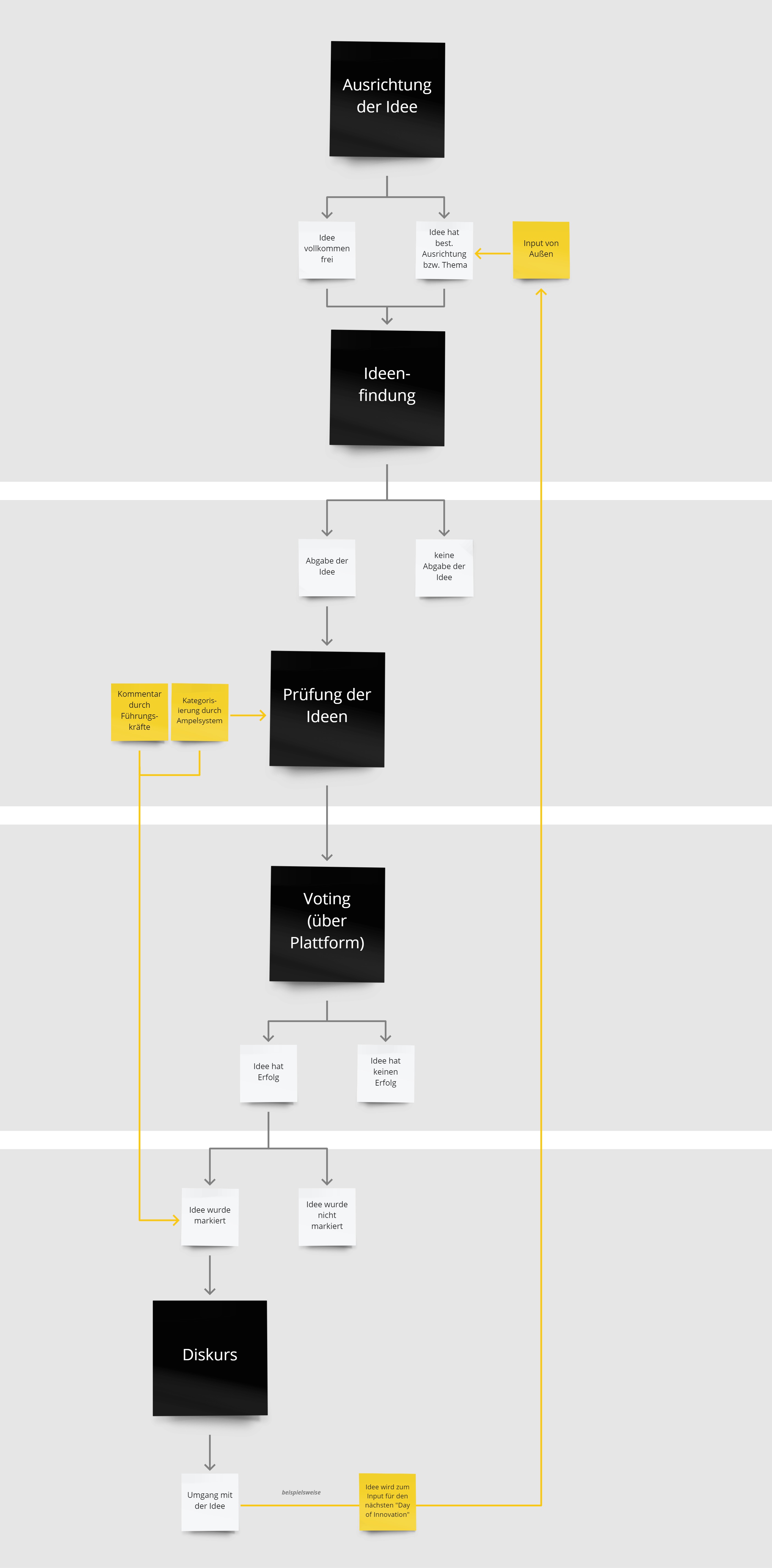 Der strategische Ansatz, der sich aus dieser Annahme heraus kristallisierte, lautete konkret: Entscheidungsprozessen werden in Unternehmen durch Führungskräfte bestimmt. Hierarchische Prozesse sind auch im Innovationsbereich weit verbreitet. Der einzelne Mitarbeiter:innen hat das Gefühl kaum oder gar kein Mitspracherecht zu haben, wodurch die Kreativität stagniert. Es müssen Lösungen geschaffen werden, die Ideenhierarchien durchbrechen.