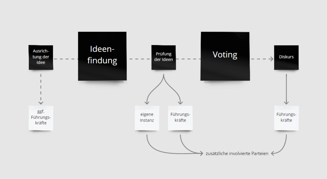 Voting: Am “Day of Voting” werden den Mitarbeiter:innen die gesammelten Ideen zur Verfügung gestellt. Damit sie die Ideen bewerten können, wird ihnen dafür am besagten Tag ein Zeitfenster zur Verfügung gestellt, dass Umfang und Ausarbeitung der Ideen entspricht.
