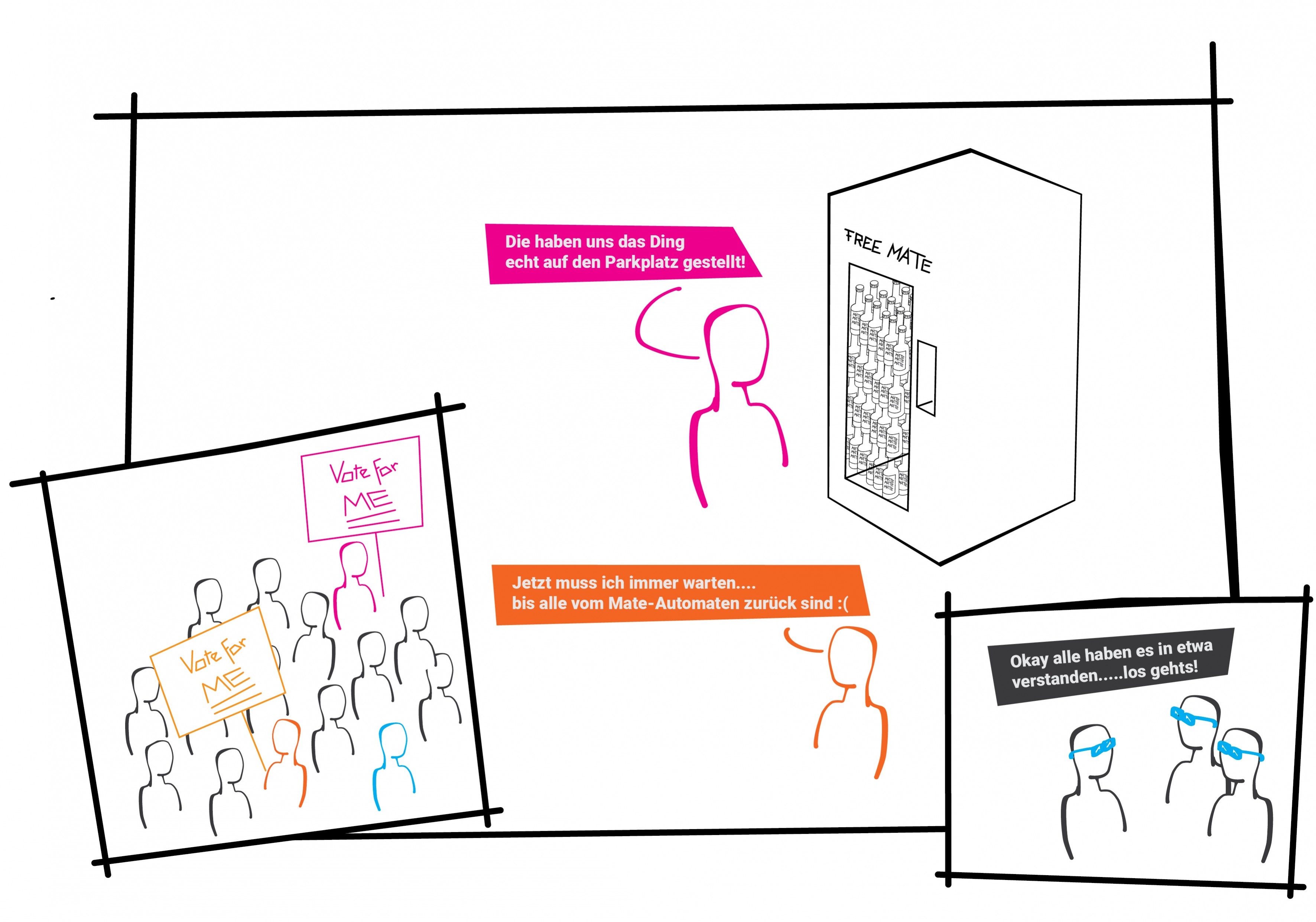 Die Mitarbeiter:innen des Unternehmens ETAM lieben das Getränk “Mate”. Deshalb plant das Leadership, um den Mitarbeiter:innen die Konsequenzen ihrer Abstimmung zu verdeutlichen, ein Voting über eine Neuplatzierung. An diesem niederkomplexen Beispiel ziehen die Mitarbeiter folgende Learnings: