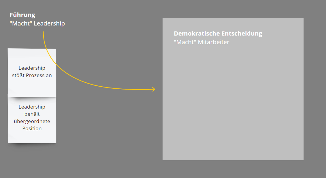 In unserem Konzept soll das Führungspersonal eine Umstrukturierung traditioneller Entscheidungsprozesse anstoßen. Das heißt Leader sollen sich für neue (demokratische) Prozesse stark machen, um die Kreativität der Mitarbeiter:innen zu fördern. Vollkommen klar ist dabei auch, dass es zunächst einen oder mehrere Testläufe benötigt, ehe eine demokratische Entscheidungsfindung fundamental in der Unternehmenskultur verankert werden kann.