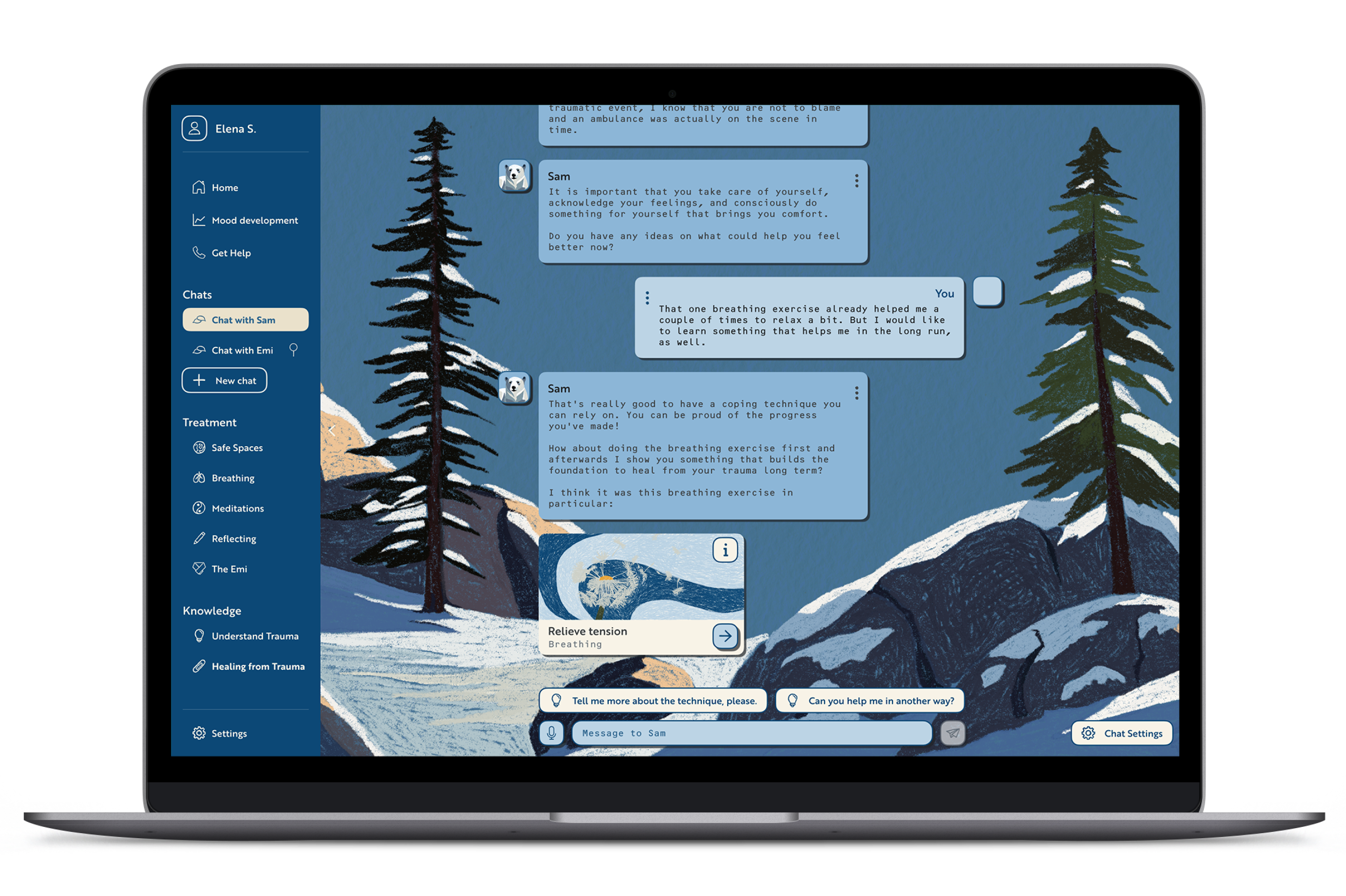 AI not only fills the gap of missing social support, it also guides the user to and through practical treatment methods. In addition it provides the user with the knowledge they need, to understand their trauma, which empowers them to make the right decisions in their healing process.