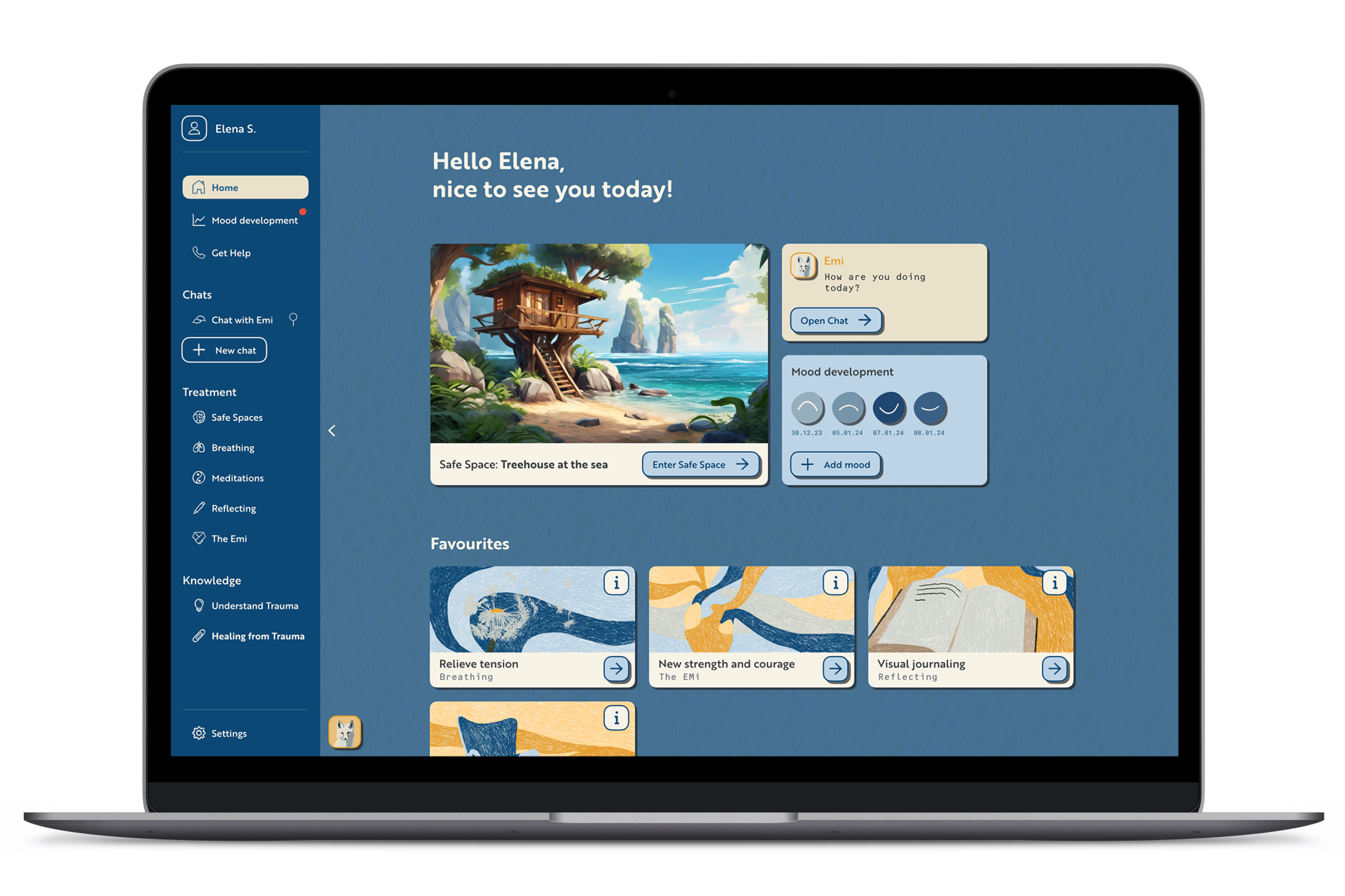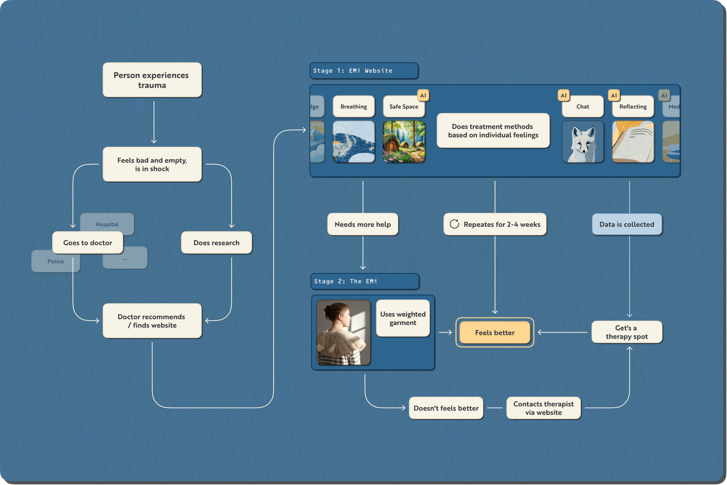 EMi is a support system that provides immediate and personal aid for people after a traumatic experience. It consists of an Al-supported web application and a weighted garment as a therapeutic grounding method. Through the fast accessible website traumatized people are supported to get through that challenging time.
