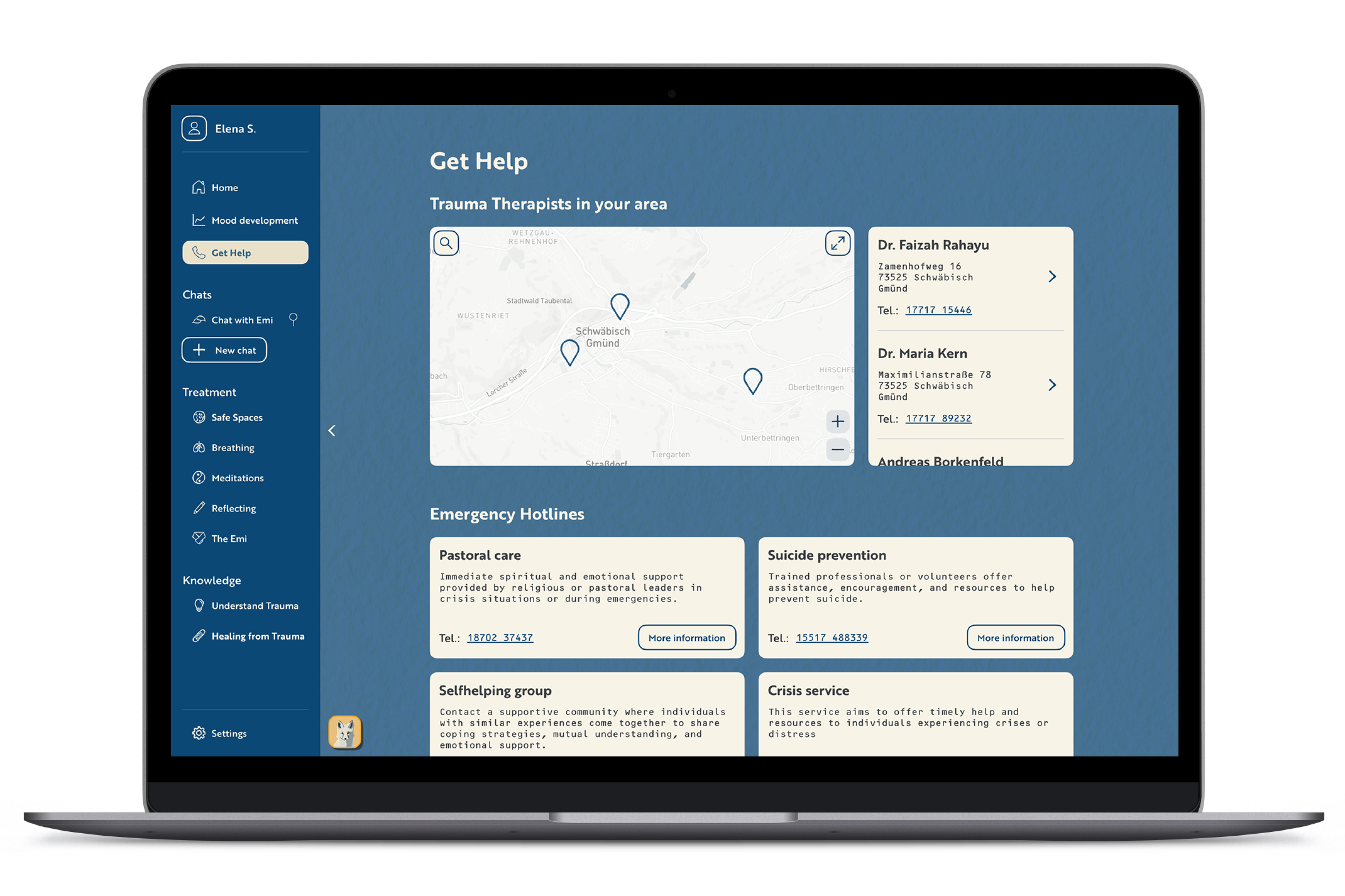 It is important the user has access to professional help through the application. Doing research to find therapy can be a big burden, when suffering from the aftereffects of a traumatic event. The AI can recommend the user to attend therapy via the chat and suggests certain therapists in their area.