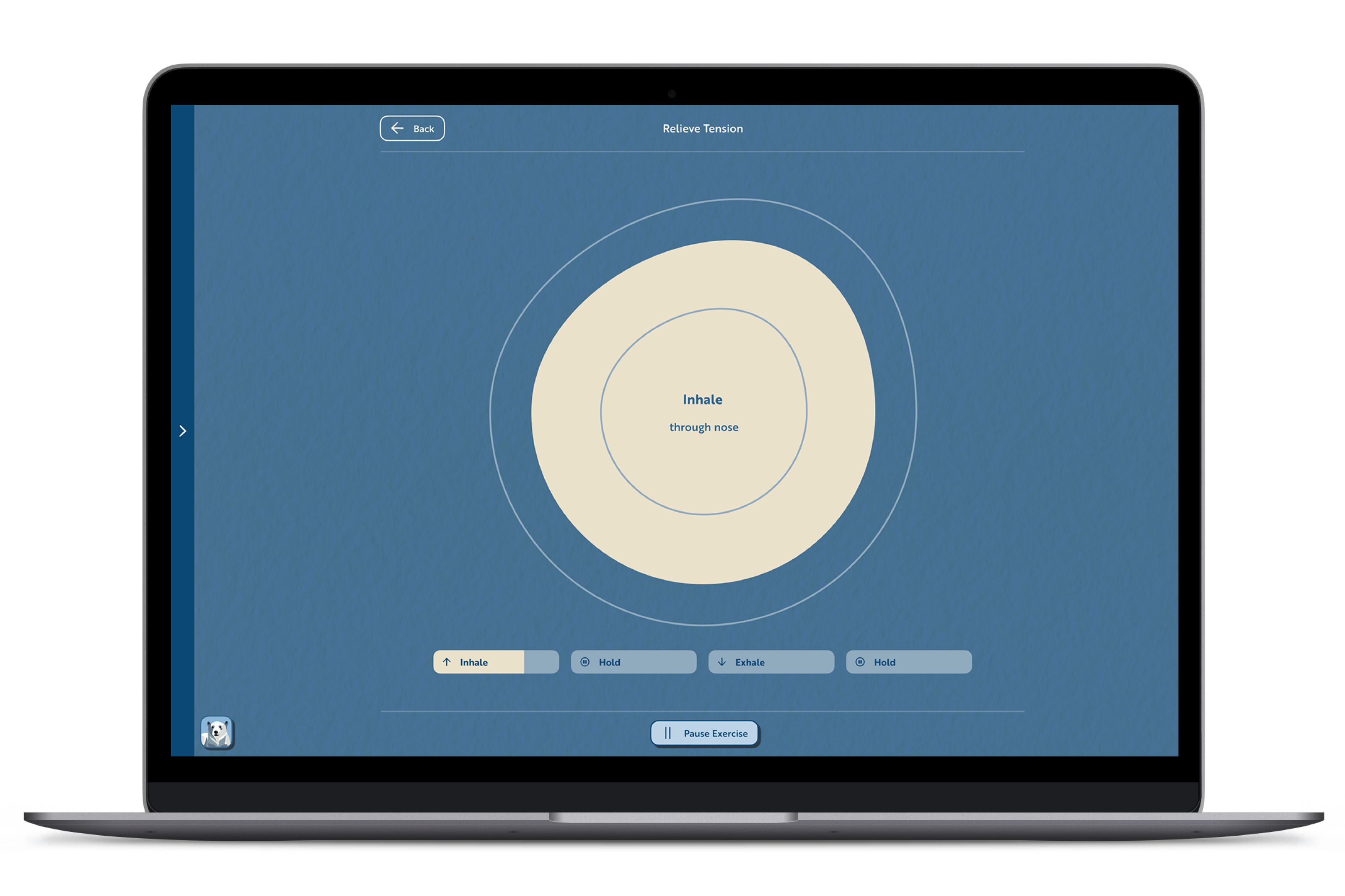 Breathing exercises are suitable to calm the nervous system and connect back to the body. The user is guided by a circle that resembles their own breath. This helps to focus on the breathing, without thinking too much about the breathing pattern.