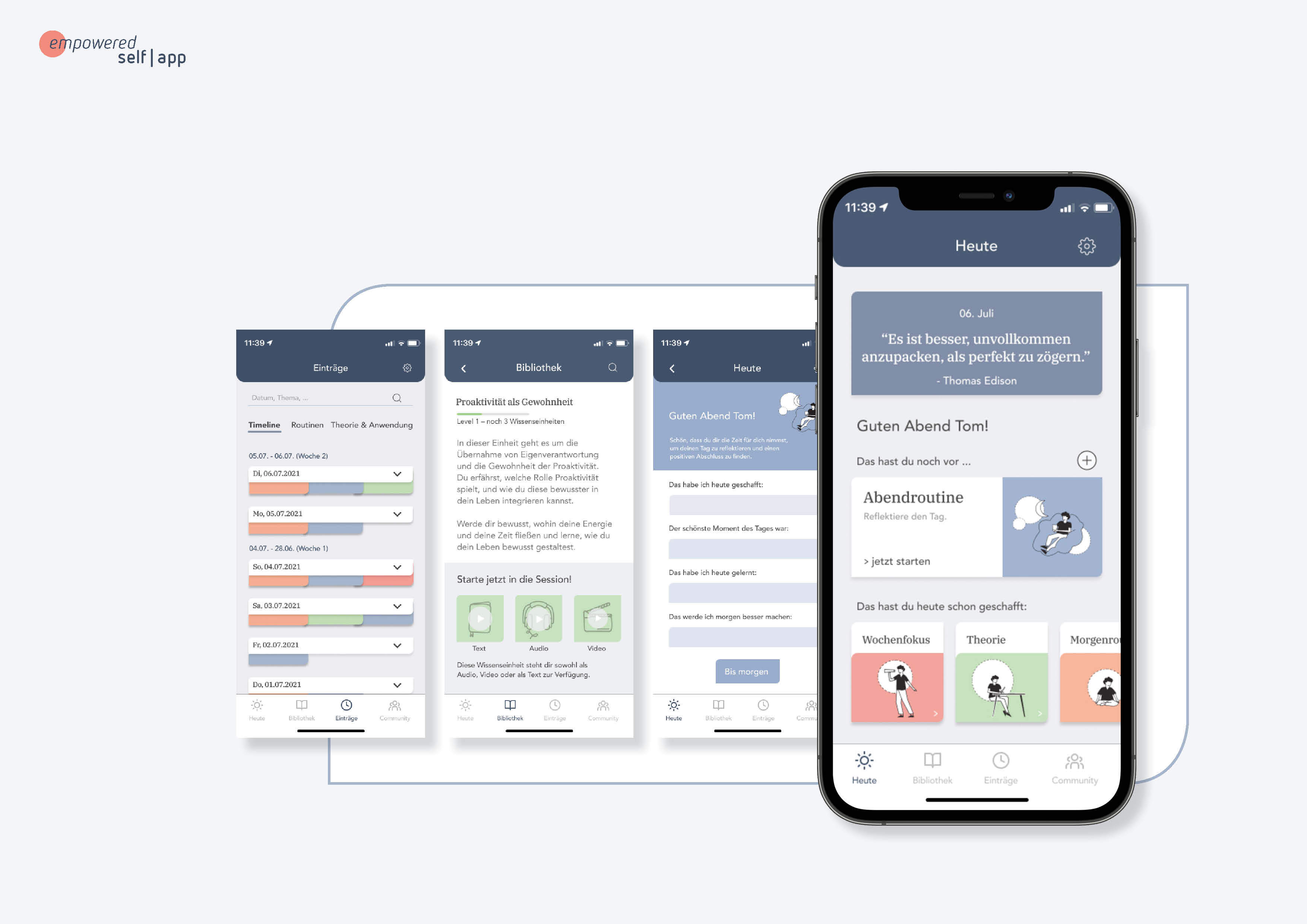 Die EmpoweredSelf App ermöglicht eine noch intensivere Auseinandersetzung mit dem Thema Persönlichkeitsentwicklung. Sie basiert auf dem gleichen Konzept wie EmpoweredSelf Cards. Durch die Erweiterung des analogen um ein digitales Handling, kann sich der Nutzer ganz individuell seine eigenen Routinen aus diversen Elementen zusammenstellen. Außerdem verfügt die EmpoweredSelf App über eine Bibliothek, die vielfältige Wissenseinheiten und dazugehörige Übungen enthält, um sich aktiv im Themengebiet der Persönlichkeitsentwicklung weiterzubilden. Darüber enthält sie eine Bandbreite an Meditationen.