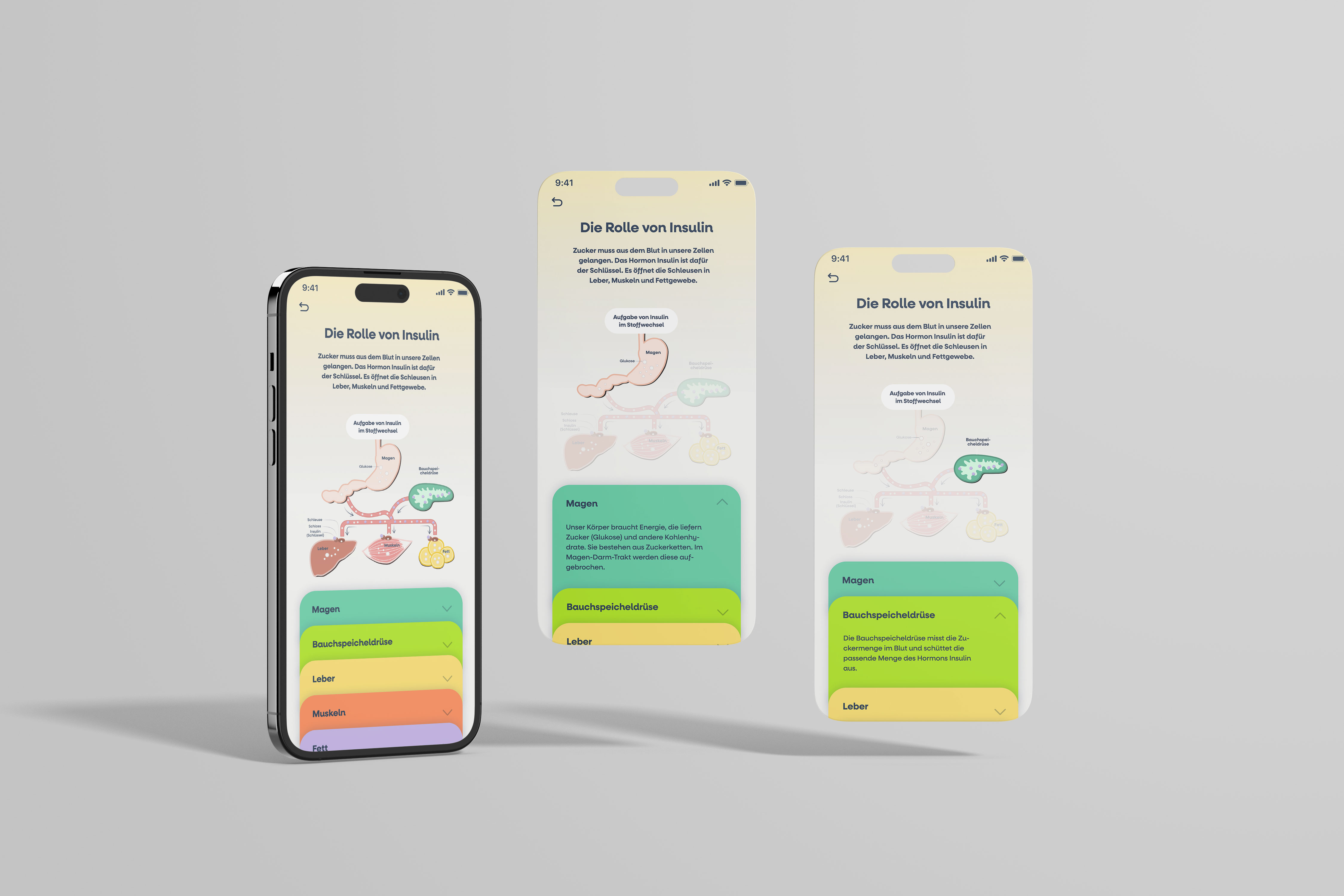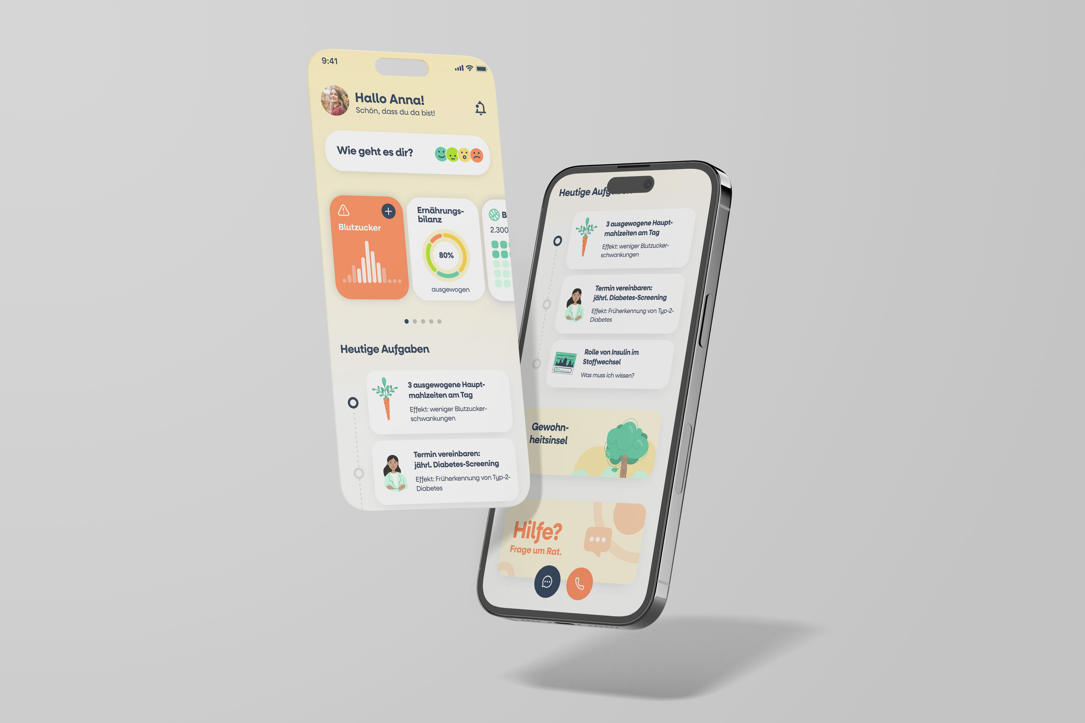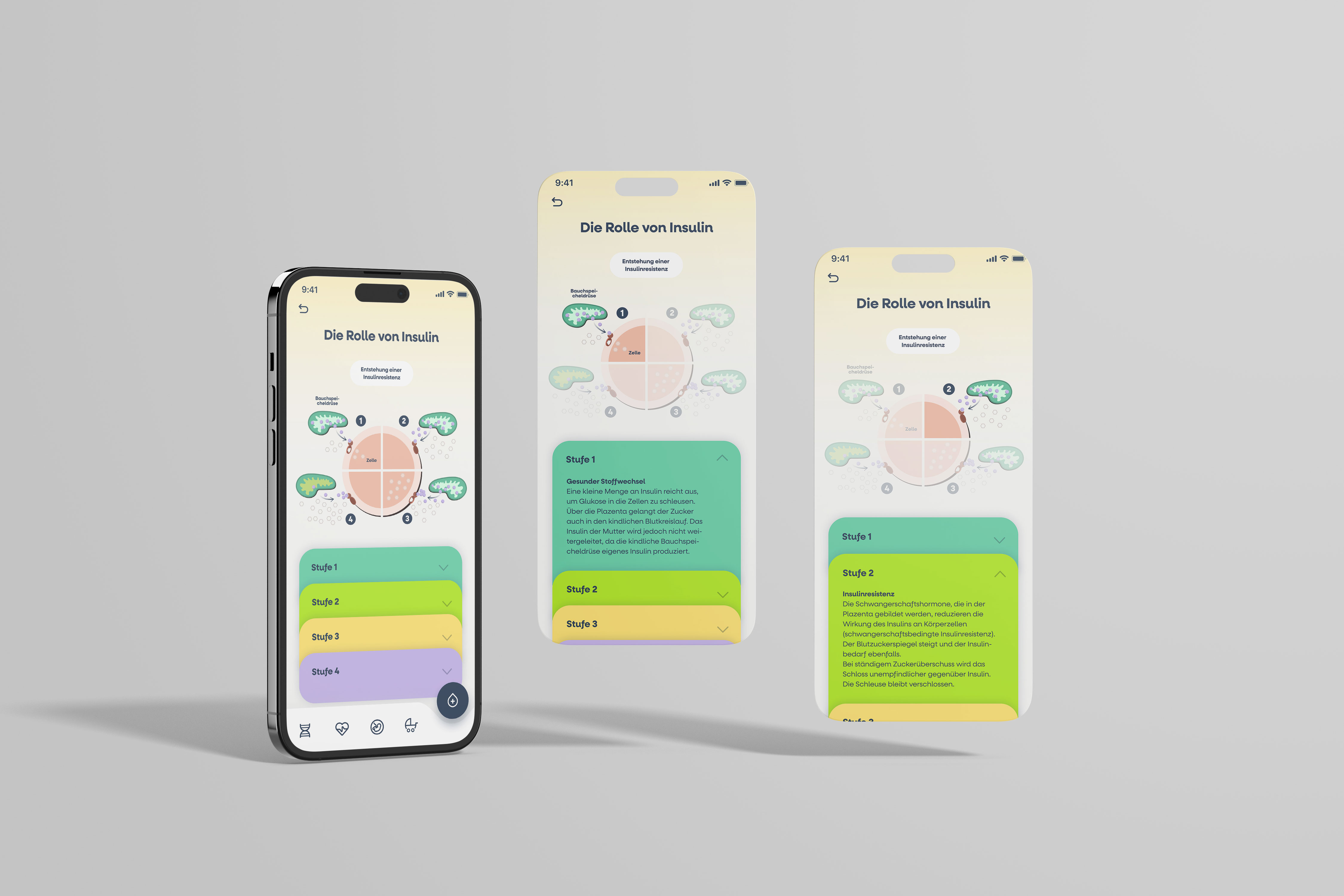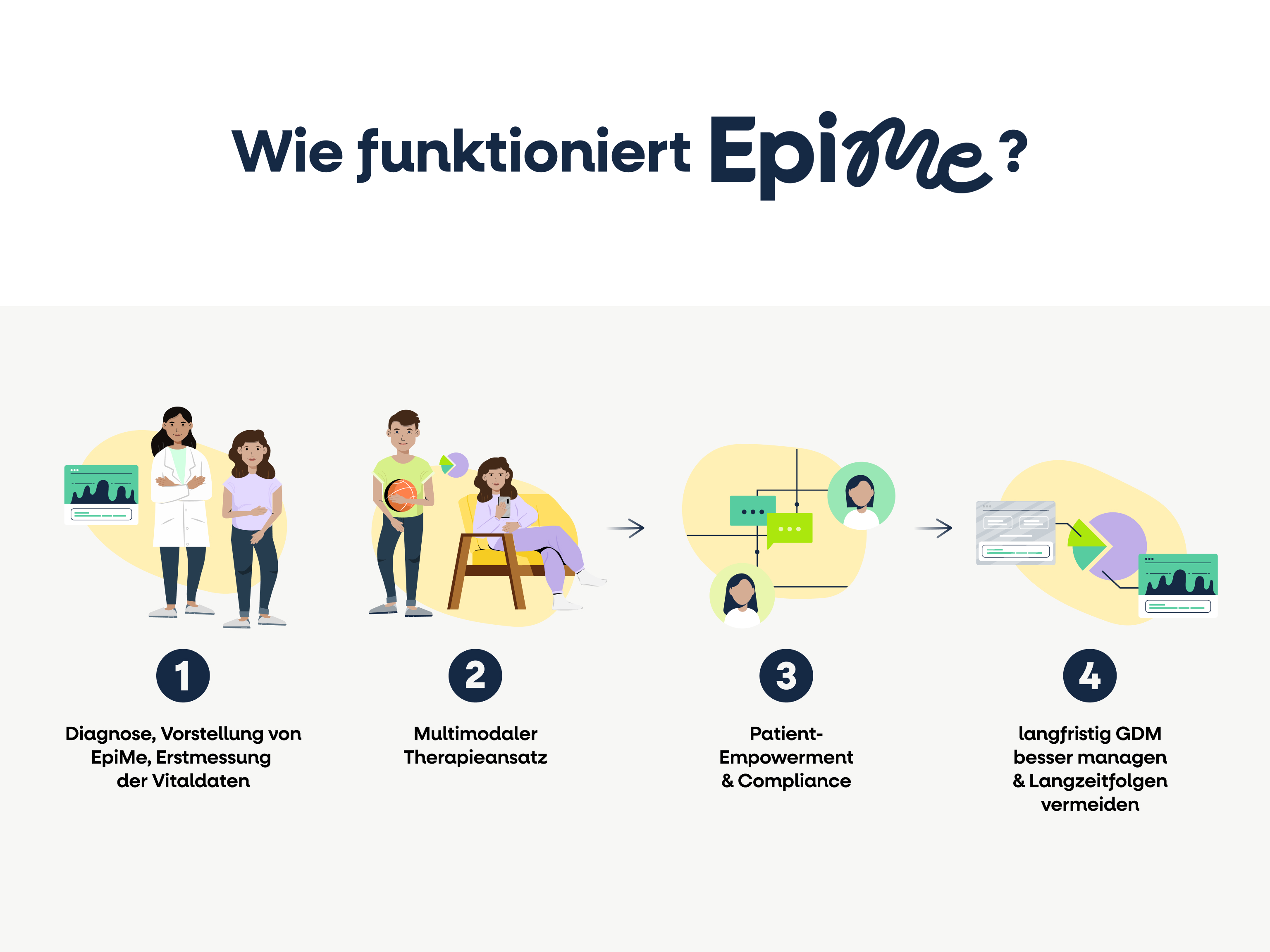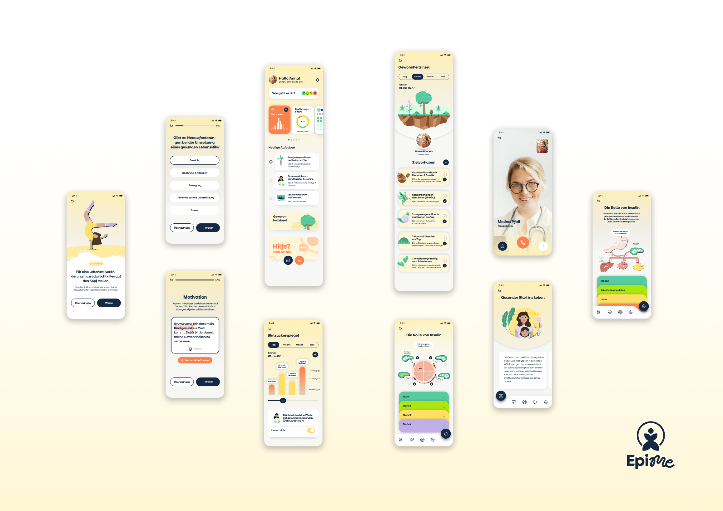 Das Ergebnis ist die fiktive digitale Gesundheitsanwendung „EpiMe“, speziell konzipiert für die Risikogruppe der GDM-Betroffenen. Schwangere werden durch die App befähigt, informierte Entscheidungen für ihre Gesundheit und die ihres Kindes zu treffen. Sie unterstützt das Verständnis des Präventionspotenzials der ersten 1000 Tage, die Umsetzung personalisierter gesundheitsförderlicher Lebensstilinterventionen und das erfolgreiche Management des Gestationsdiabetes. Das niedrigschwellige Angebot ergänzt die ärztliche Therapie und hilft den Schwangeren, ihre Behandlungsziele zu erreichen, um gesundheitliche Komplikationen zu vermeiden und die Gesundheit von Mutter und Kind zu fördern. „EpiMe“ integriert einen multimodalen Therapieansatz, der Aufklärung, Motivation, persönliche Ziele und kontinuierliches Monitoring vereint, was eine umfassende und individuelle Betreuung ermöglicht.