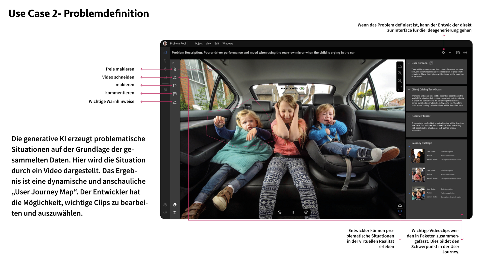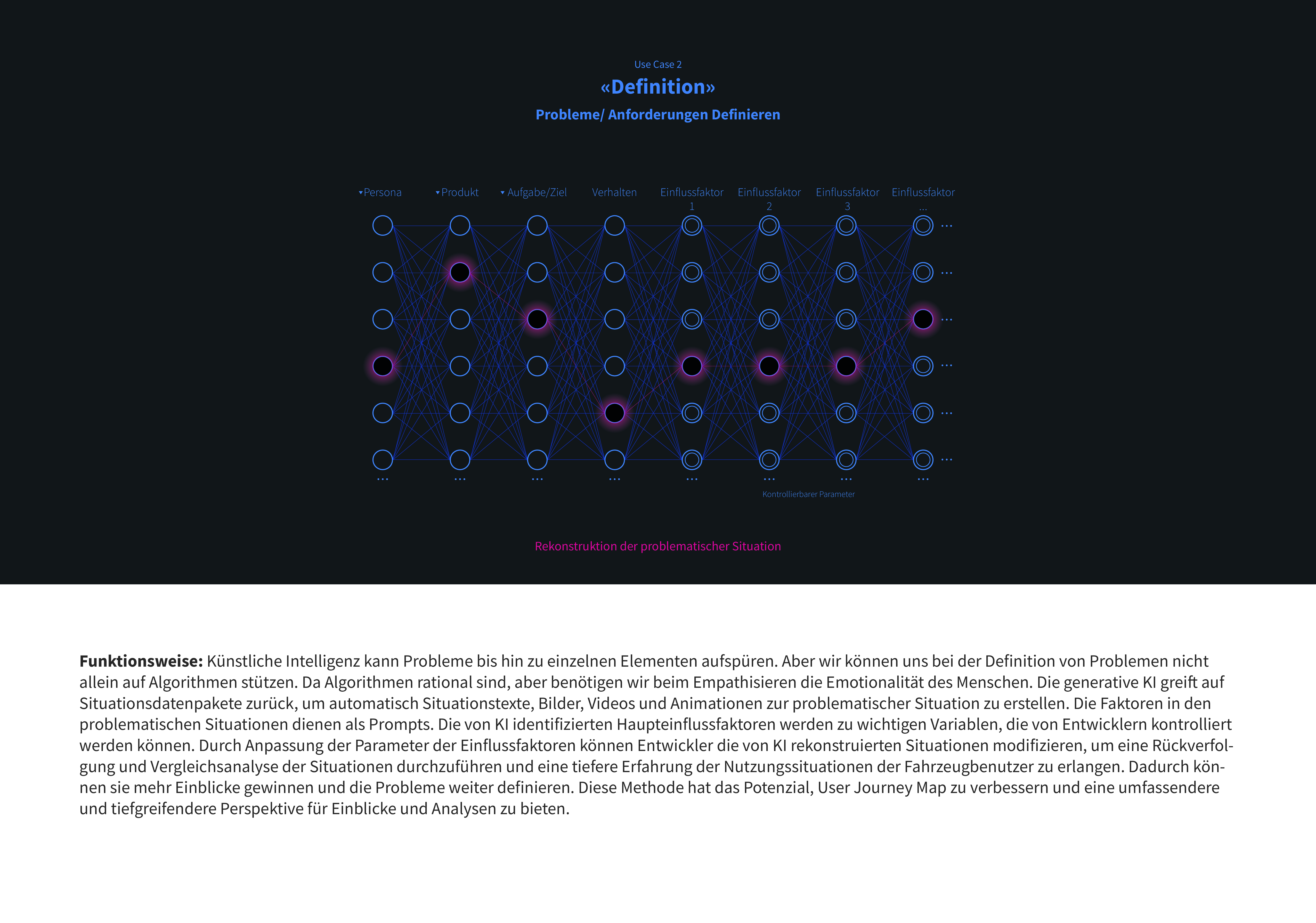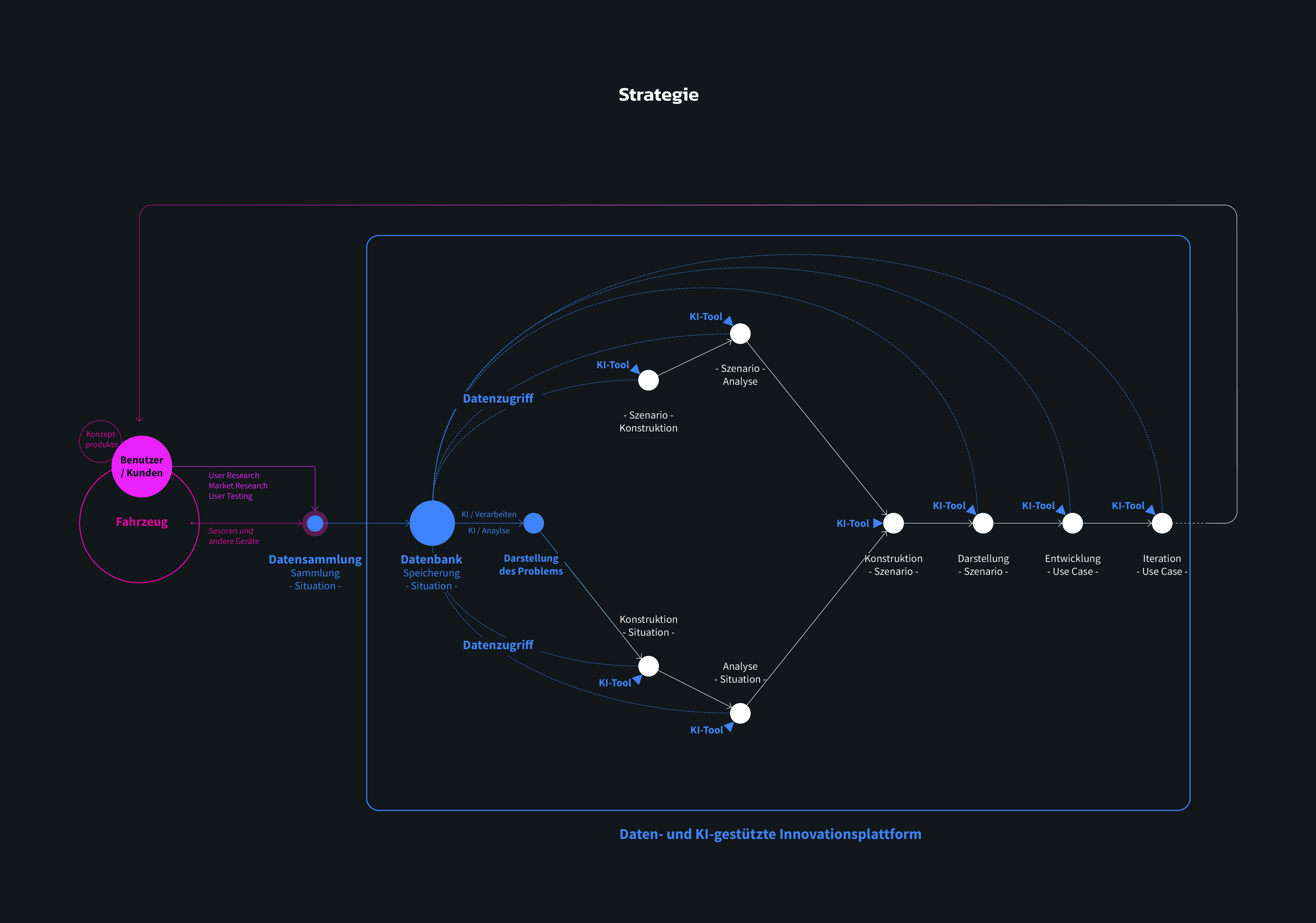 Dieses Projekt bietet einen Ansatz und Prinzipien für die Nutzung und Verwaltung von Situationsdaten, die auf dem Wert von Daten basieren, der durch die Entwicklung des Automobils entstanden ist. Mit diesen Ansätze und Prinzipien können mit Hilfe von künstlicher Intelligenz Innovationswerkzeuge entwickelt werden, die sich auf das User Experience Thinking konzentrieren. Gleichzeitig bilden diese Werkzeuge zusammen eine von Daten und künstlicher Intelligenz gestützte Innovationsplattform: