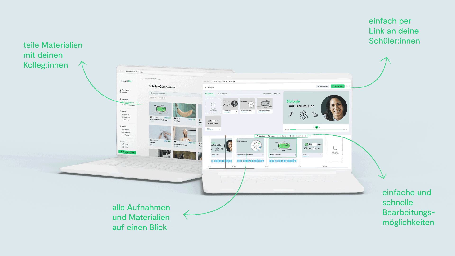 FlippEd Cut ist sowohl eine Videoplattform zum Teilen von Lehrvideos als auch ein Tool, um spielend einfach Lehrvideos selbst zu erstellen. Das Herausstechende an FlippEd Cut ist der reduzierte Funktionsumfang. Integriert wurden nur Funktionen, die wirklich wichtig sind, um Lehrvideos zu erstellen. Alle anderen wurden weggelassen oder automatisiert. So wollen wir einen einfachen, intuitiven und reibungslosen Einstieg in die Erstellung von Lehrvideos garantieren.