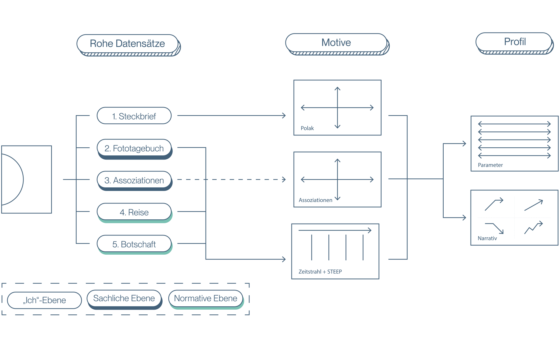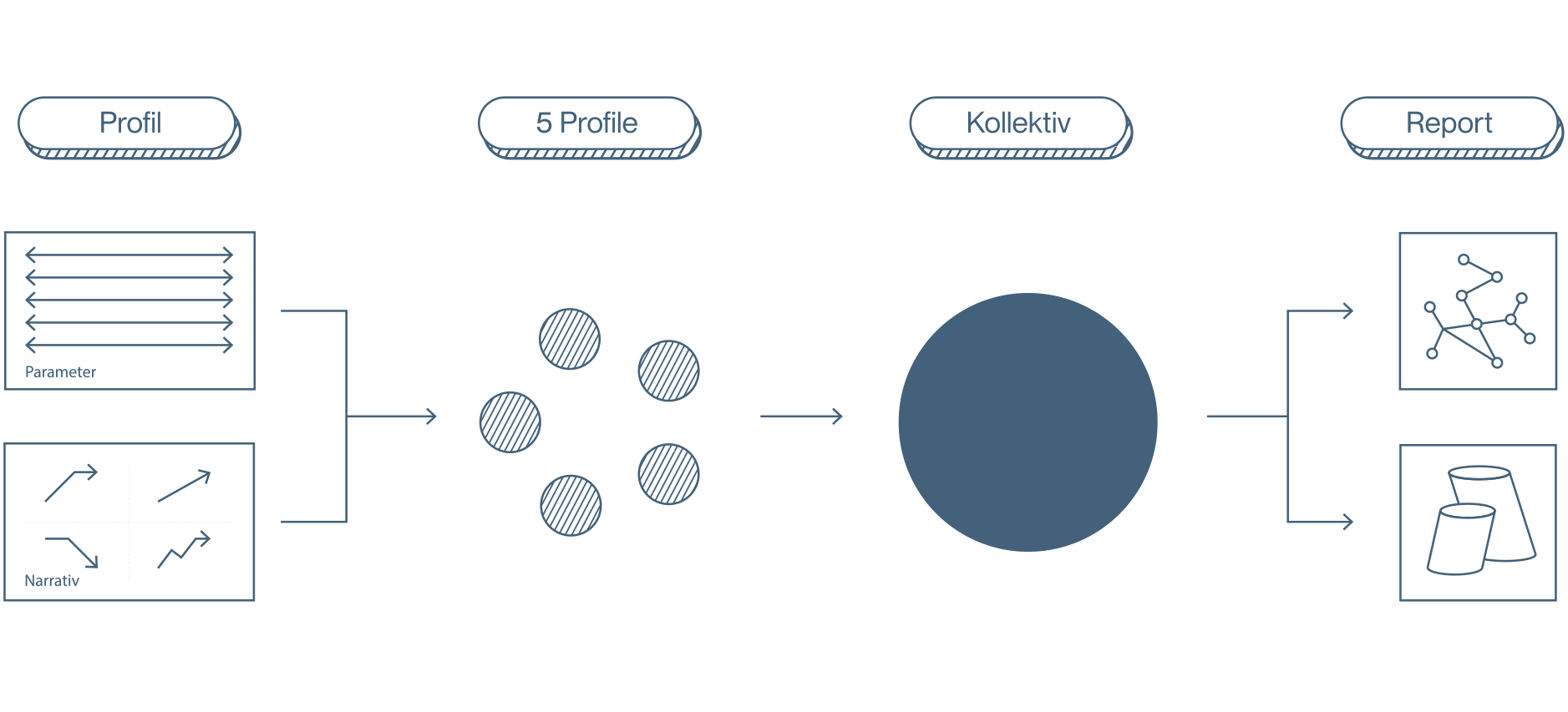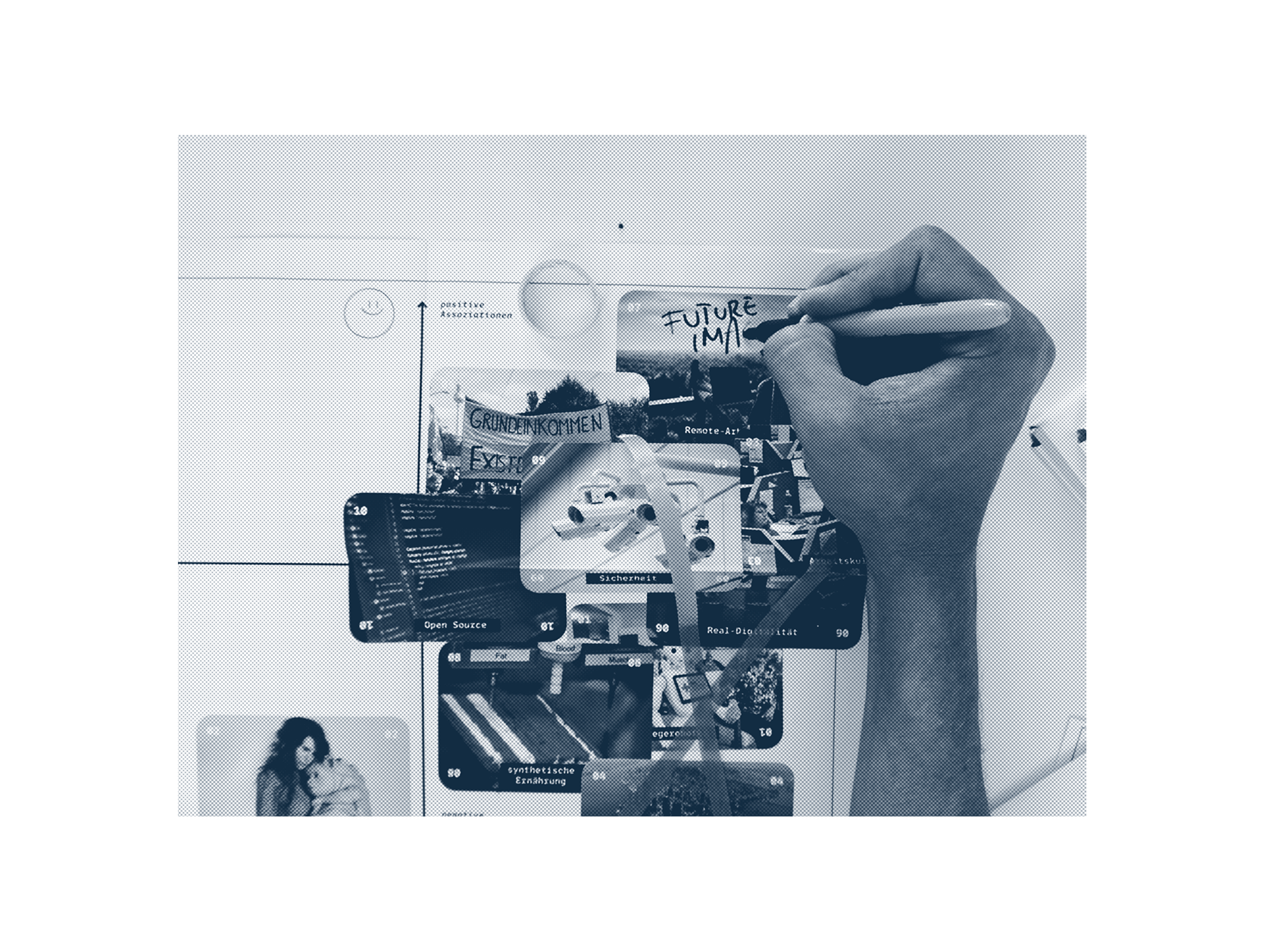 First, a cultural probe is used, the Experiment Zukunftserwartungen (experiment Future Expectations), and placed in the research field at four companies. The experiment serves to bring sample impressions of the individual future expectations of the members of an organization to the surface. This is followed by an analytical and interpretative evaluation, which is then combined into collective future expectations. The results are then presented for discussion in a report and a speculative scenario.