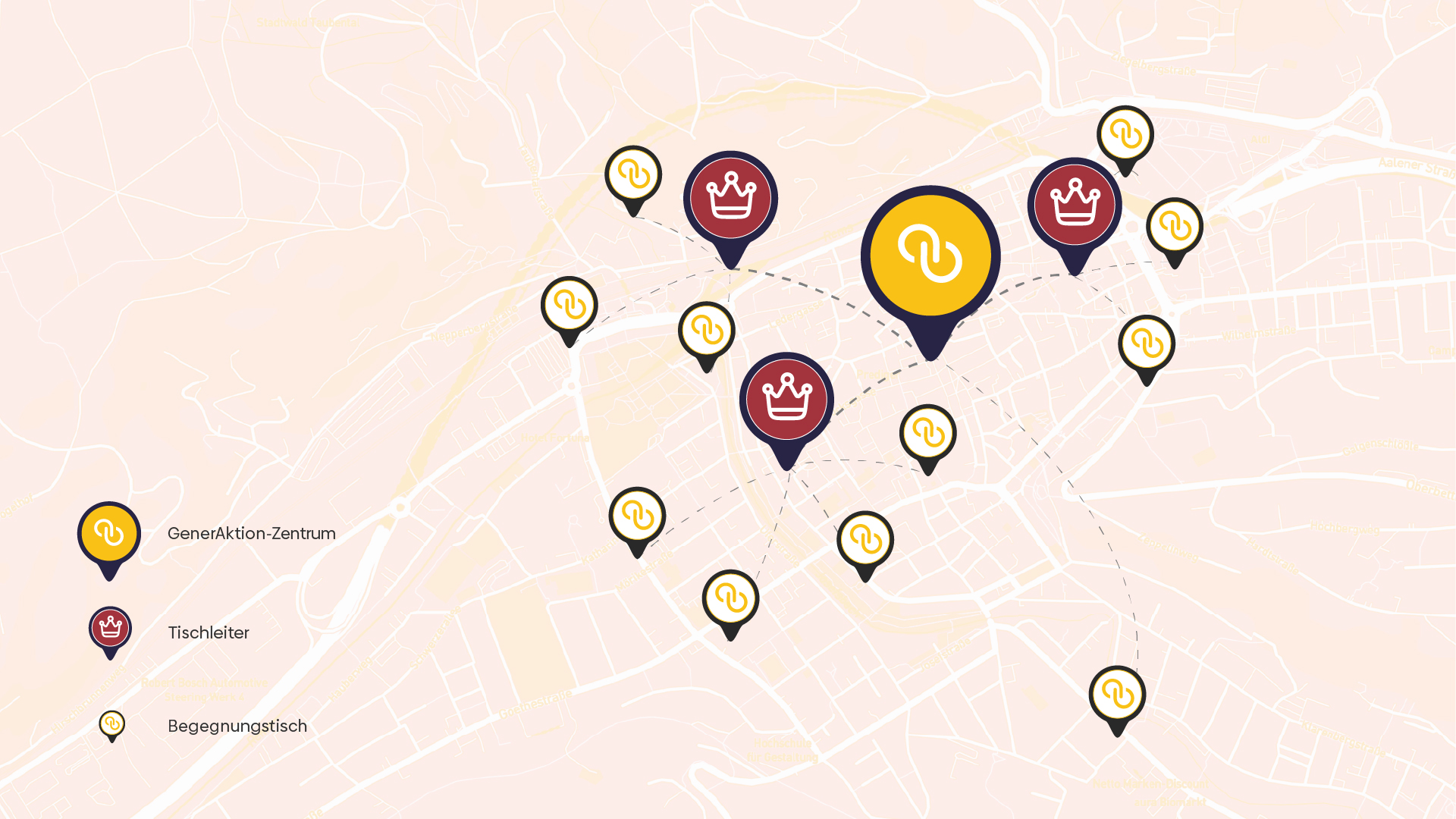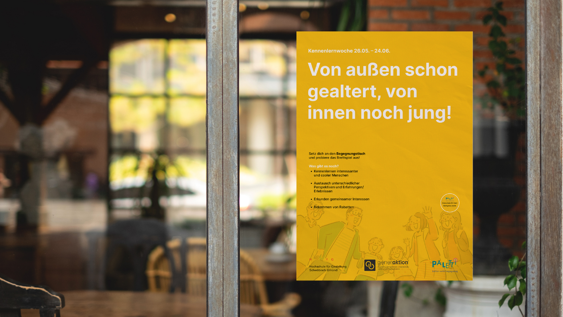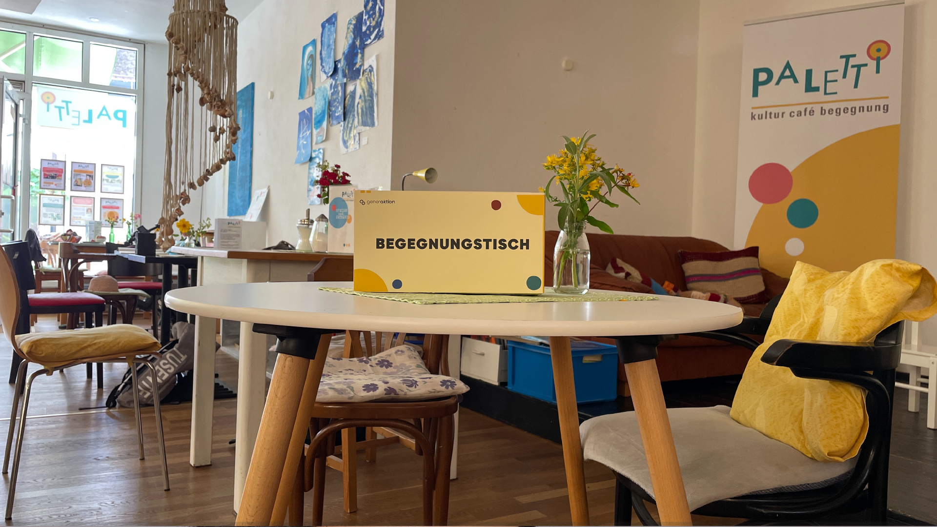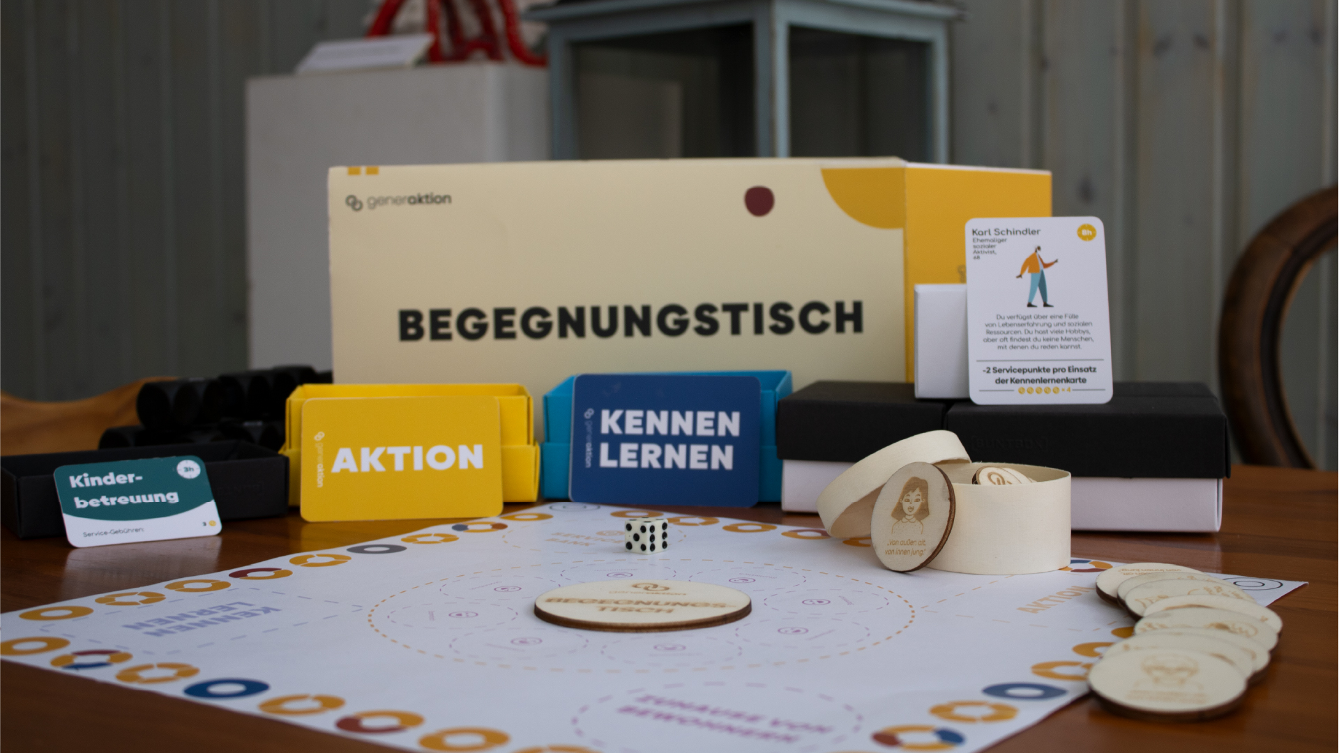 Die Begegnungstische sind in den verschiedensten Ecken der Stadt verteilt. Durch die Zusammenarbeit mit lokalen Geschäften wird es GenerAktion gewährt, ihre eigenen Begegnungstische in den Geschäften aufstellen oder vorhandene Tische nutzen, um eine Teilnahme aller Generationen zu ermöglichen. Um sicherzustellen, dass die Teilnehmer am Begegnungstisch auf natürliche Weise miteinander ins Gespräch kommen ist jeder Begegnungstisch mit einem Kennenlern-Kit ausgestattet.