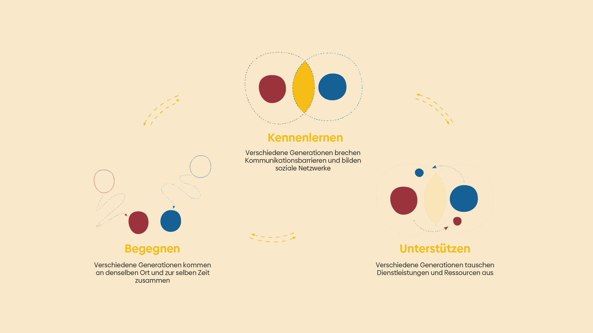 Intergenerationale Unterstützung kann den Austausch von Services, Ressourcen und Wissen zwischen den Generationen fördern und einen neuen sozialen Wert schaffen. Dieser Prozess fördert die Beteiligung der Senioren am sozialen Leben und ermöglicht der Jugend den Zugang zu Ressourcen und Wissen zur Bewältigung ihrer eigenen Herausforderungen im Alltag.