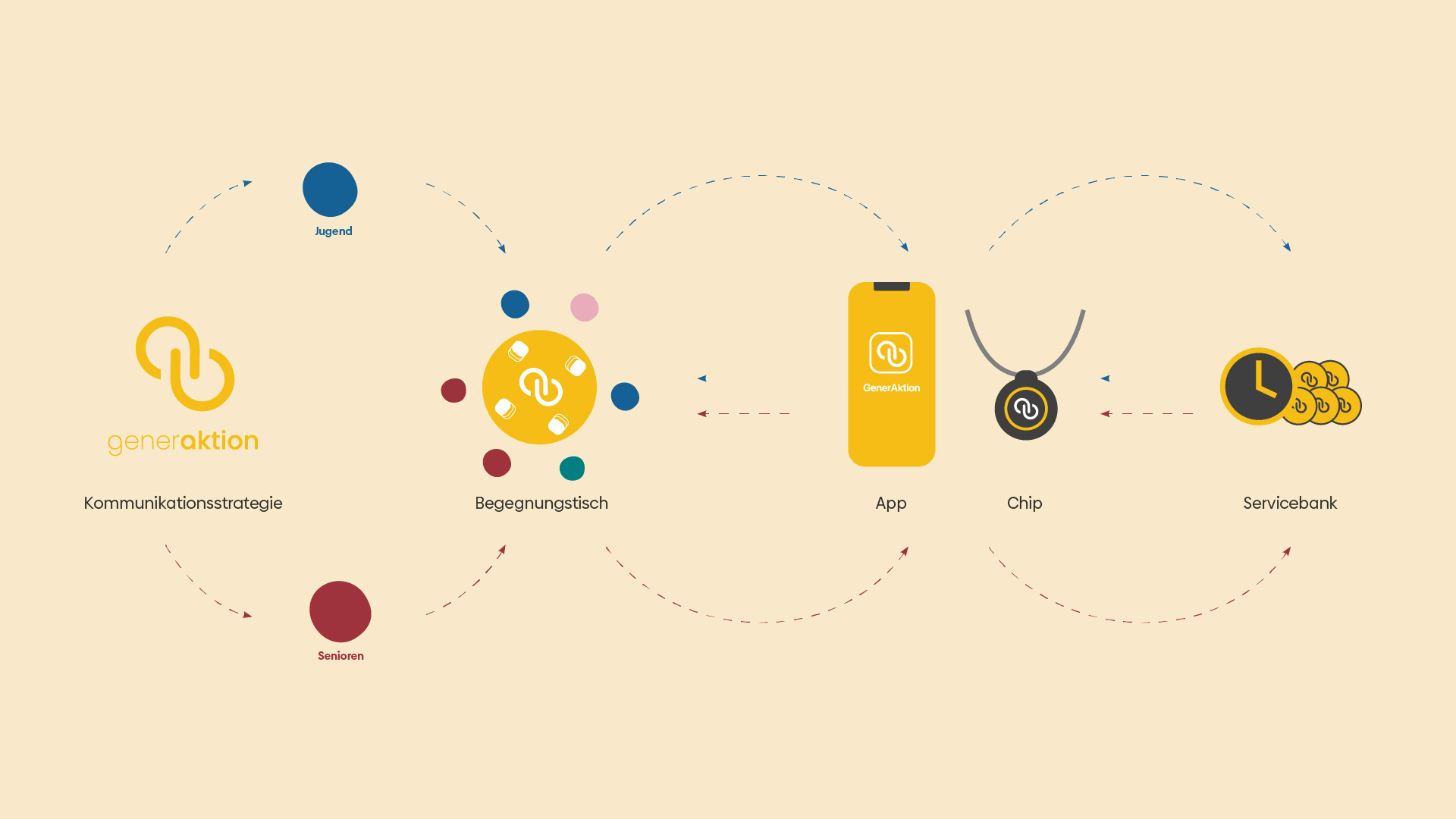 GenerAktion ist ein umfassendes Service System, welches darauf abzielt, den Austausch und die gegenseitige Unterstützung zwischen verschiedenen Generationen zu fördern, indem es eine Umgebung für Begegnungen und Bekanntschaften schafft. Durch die Prozesse des Begegnens, des Kennenlernens und des Unterstützens, soll die Beteiligungsfähigkeit von den Senioren gestärkt und die Motivationen zur Teilnahme der Jugend angeregt werden.
