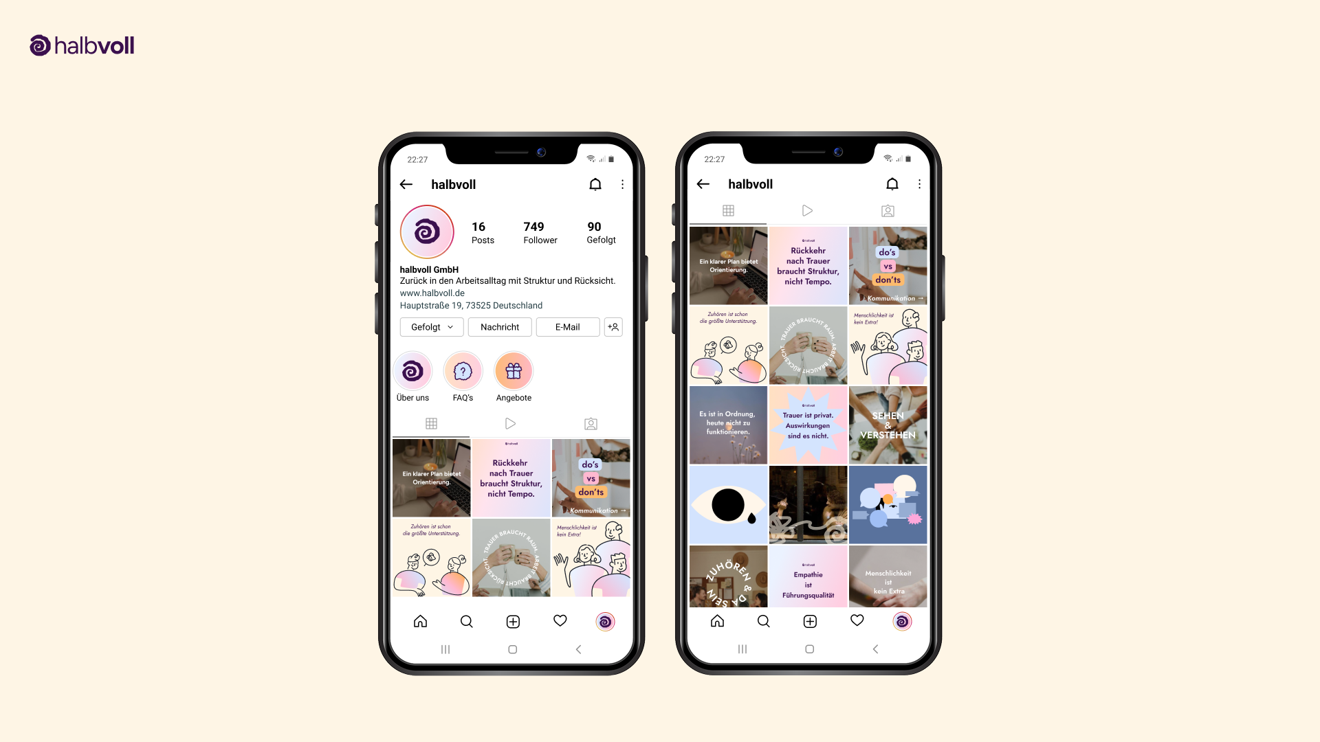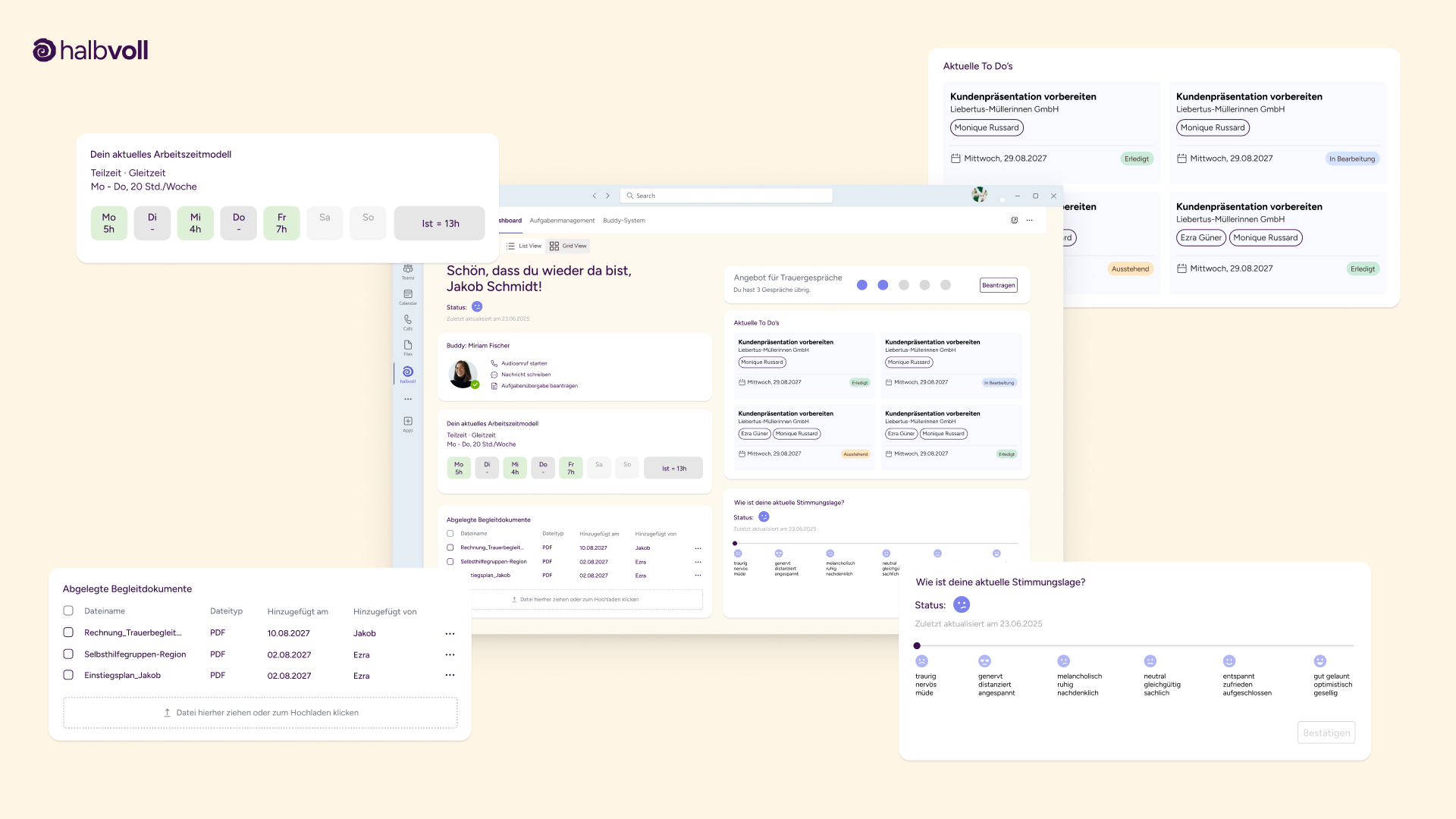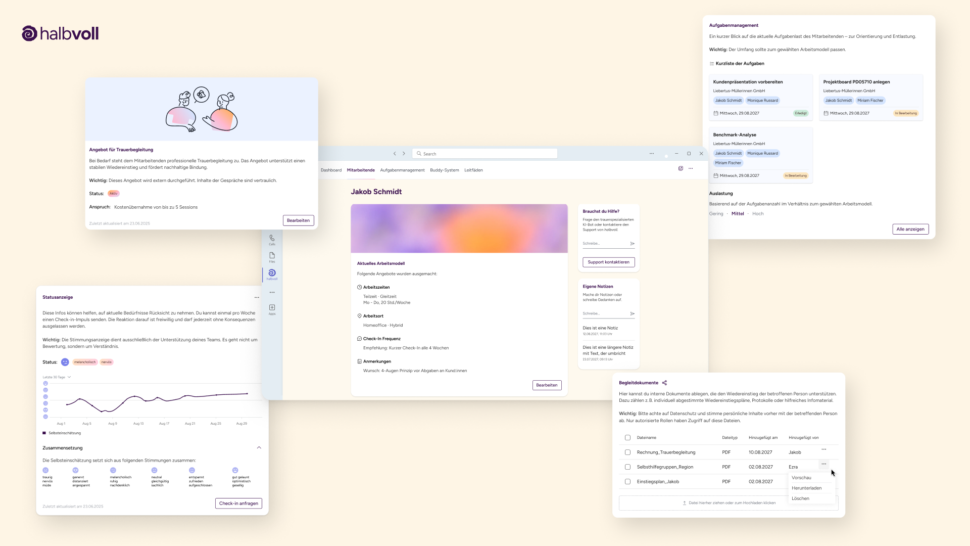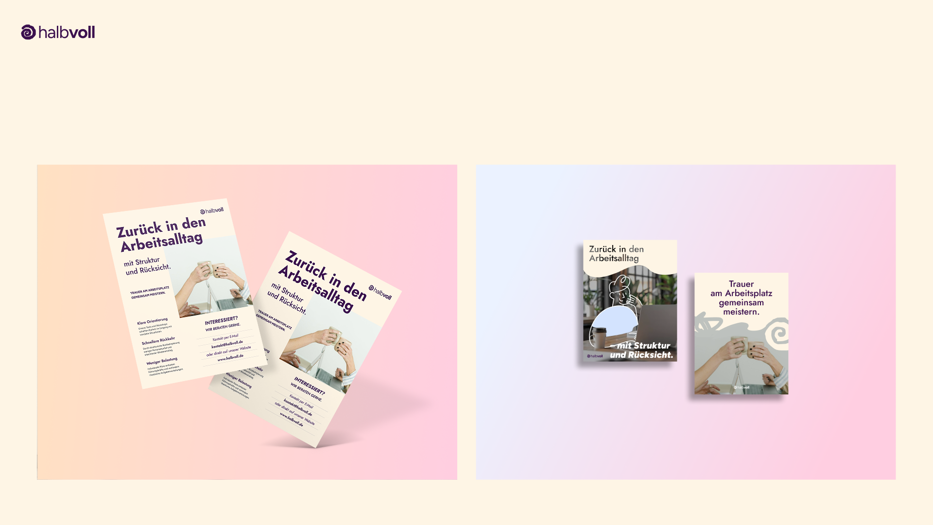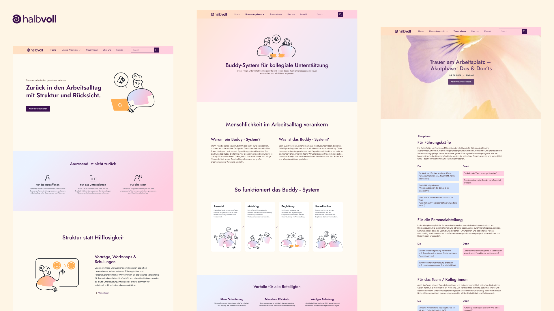 Unser Projekt „Halbvoll“ adressiert die strukturelle Leerstelle im Umgang mit Trauer am Arbeitsplatz. Ziel war es, Unternehmen konkrete, integrierbare Strategien zur Entlastung trauernder Mitarbeitender an die Hand zu geben. Unsere Lösung besteht aus einem modularen System, das Prävention, Begleitung und digitale Unterstützung vereint:
