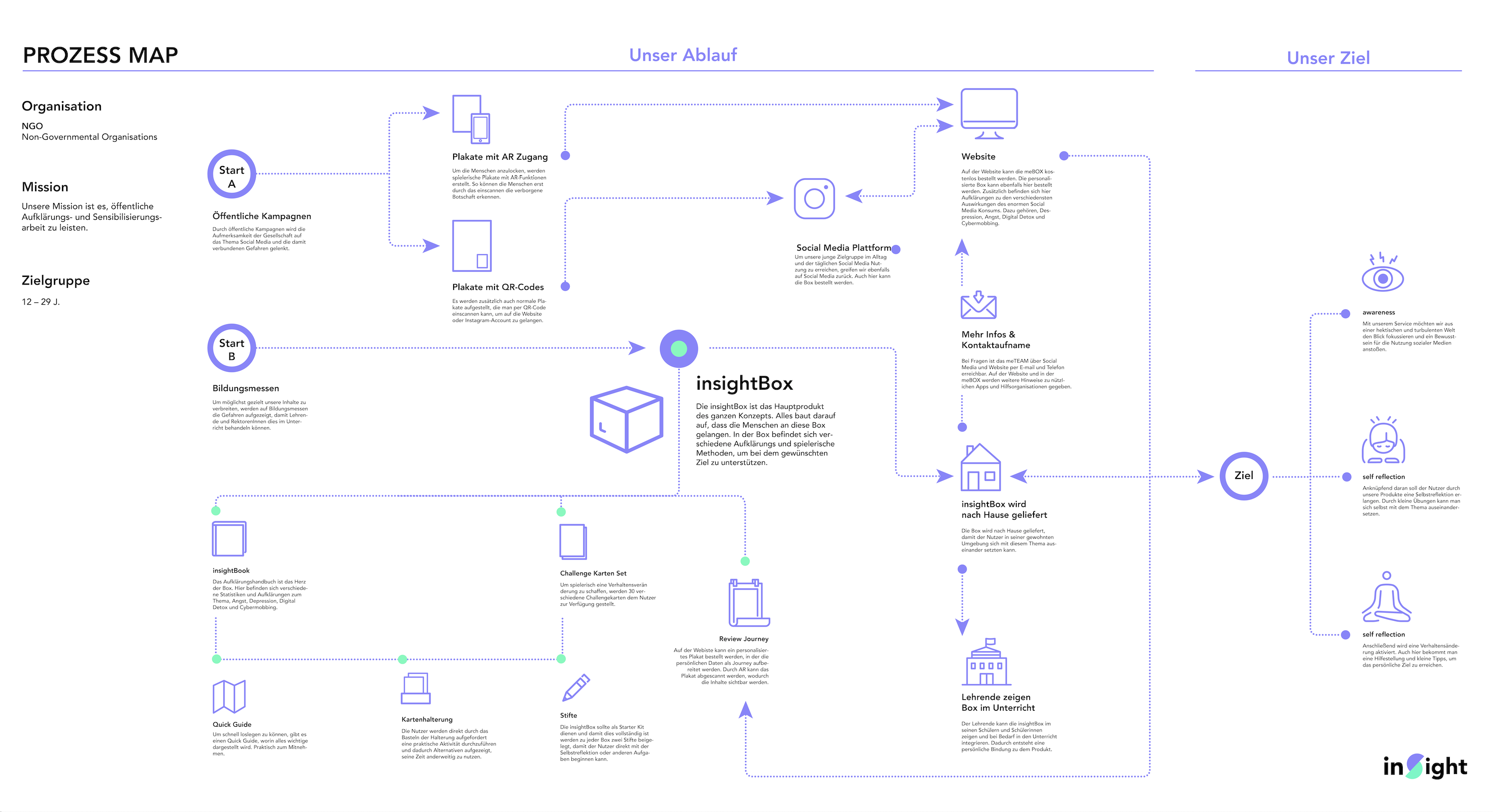 Hier abgebildet ist eine Gesamtübersicht unseres Konzepts mit ihren Verzweigungen und Elementen. Die Prozess Map zeigt alle Schritte und Entscheidungen innerhalb unseres Prozesses, die der Nutzer durchgehen kann und verdeutlicht zusätzlich alle notwendigen Schritte, die durchlaufen werden müssen, um unsere Mission zu erreichen.