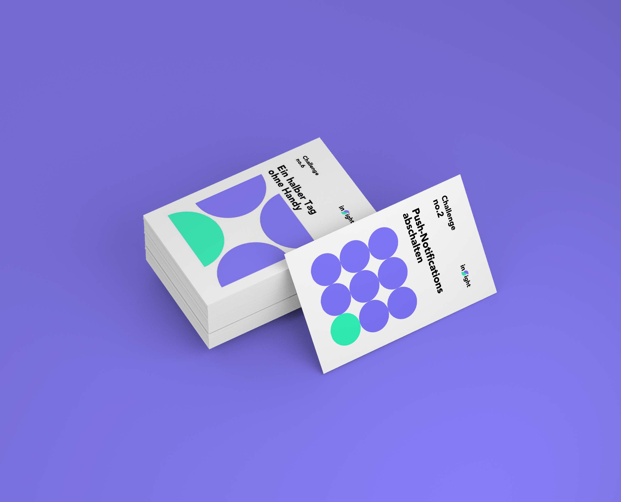 Unsere Challenge-Karten können ganz einfach in den Alltag integriert werden. Der Nutzer kann sich verschiedenen Herausforderungen stellen, wie "Essen am Tisch ohne Handy" oder "Ab 16 Uhr keine Push-Notifications." Die Challenges können alleine oder auch gut gemeinsam mit Freunden ausprobiert werden. Durch Gamification Aspekte können auf diese Weise kleine sowie größere Herausforderungen mit Spaß und Leichtigkeit gemeistert werden.