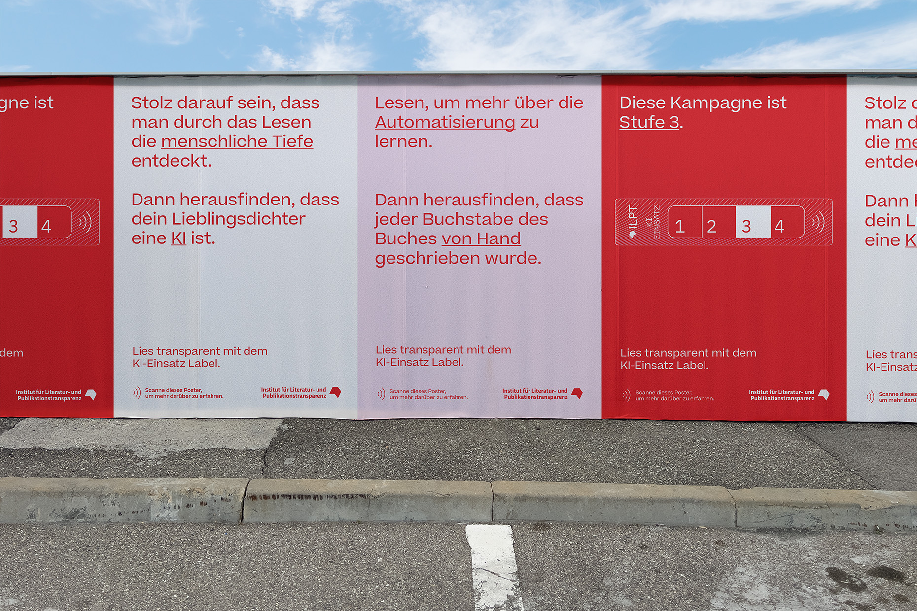Die erste Kampagne wird kurz vor der Einführung der KI-Labels geplant. Die Leser*innen sollen durch provokante Fragen aufmerksam gemacht werden, die das Konsumieren von Inhalten mit dem Konsumieren von Lebensmitteln gleichstellen und Fragen aufwerfen. Der Slogan lautet: “Lies transparent mit dem Label”.