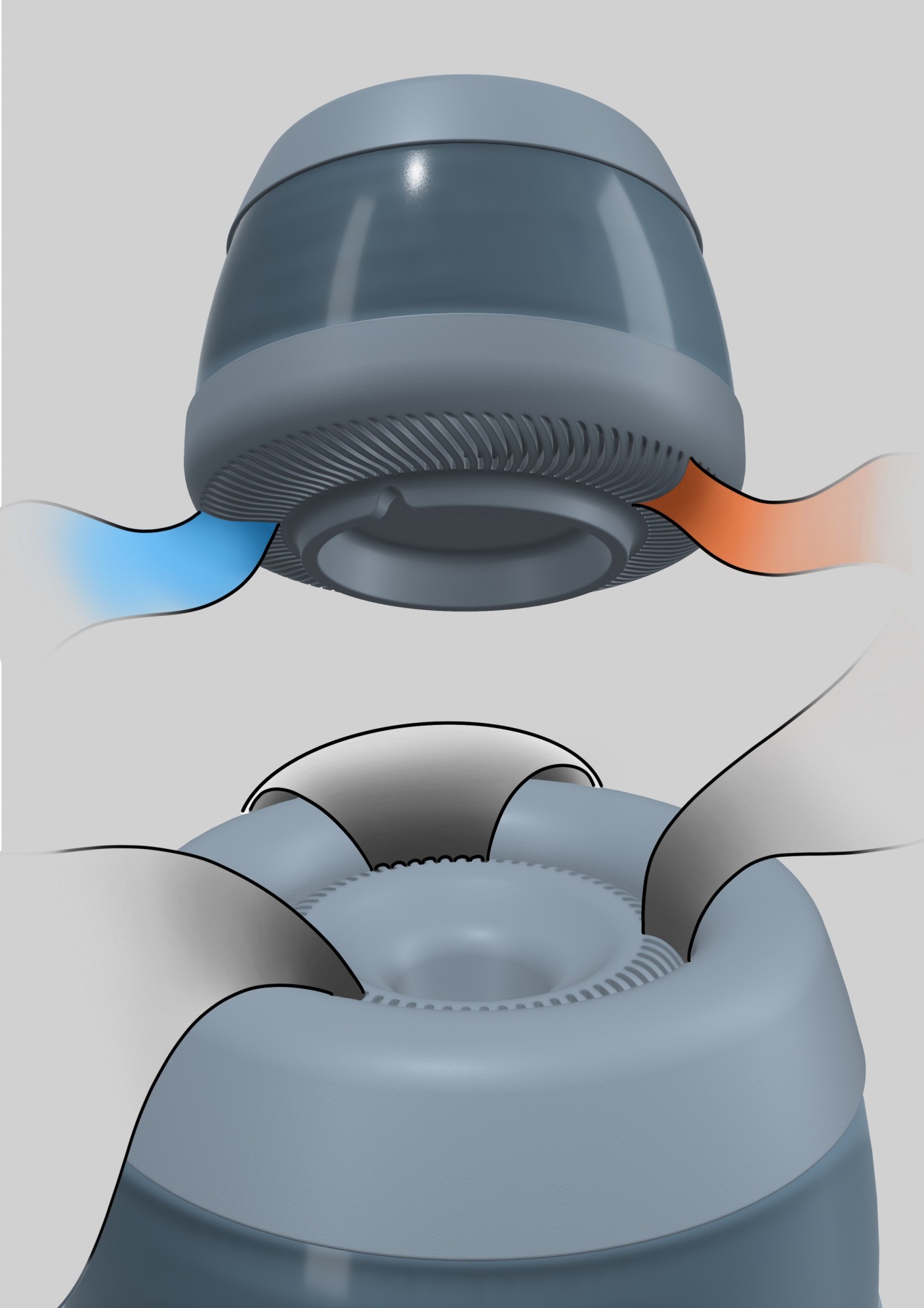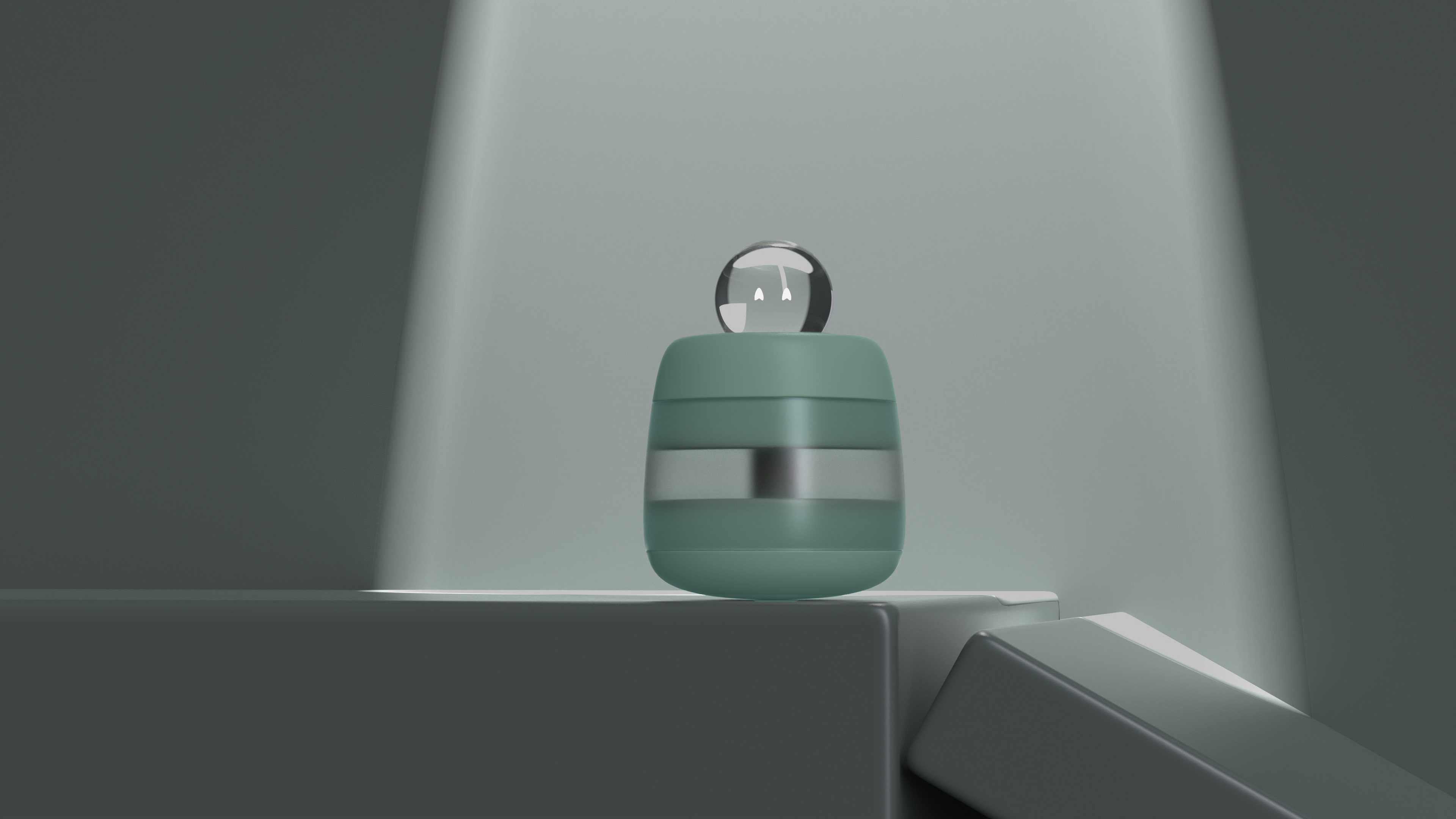 Die Kugel kann aus der Schale oder dem Hub herausgenommen werden. Die Nutzer:innen sich mit der Kugel in der sich die KI befindet im Raum frei bewegen. Dabei dient die Kugel als "Handschmeichler" und direktem Bezugsobjekt.