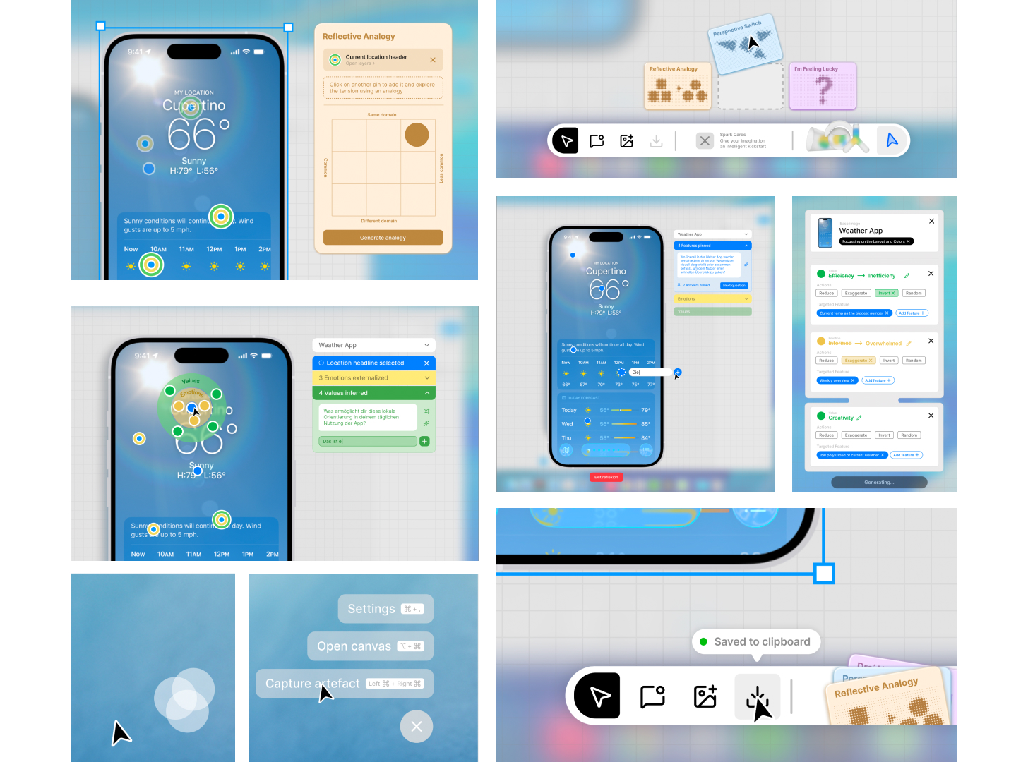 Mit diesen externalisierten individuellen Bedeutungen können daraufhin in Zusammenarbeit mit KI neue Varianten generiert und der Suchraum weiter erkundet werden. Kaleido hat es dabei nicht zum Ziel, ausgestaltete Ergebnisse zu liefern, sondern Raum für Experimente und Gedankenanstöße zu bieten, der in der zunehmend KI-gestützten Arbeit immer mehr verloren geht.